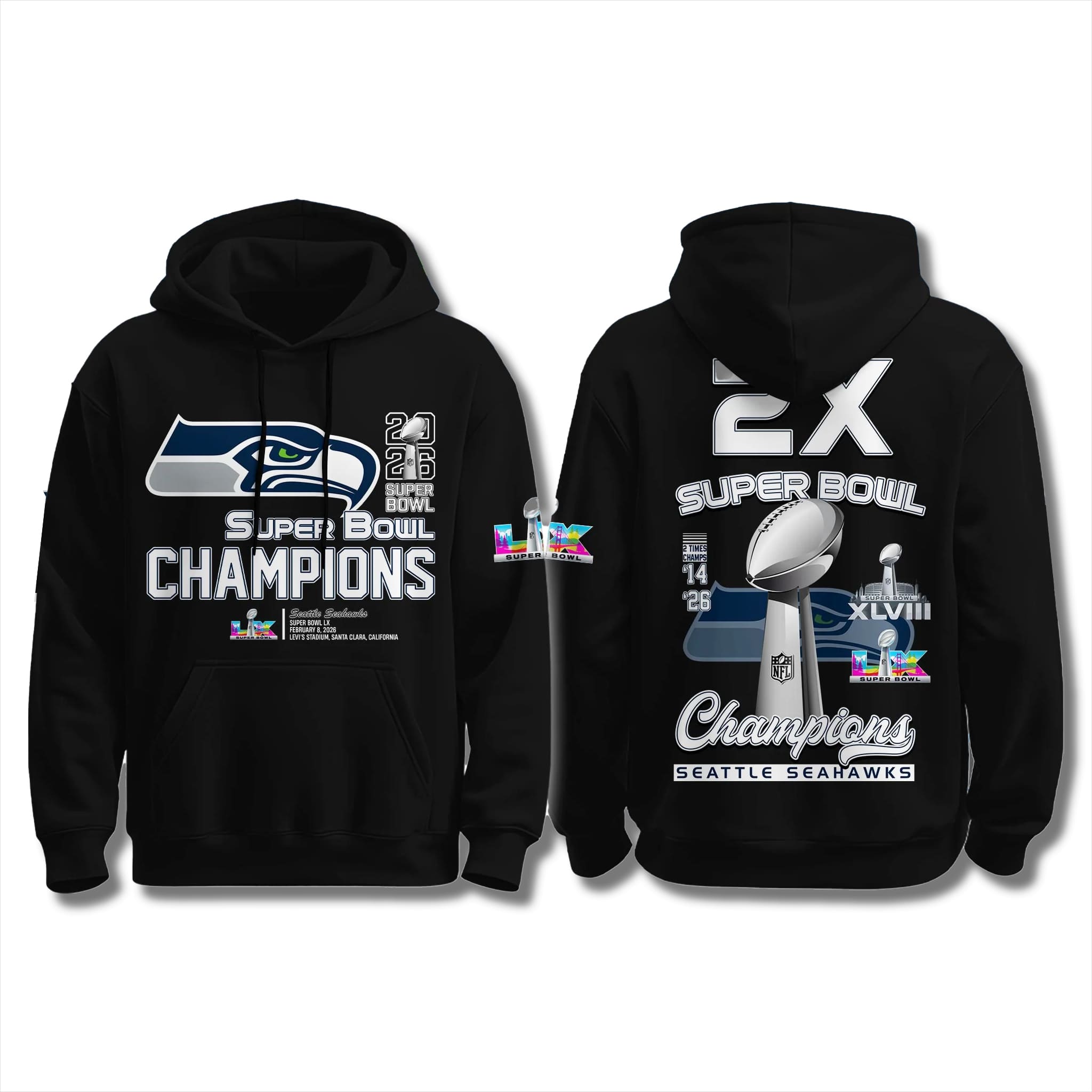 This hoodie features the Seahawks’ signature deep navy blue colorway, highlighted by a bold team logo, “2X Champions” details with two Lombardi Trophies (2014 & 2026), Super Bowl LX game information, and commemorative elements such as Levi’s Stadium – creating a warm, powerful, and pride-filled look.