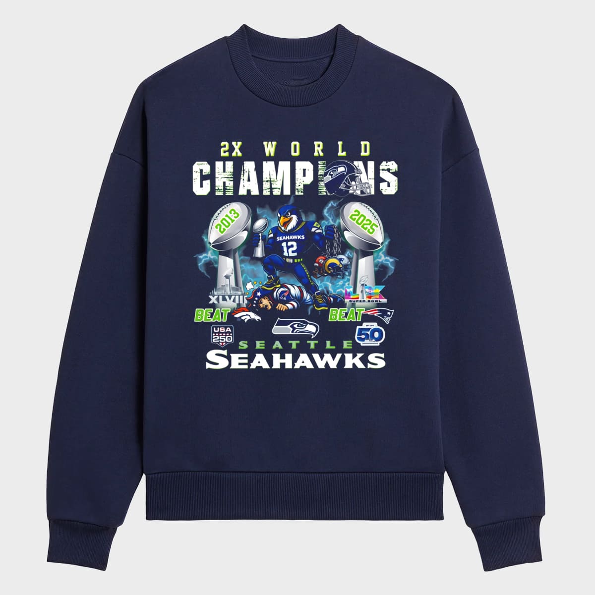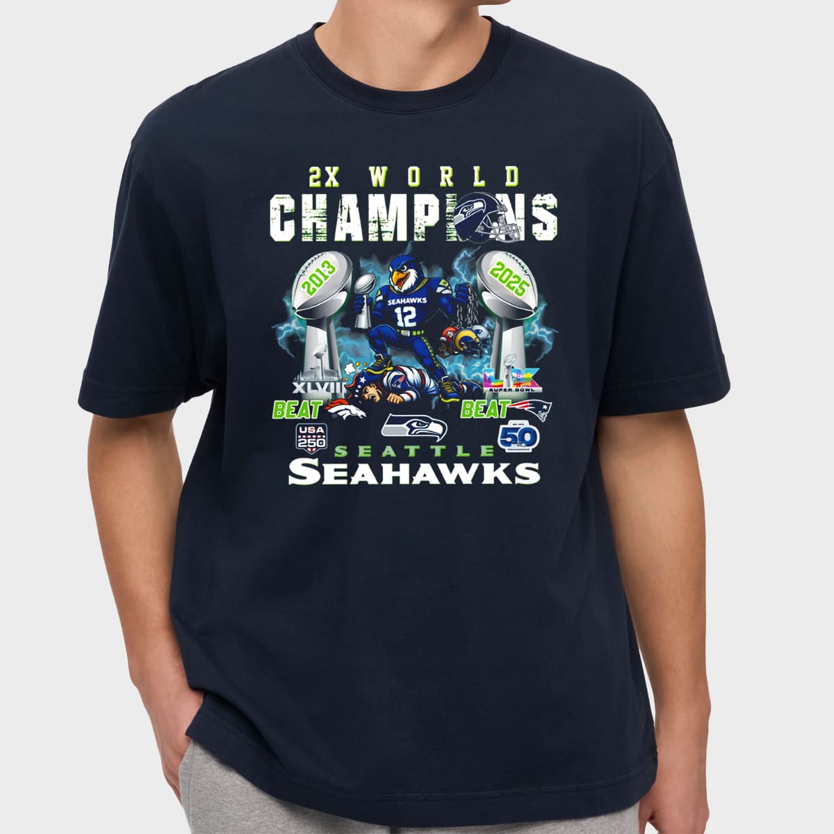 The victory over the NE Patriots in Super Bowl 2025 was not just a game – it was a declaration of a new empire rising in Seattle. The Seahawks Beats Patriots Super Bowl 2025 Shirt was created to commemorate the historic moment when the Pacific Northwest team truly became 2X World Champions. With a strong rivalry-inspired design, this is a must-have item for Seahawks fans who want to proudly wear it and remember the journey of defeating elite opponents on the road to glory.