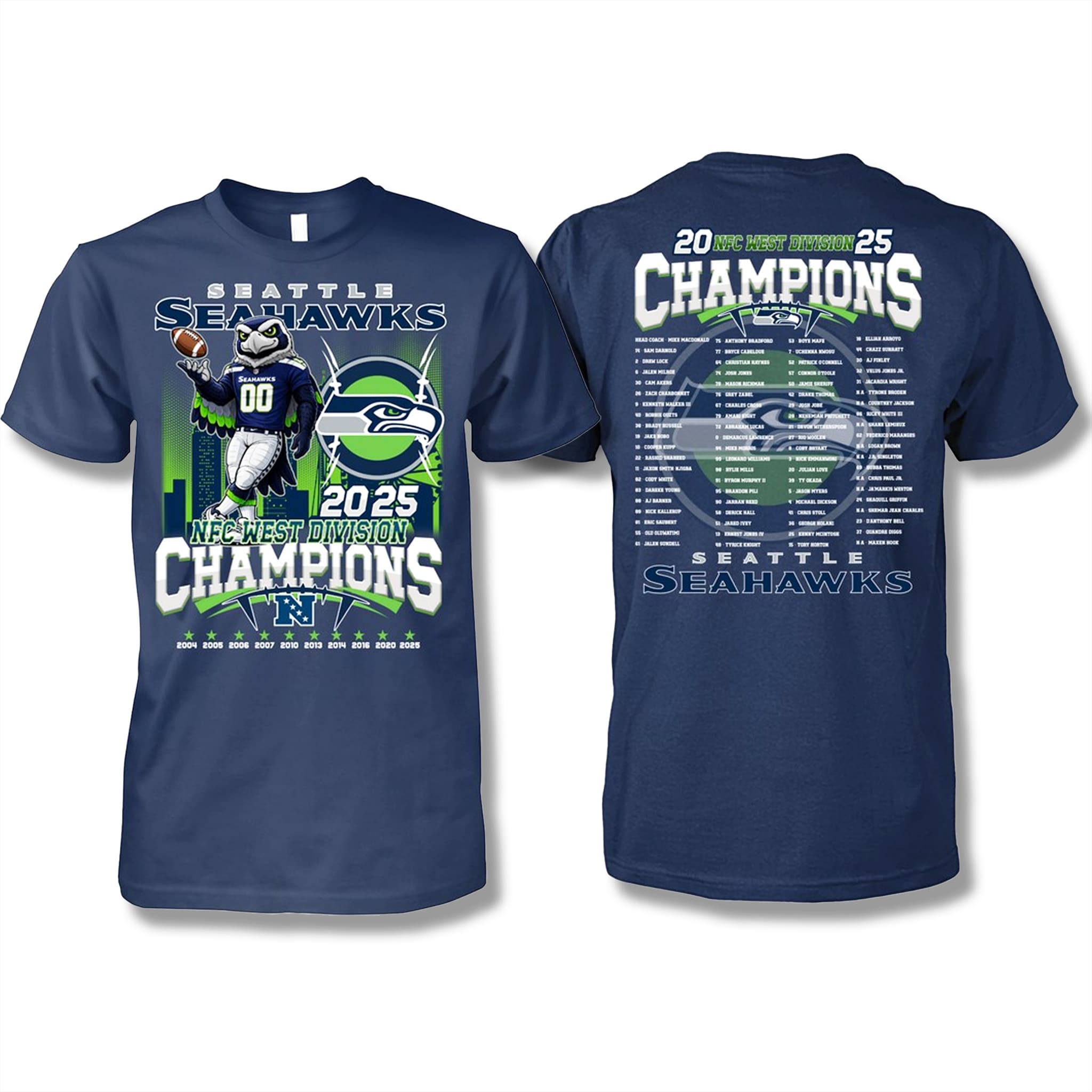 The pride-filled design features 10 stars on the front, each representing an NFC West championship. The back of the shirt highlights the heroes who defined the historic 2025 season, including Sam Darnold, Jaxon Smith-Njigba, and the dominant defense known as “The Dark Side,” led by head coach Mike Macdonald.