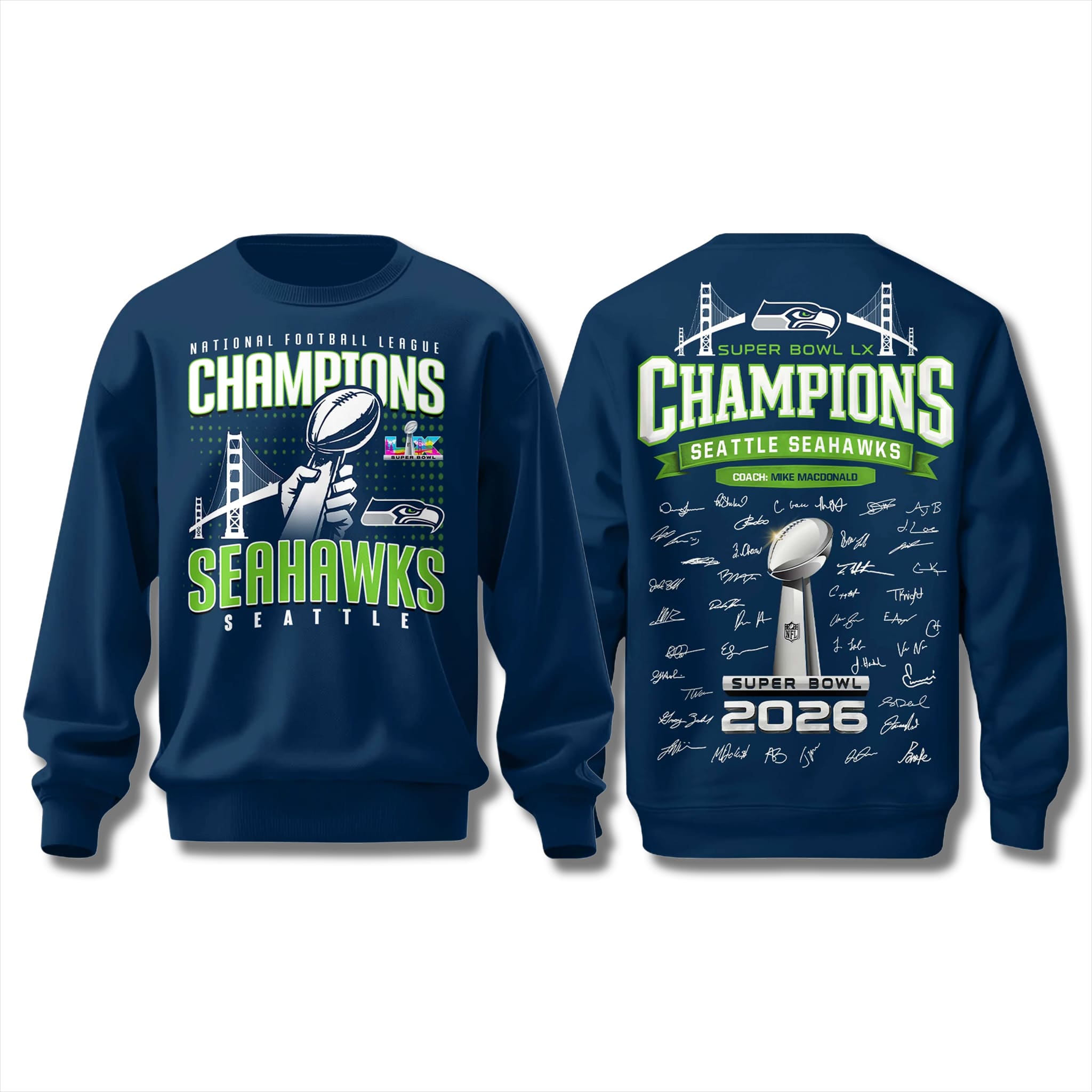 The sweatshirt features the iconic navy blue colorway, with the Golden Gate Bridge, Seahawks logo, football graphic, and Lombardi Trophy displayed prominently on the front. The back showcases full team signatures, along with Super Bowl LX 2026 details and the name of Head Coach Mike Macdonald, creating a warm, proud, and highly collectible design.