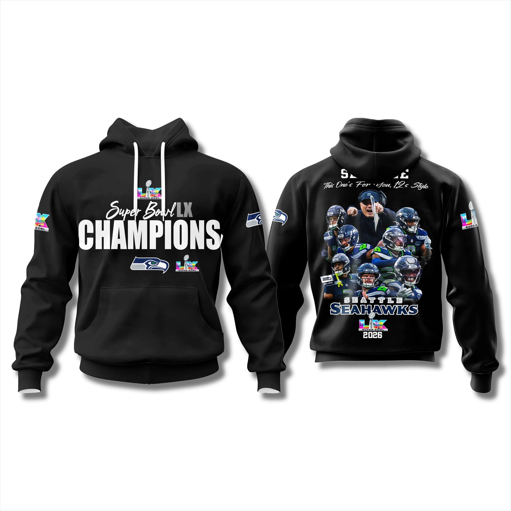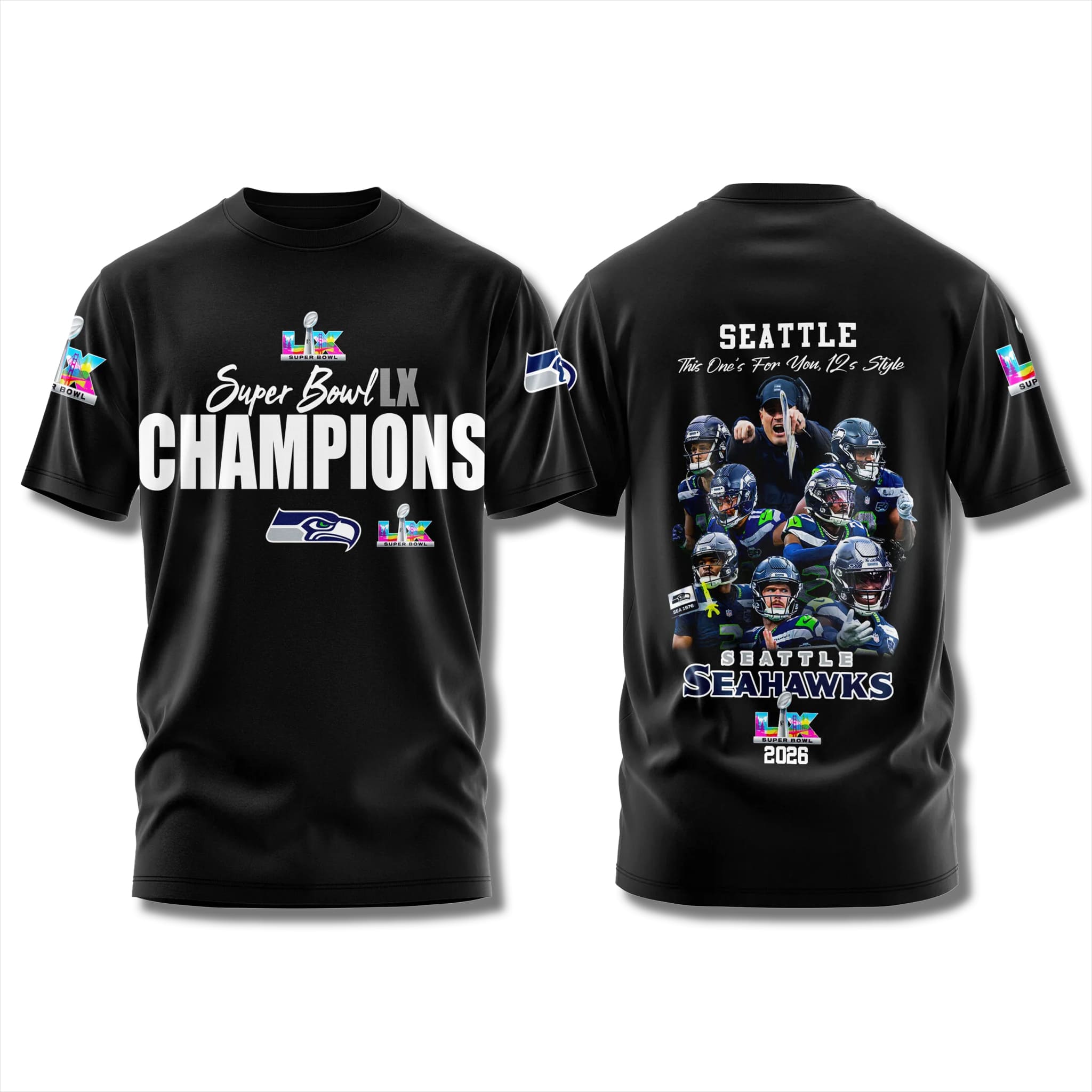 Featuring a sleek black colorway and a classic T-shirt silhouette, this design showcases vibrant full-color printing. The front highlights bold “Super Bowl LX Champions” lettering alongside the team logo and the Lombardi Trophy. On the back, a powerful player collage, head coach Mike Macdonald in command, and the message “This One’s For You, 12s Style” come together to create an emotional, proud, and deeply personal tribute.