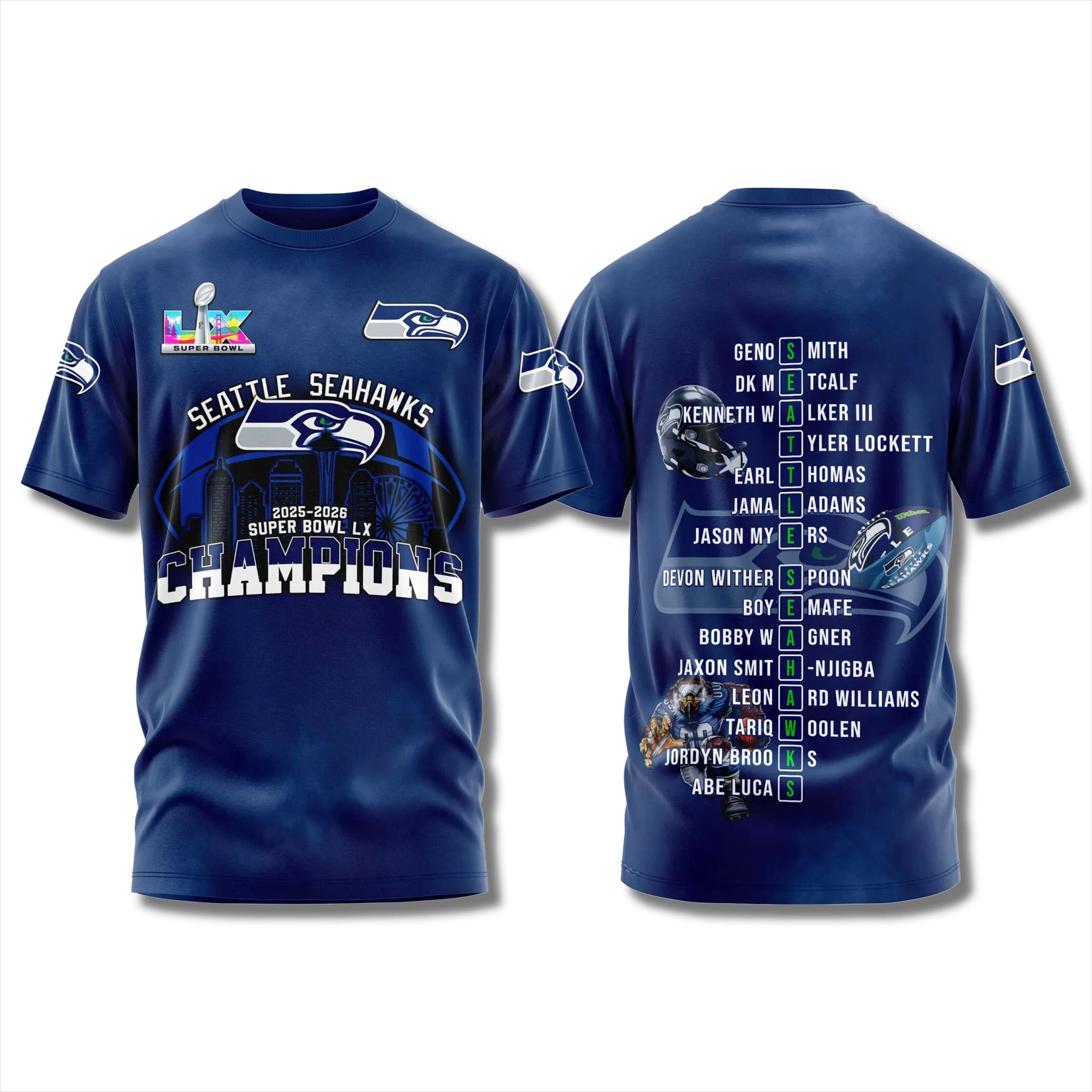 The Seahawks Super Bowl Champions Team Name Table Shirt is a bold and meaningful piece for fans who want to honor every star who helped bring Seattle Seahawks their second Super Bowl title. After major changes in the 2025 offseason – including the departures of Geno Smith, DK Metcalf, and Tyler Lockett to build a new core – the Seahawks under head coach Mike Macdonald achieved the impossible with a 29–13 victory over the NE Patriots on February 8, 2026, at Levi’s Stadium.