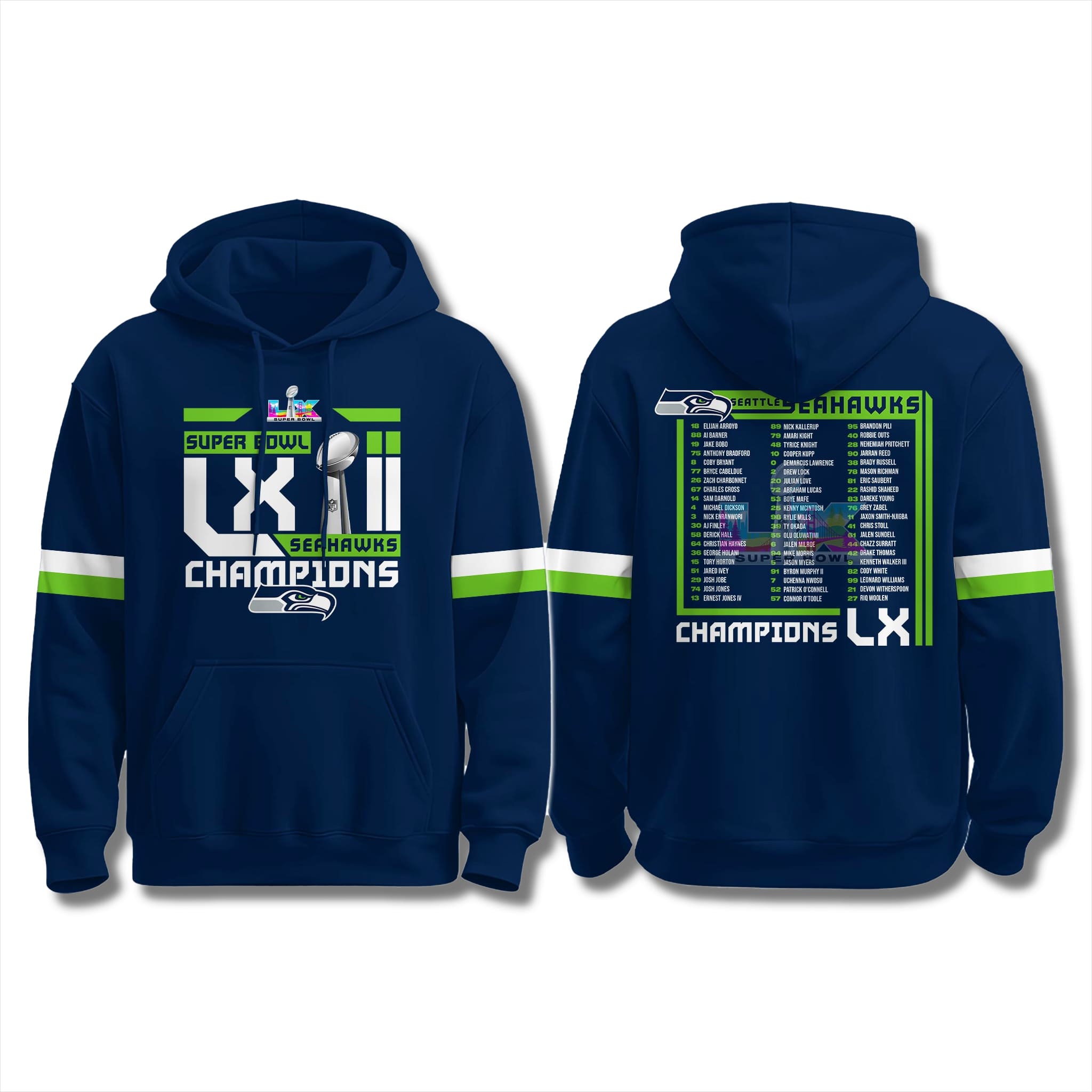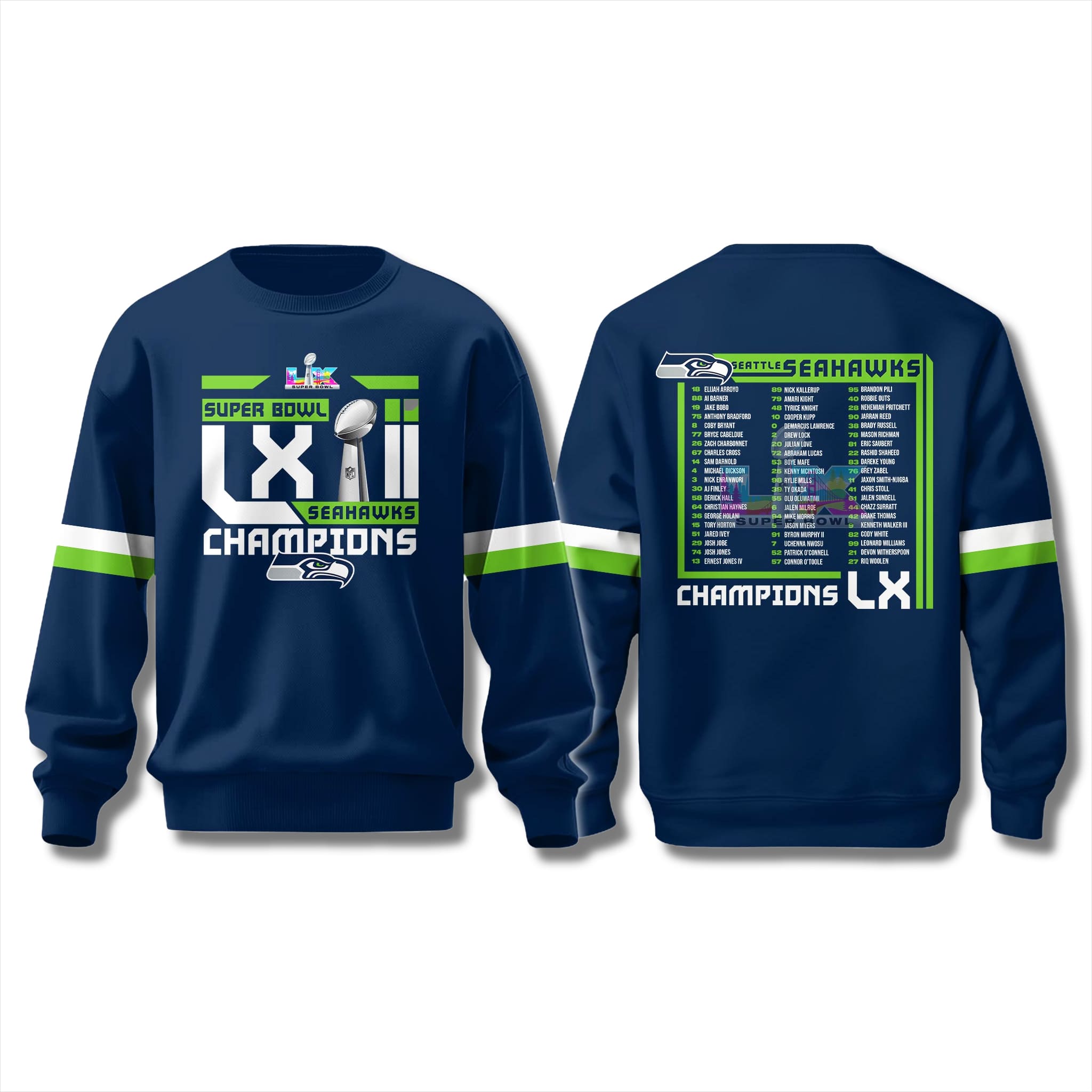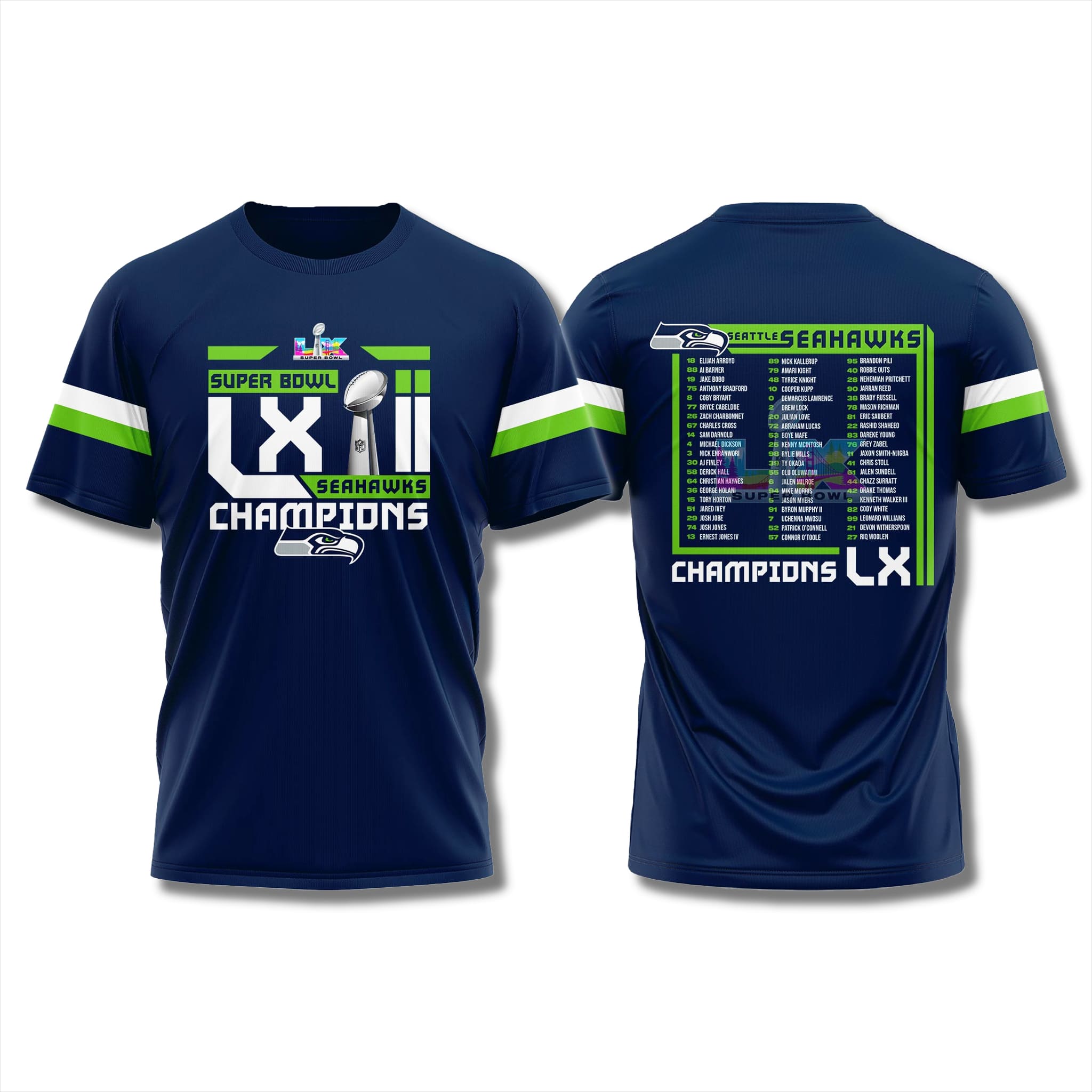 The Seahawks Super Bowl LX Champions Team Roster Shirt is made for every loyal 12s fan who believed and stayed with the team until the very final second, capturing the unforgettable historic victory of 29-13 over the Patriots in Super Bowl LX on February 8, 2026, at Levi’s Stadium. This was the game where Seattle proved its true power: a defense that shut everything down, an offense that exploded in the biggest moments, and the spirit of “Finish the Job” shown through every single play.
