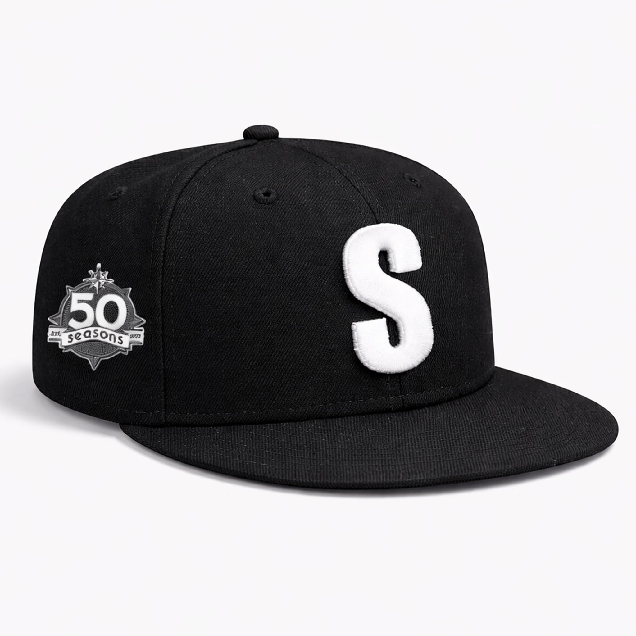 The cap features a bold black base with a large white embroidered “S” in raised 3D on the front, paired with a detailed silver star-shaped “50 Seasons” patch on the left side – symbolizing the franchise’s 50-year journey from 1977 to 2026. Made from high-quality cotton twill, it is durable, breathable, and comes with an adjustable snapback closure to fit all sizes comfortably.