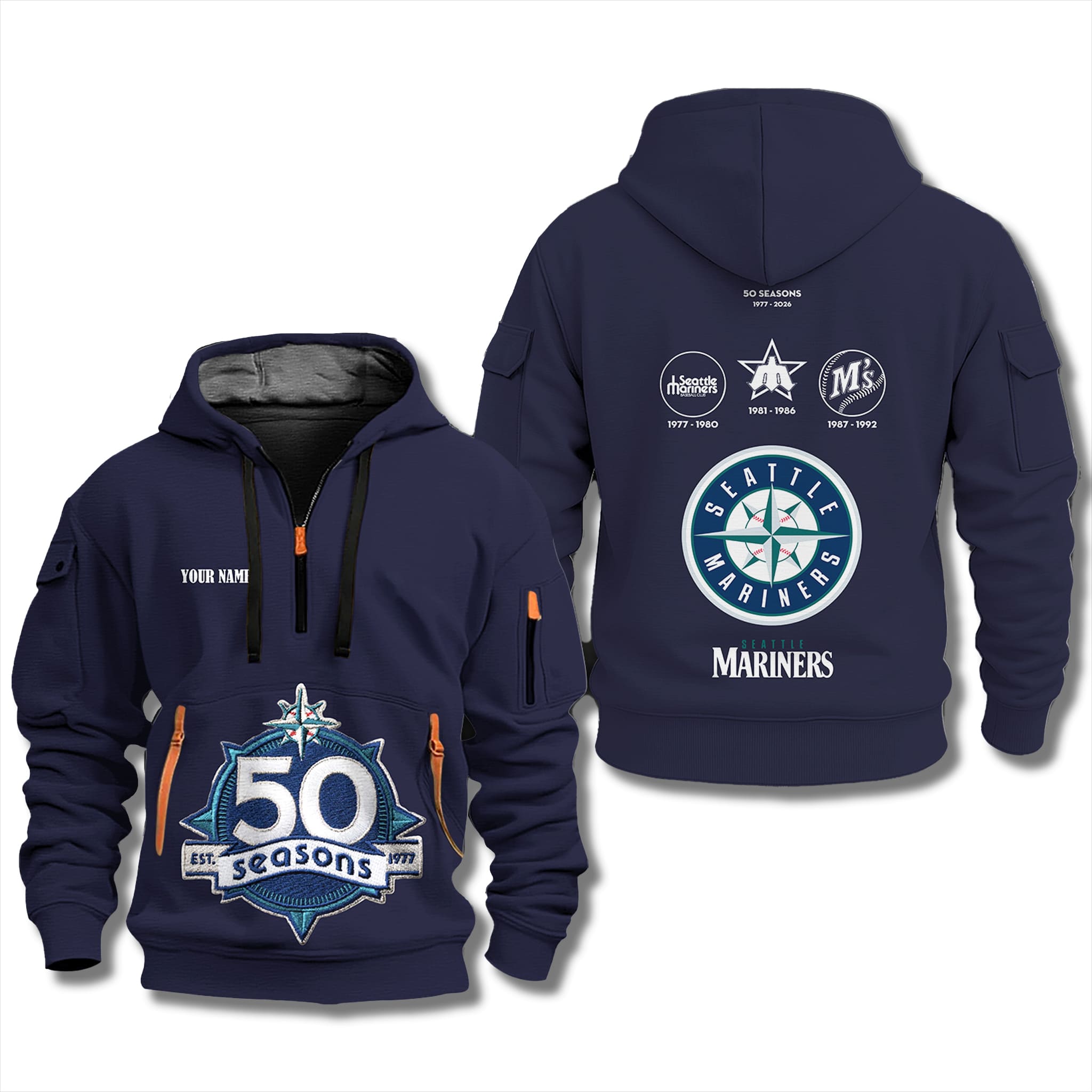 From the early days at the Kingdome in 1977 to the roaring cheers at today’s T-Mobile Park, the Seattle Mariners have built an emotional 50-year history. The Seattle Mariners 50th Seasons Quarter Zip Hoodie is not just a fashion item; it is a “mini museum,” a heroic chronicle woven from the pride of Pacific Northwest fans.