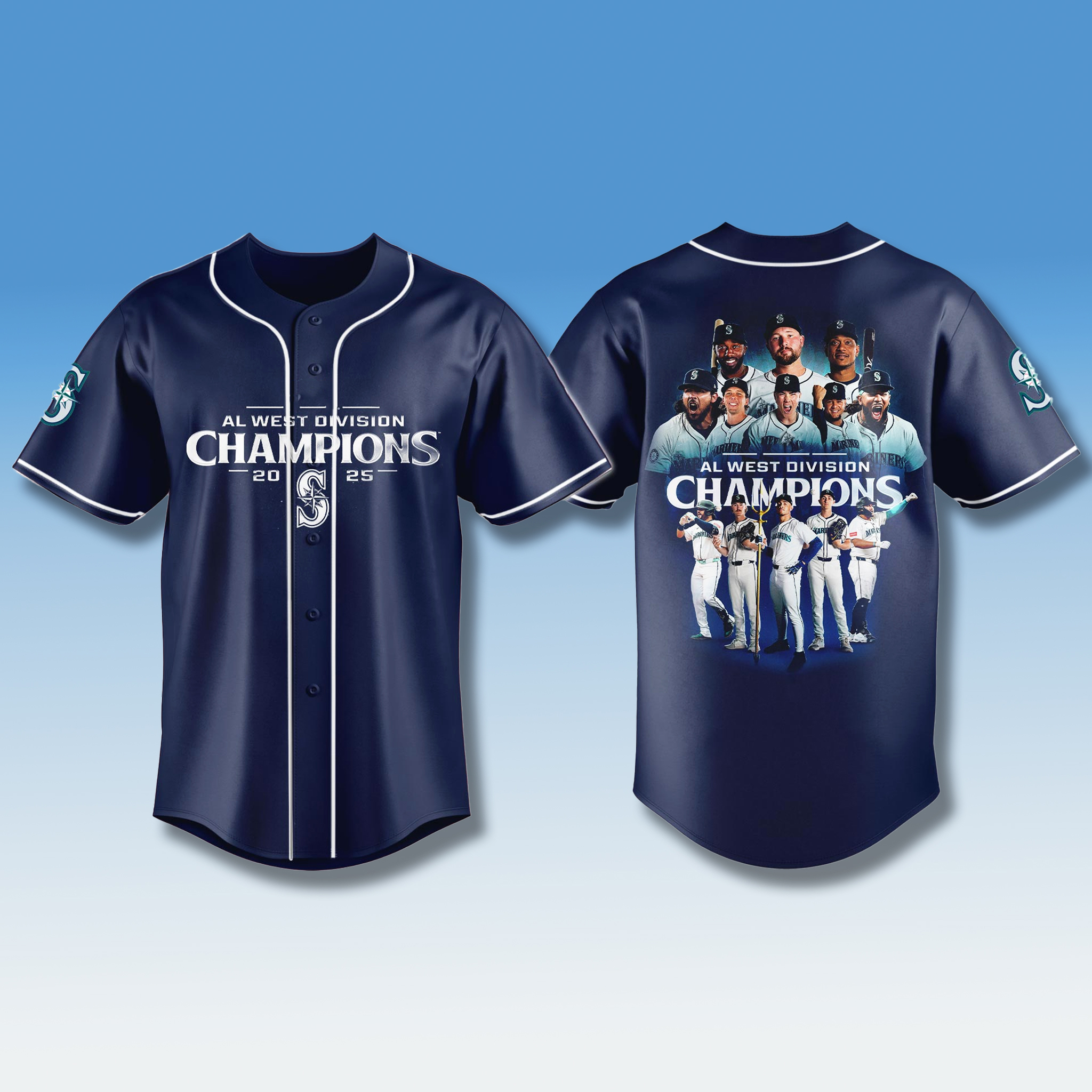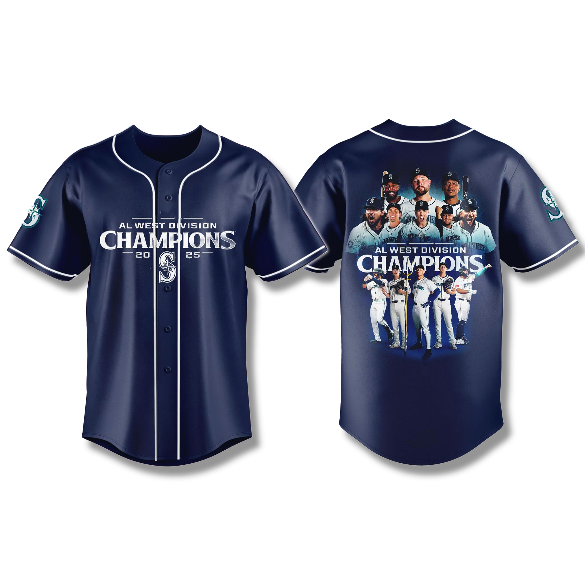 The front boldly proclaims “AL WEST DIVISION CHAMPIONS 2025” arched over the Mariners “S” emblem, evoking the thrill of banner-raising nights and divisional dominance. The back showcases a triumphant team portrait in victory poses, framed by “AL WEST DIVISION CHAMPIONS,” radiating the unity and joy of a squad finally claiming their crown.
