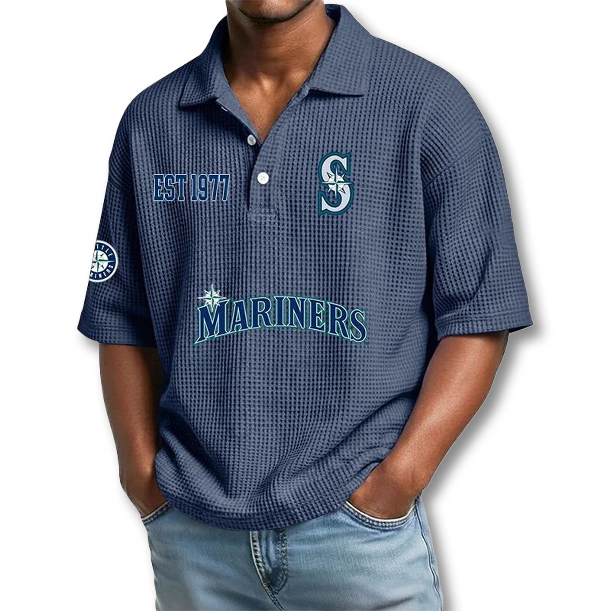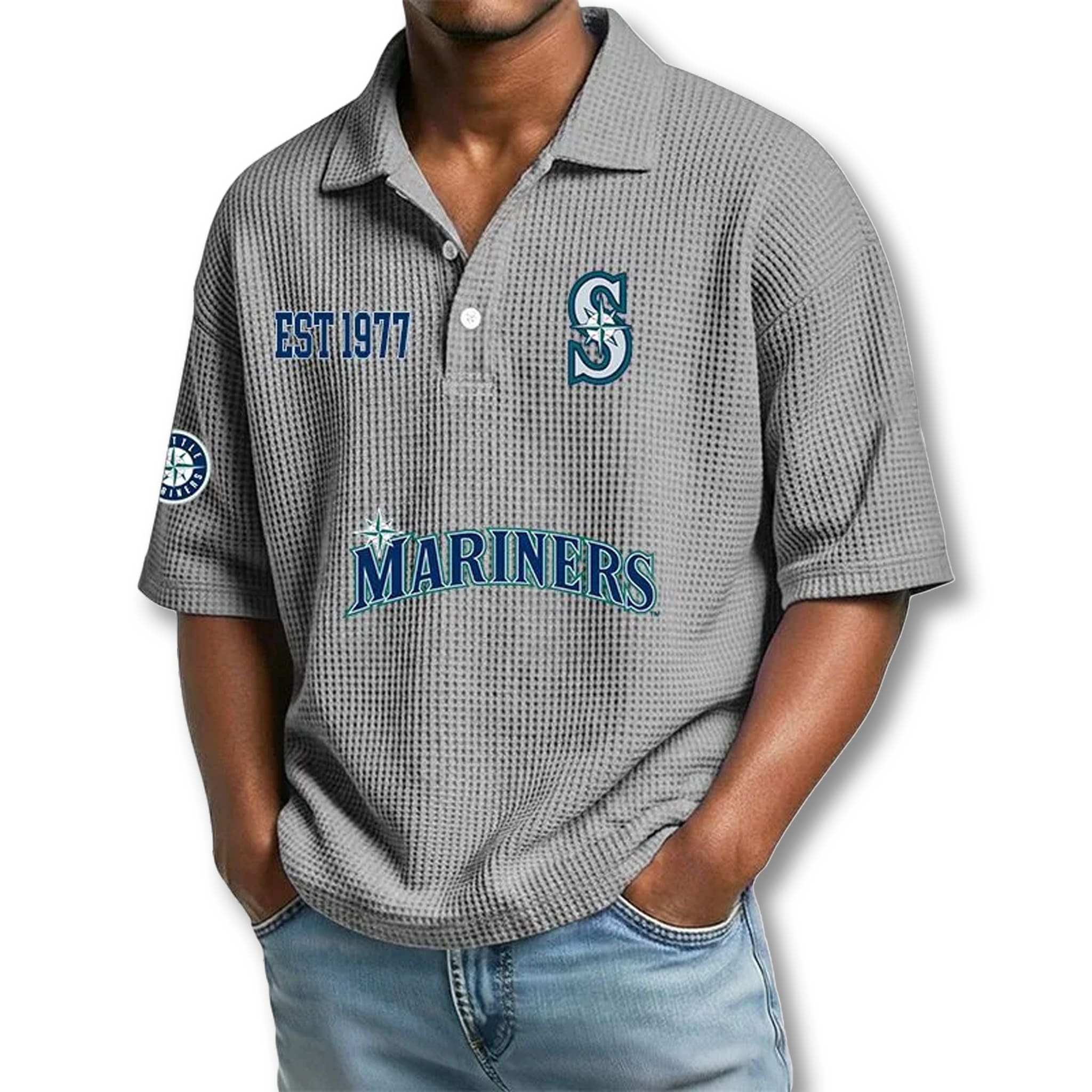 The Mariners EST 1977 Waffle Polo T-Shirt is made especially for baseball fans who love the Seattle Mariners. The “EST 1977” detail on the shirt is a reminder of the team’s historic journey, from its early days at the Kingdome to its home at T-Mobile Park today. This shirt is more than just apparel – it is a way to show your support for a team deeply connected to the sea and the spirit of navigation.