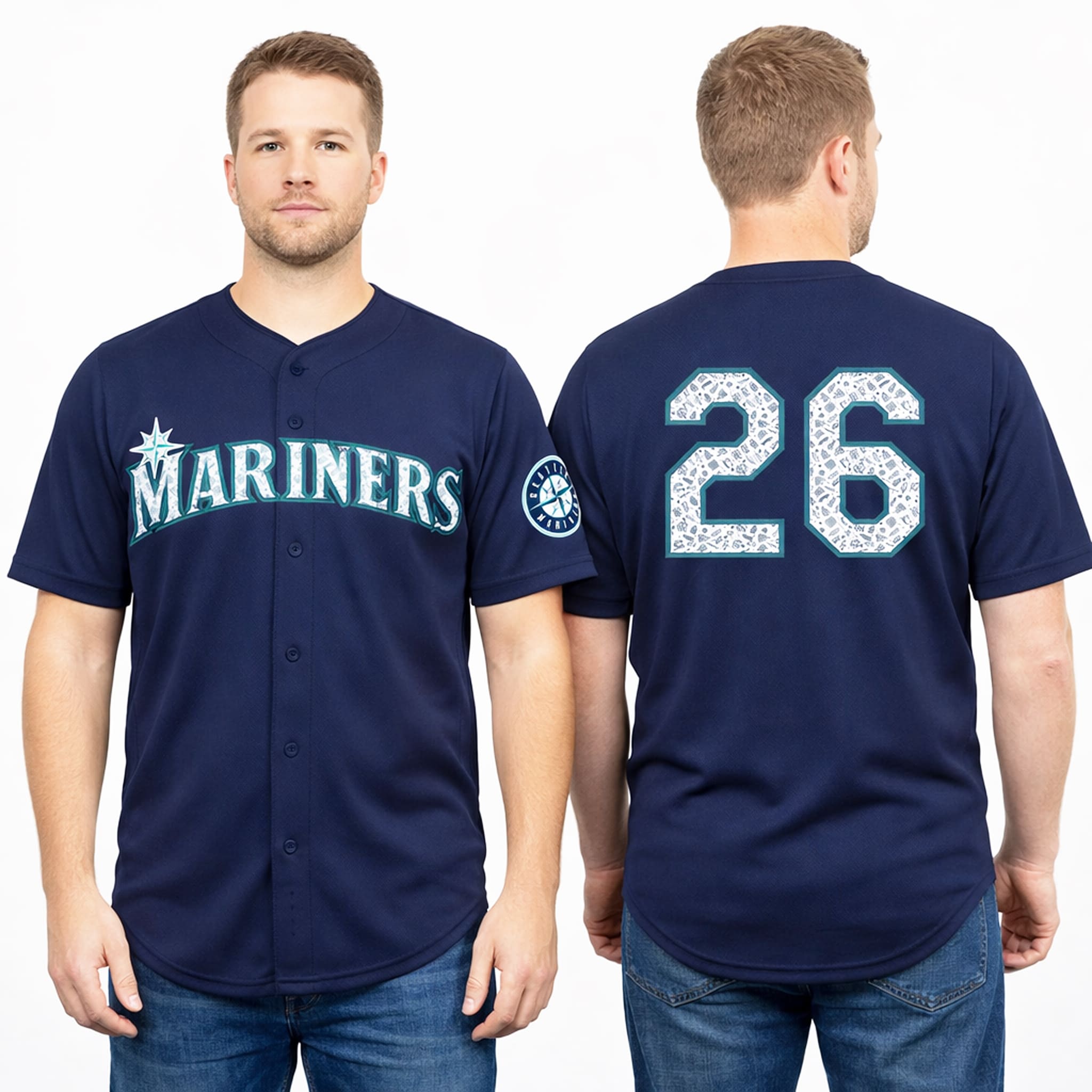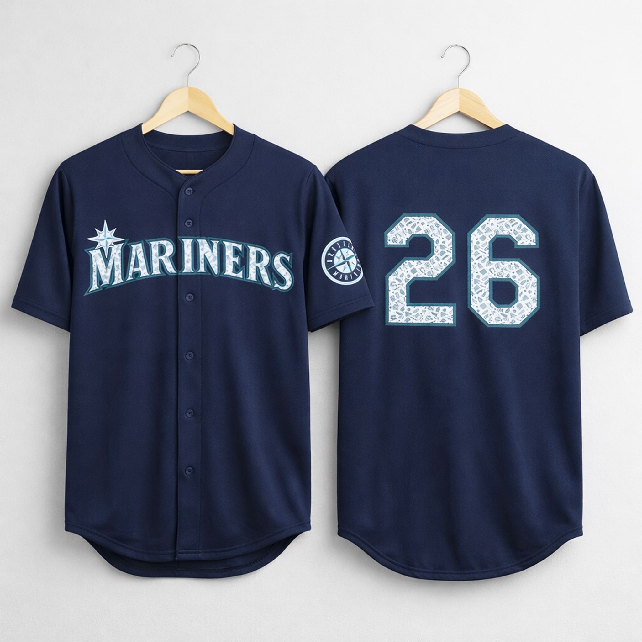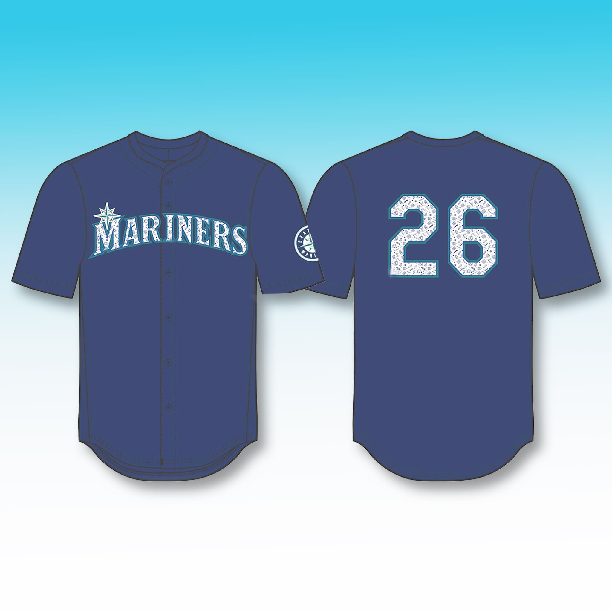 This jersey features the Mariners’ signature navy base, highlighted by the bright teal “MARINERS” lettering across the chest along with the familiar compass star logo. A Mariners patch is neatly embroidered on the sleeve. The number 26 designed on a white base filled with small education-themed icons such as books and pencils. Made from 95% Polyester and 5% Spandex, the fabric offers light stretch and breathability for all-day comfort. In addition, you can customize the number on the back to match your preference.