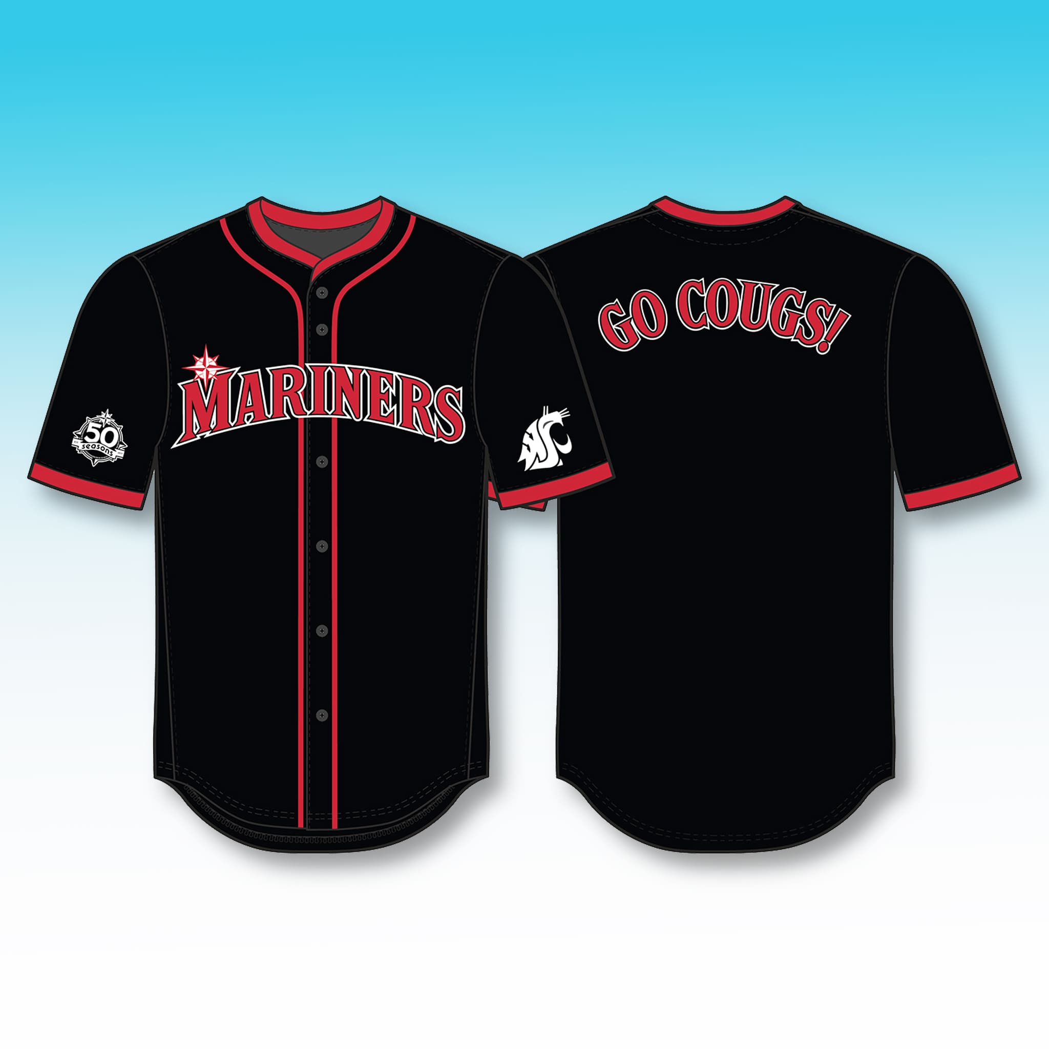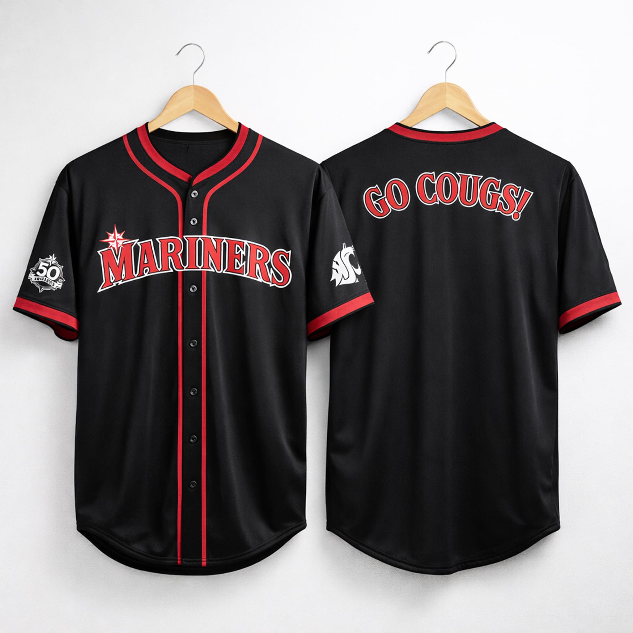 This jersey features a bold black base with red accents, with “MARINERS” in red outlined in white on the chest. The left sleeve is embroidered with the Washington State Cougars (WSU) logo. A standout feature on the back is the large “GO COUGS!” lettering in red with a white outline. Made of 95% Polyester + 5% Spandex, the jersey is lightweight, stretchy, and breathable, keeping you comfortable all day long.