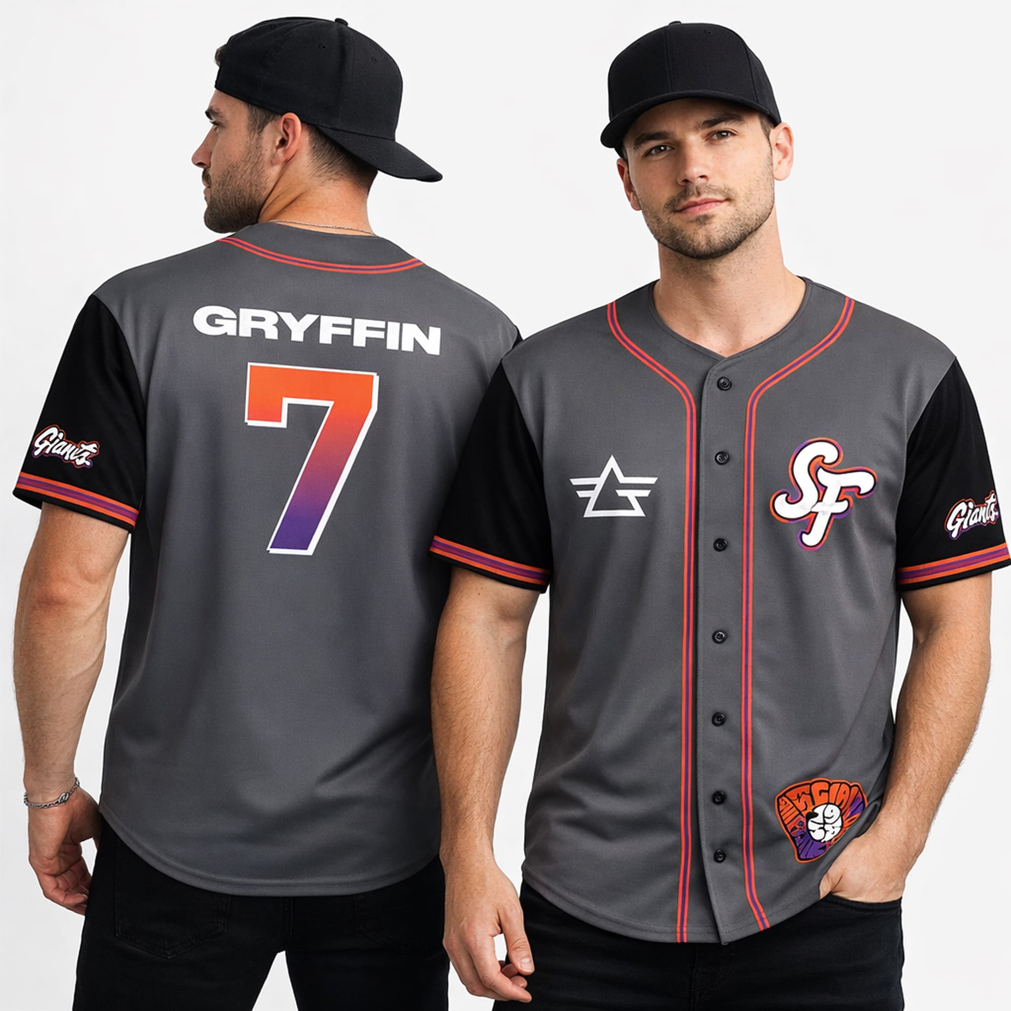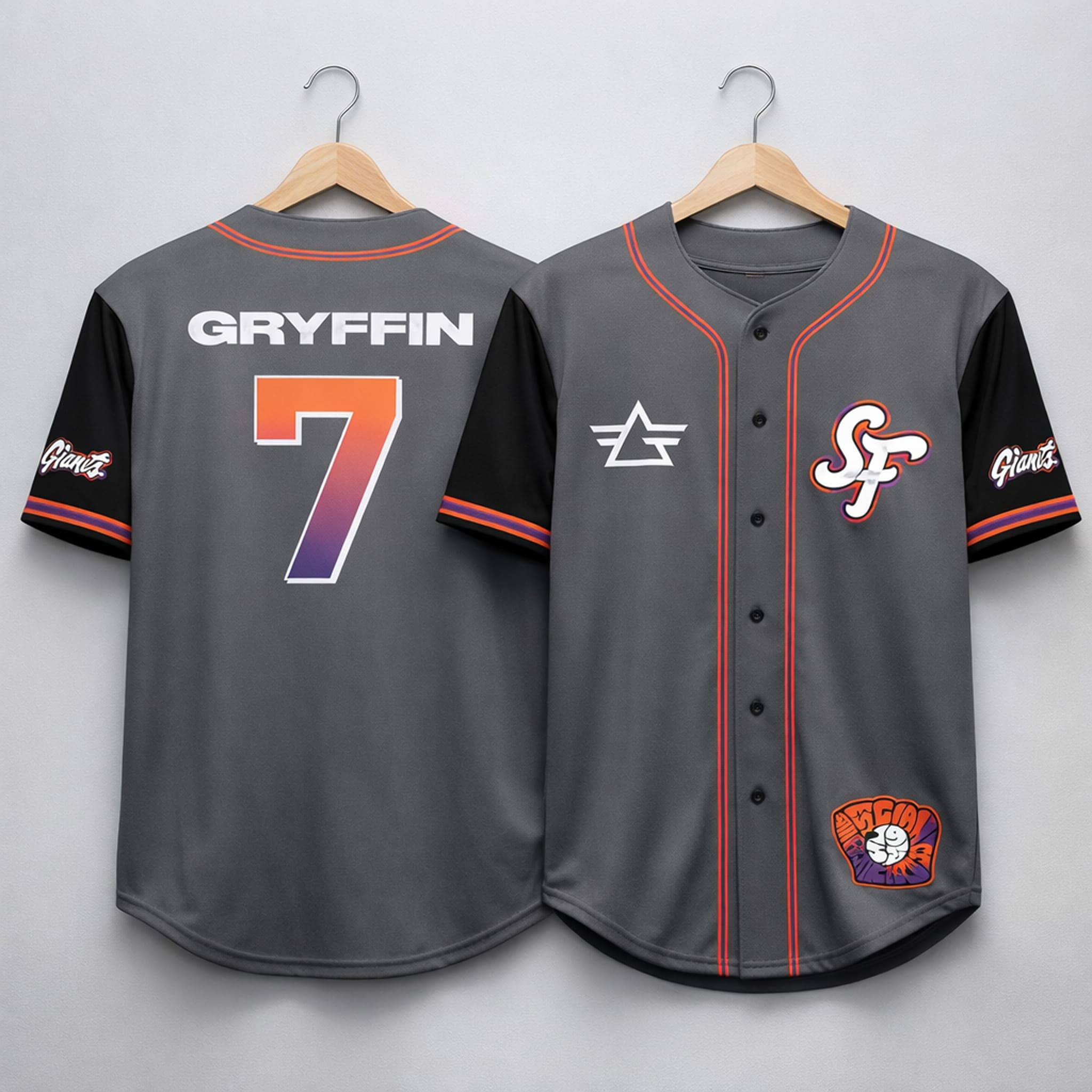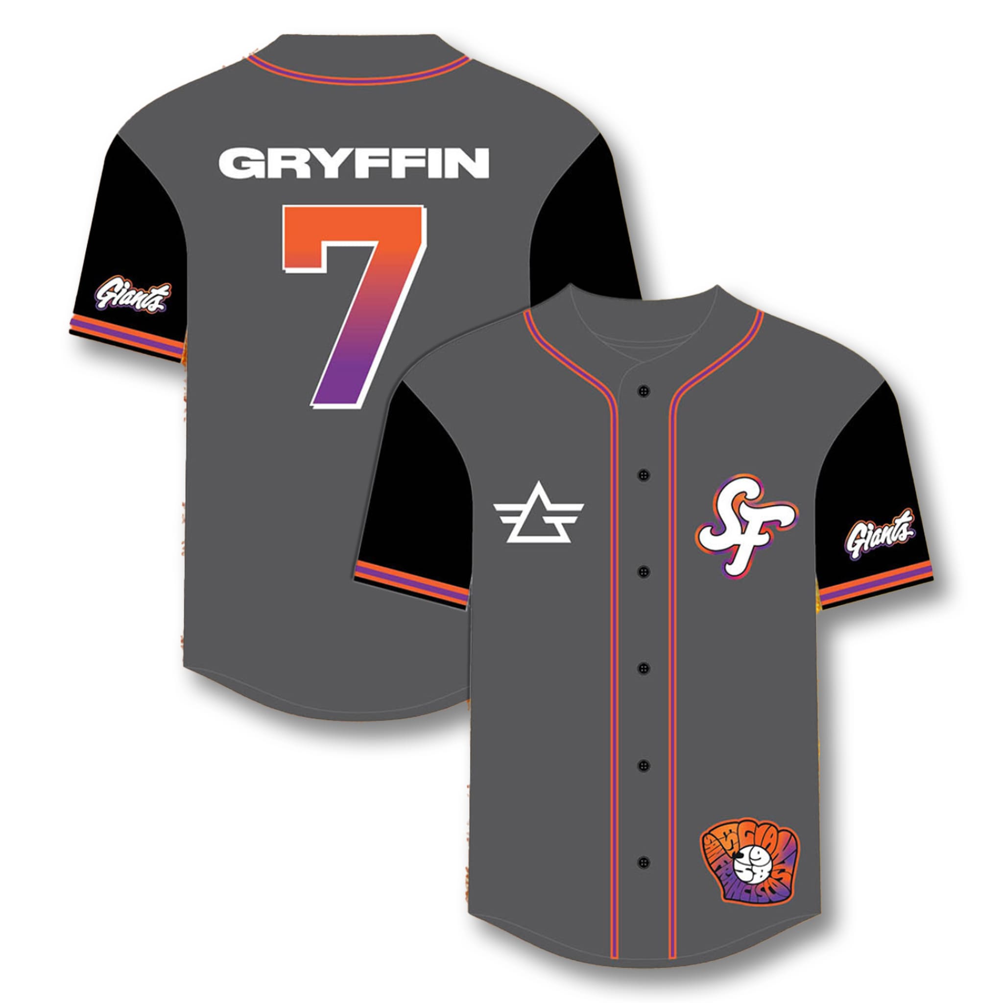 This jersey stands out with a sleek charcoal-gray base accented by neon pink and vibrant orange trim, creating a bold and energetic look. The design features the iconic “SF” logo inspired by San Francisco fog along with Gryffin’s signature triangular emblem.