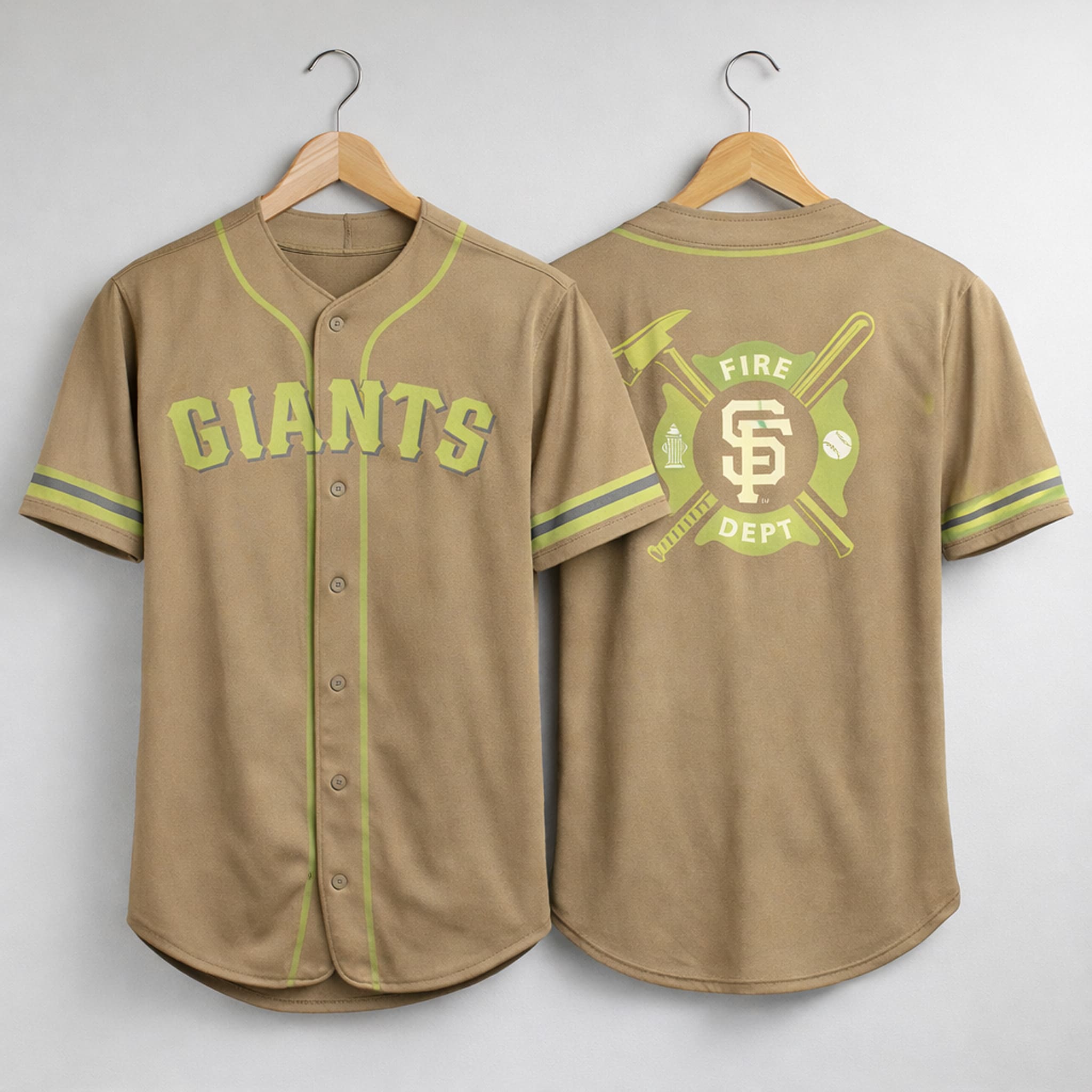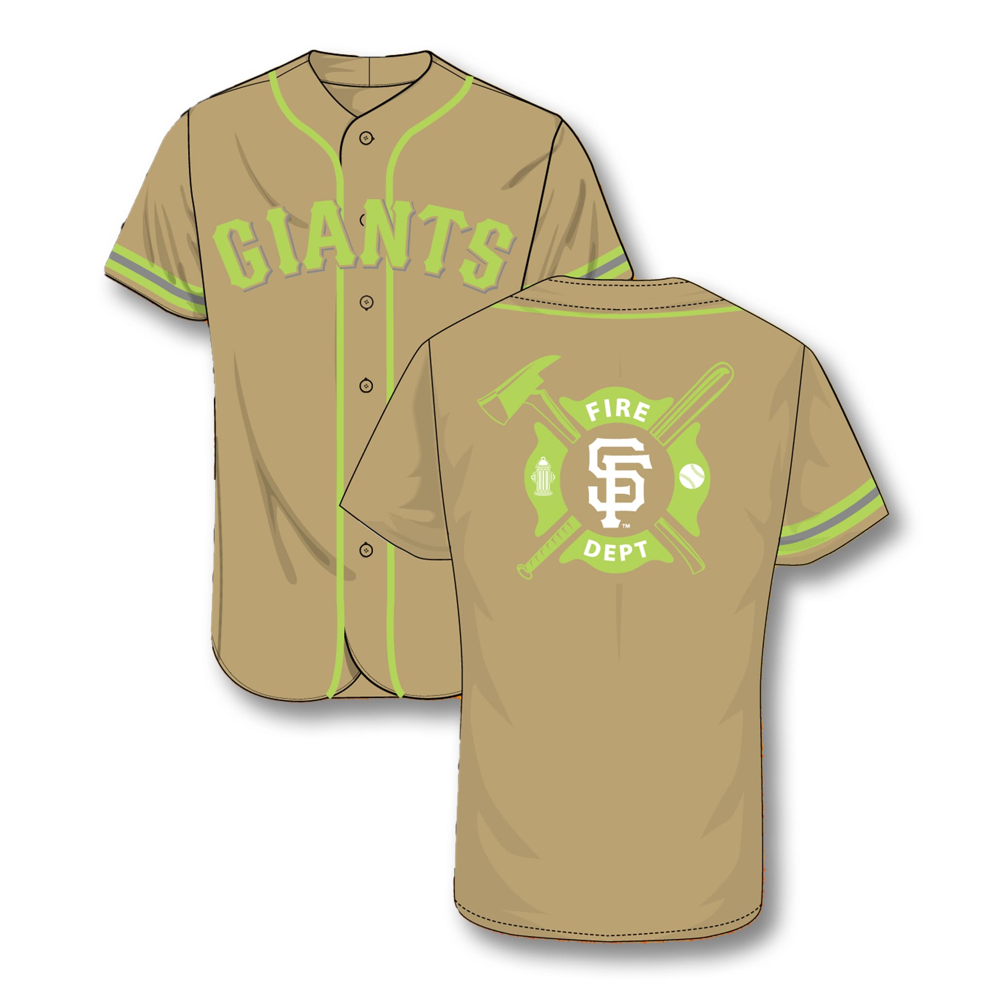 This special jersey stands out with a strong and dignified design, made from premium breathable material in a distinctive khaki color, accented with neon green and gray trim for a professional contrast. The front features large “GIANTS” lettering in neon green with a gray outline. On the back, the jersey displays a bold “FIRE DEPT” badge with a firefighter emblem and the SF logo, capturing the spirit of honor and service. The modern design makes it perfect for showing Giants pride and appreciation for firefighters anytime.