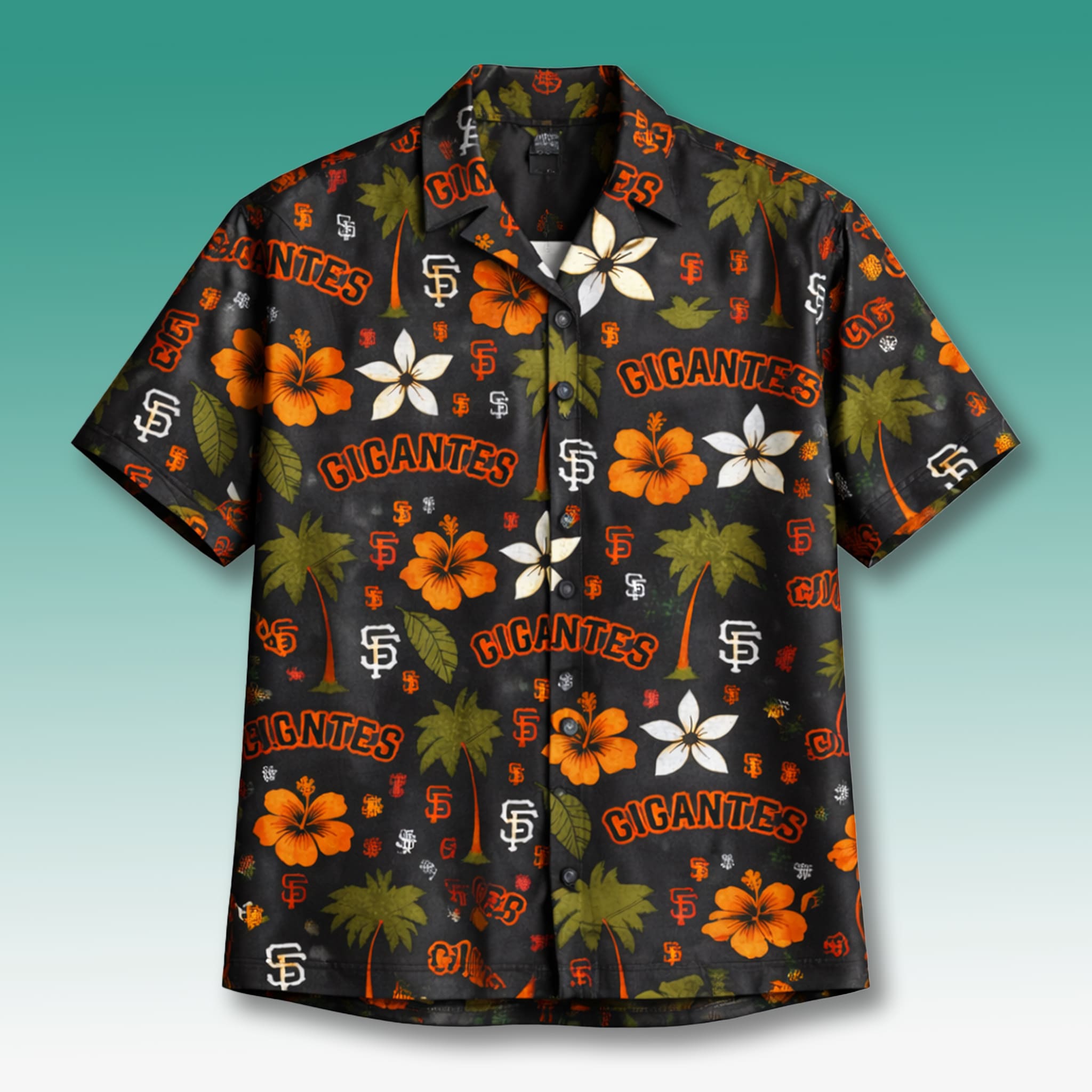 This shirt features a mysterious charcoal black base as the backdrop for a vibrant tropical world: deep green palm trees swaying, orange-yellow and white hibiscus flowers blooming, repeating SF logos in a lively rhythm – and above all, the bold orange-red “GIGANTES” text repeating across the shirt like the endless cheers from the stands. This is a shirt made to celebrate, to take pride in, to say: I am part of this community.