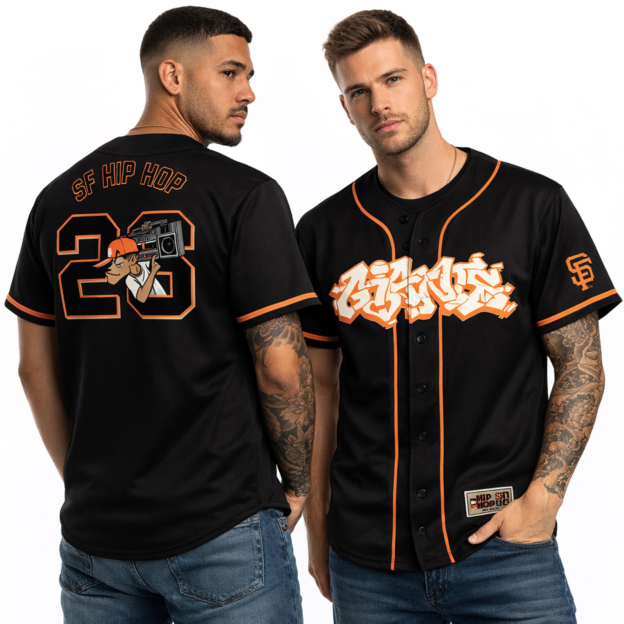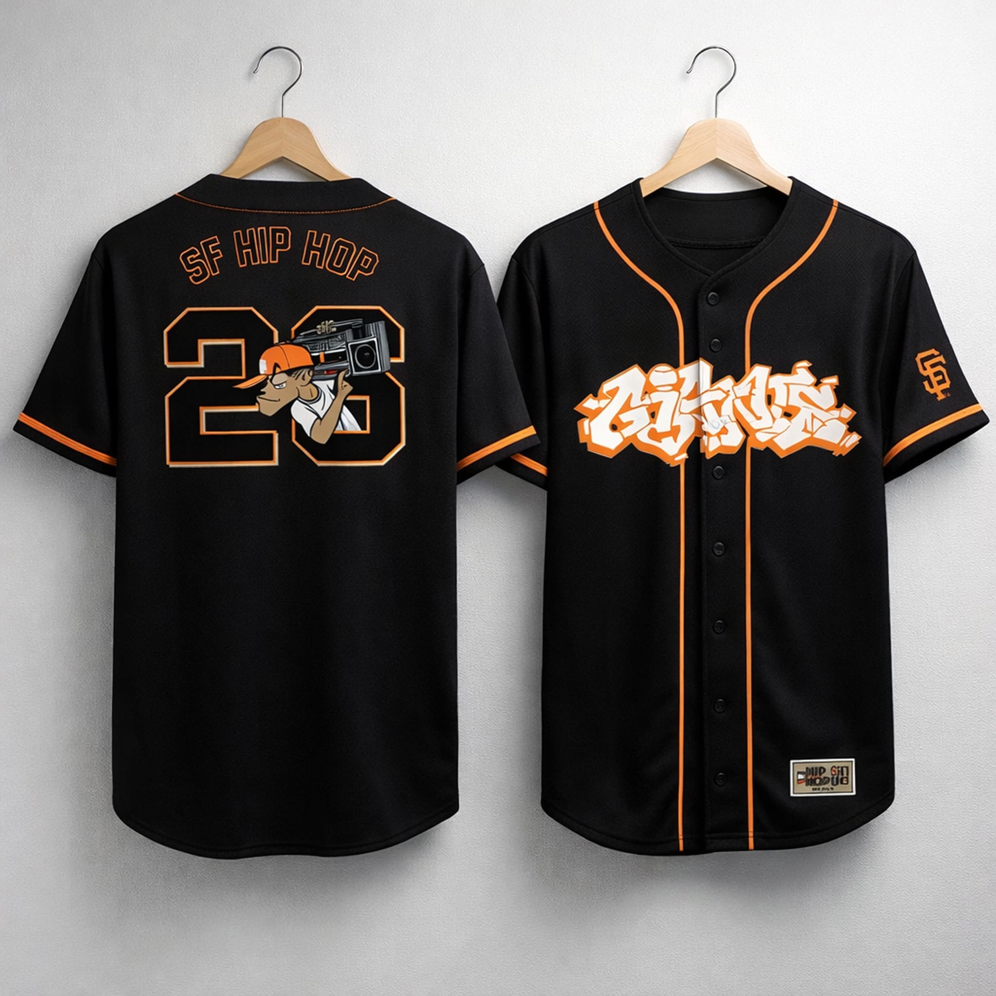 The jersey stands out with a modern hip hop streetwear-inspired design, made from premium breathable material in iconic black, accented with bright orange trim that creates a bold contrast. The front features a stylized “Giants” wordmark in a vibrant 3D graffiti-style font. On the back, the design includes a large number 26 along with the phrase “SF HIP HOP.” The result is a strong Bay Area hip hop fusion aesthetic, perfect for showing Giants pride and street culture anywhere – from the ballpark to street festivals.
