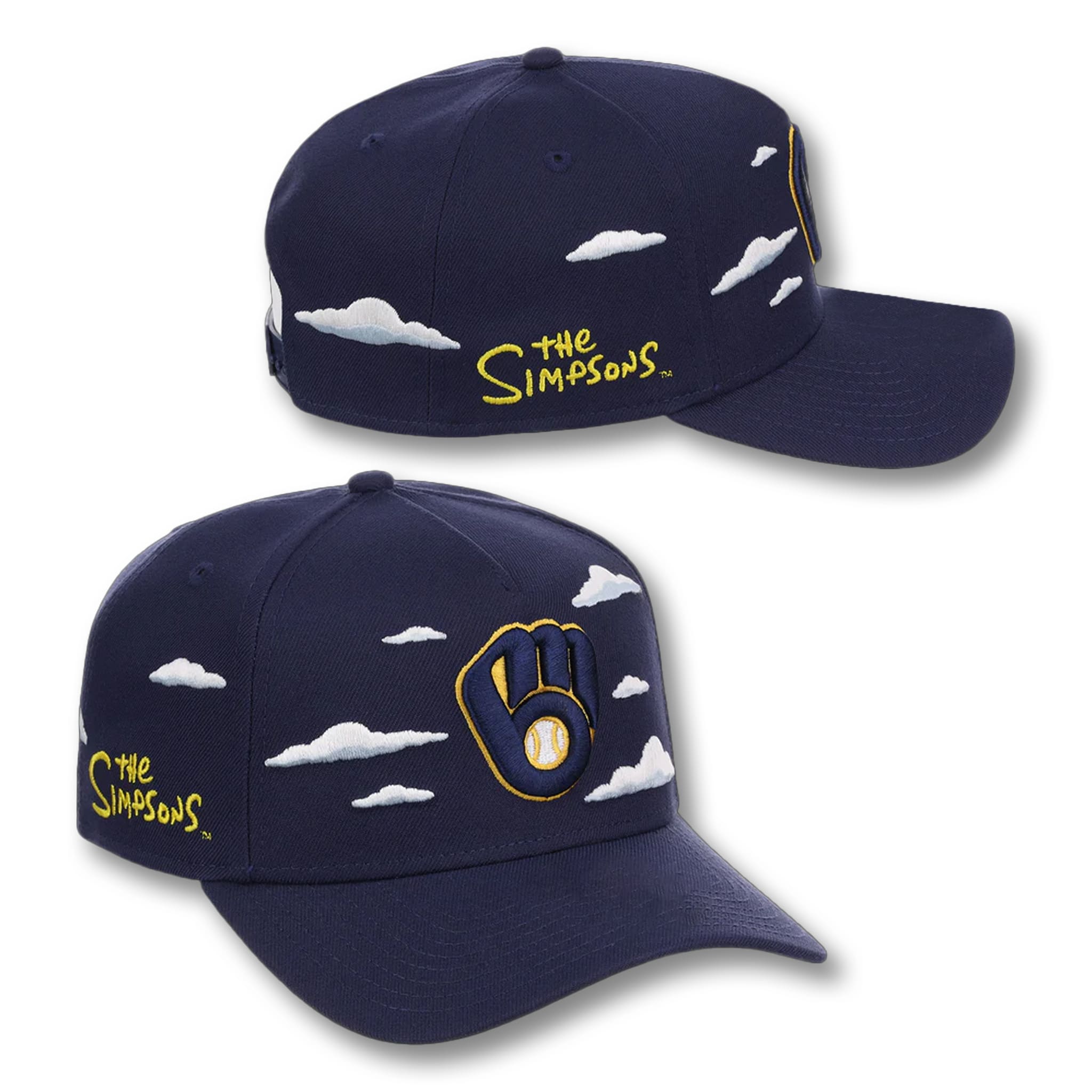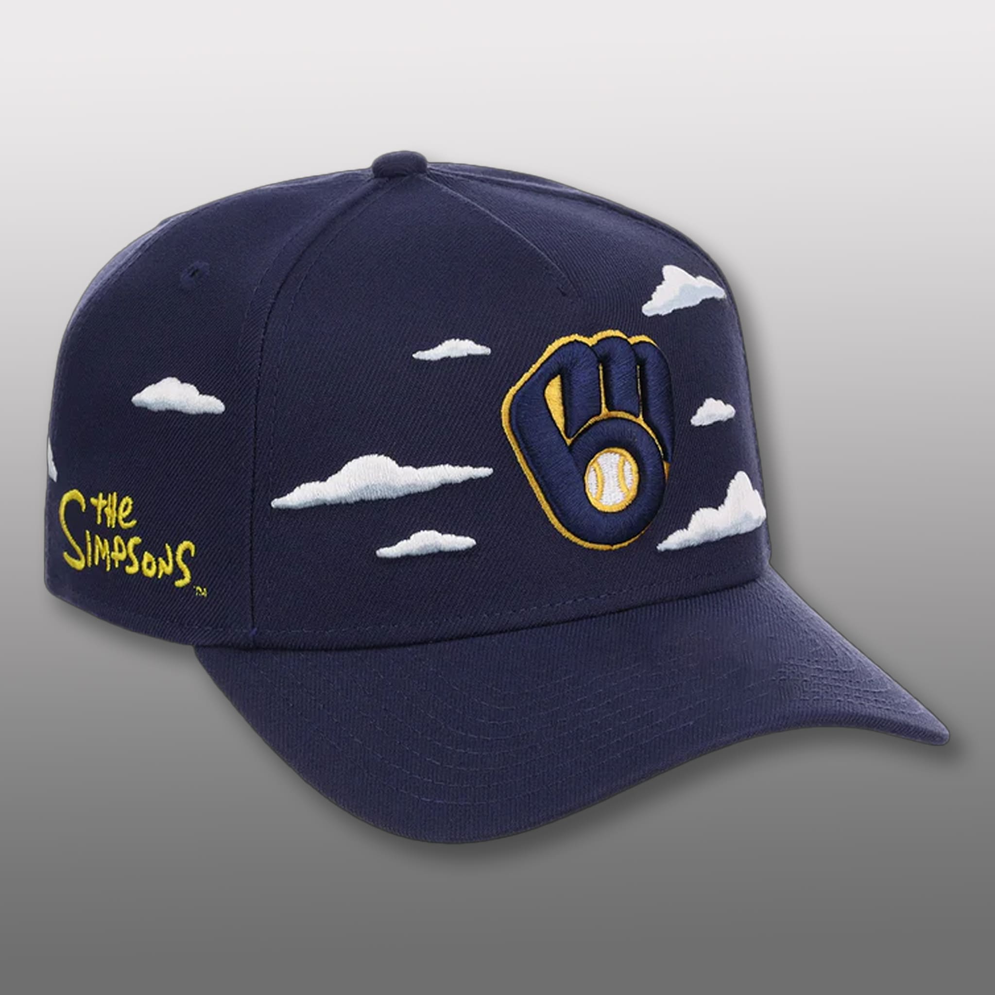 The Simpsons Brewers Clouds Hat brings the feeling of watching a summer game under the open sky above American Family Field. With a navy blue base reflecting the classic Brewers color palette, soft white clouds are embroidered across the hat in signature Springfield style. The iconic Brewers glove and baseball logo stands out at the center, while the bright yellow “The Simpsons” text runs along the side, tying the entire design together.