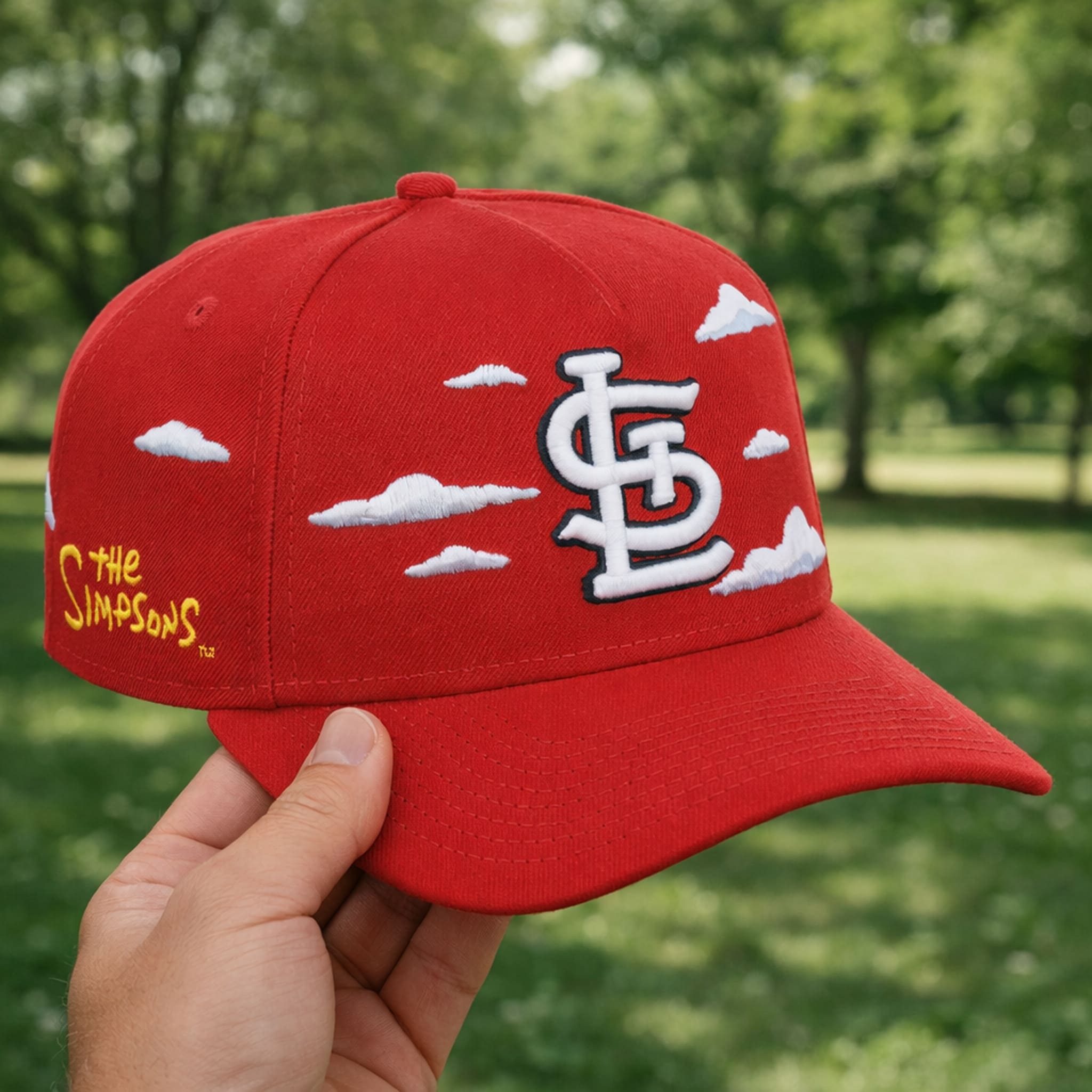 The Simpsons Cardinals Cloudy Hat brings the floating skies of Springfield over the bold red backdrop of the Cardinals, creating an unexpected connection between baseball and the colorful childhood world of The Simpsons.