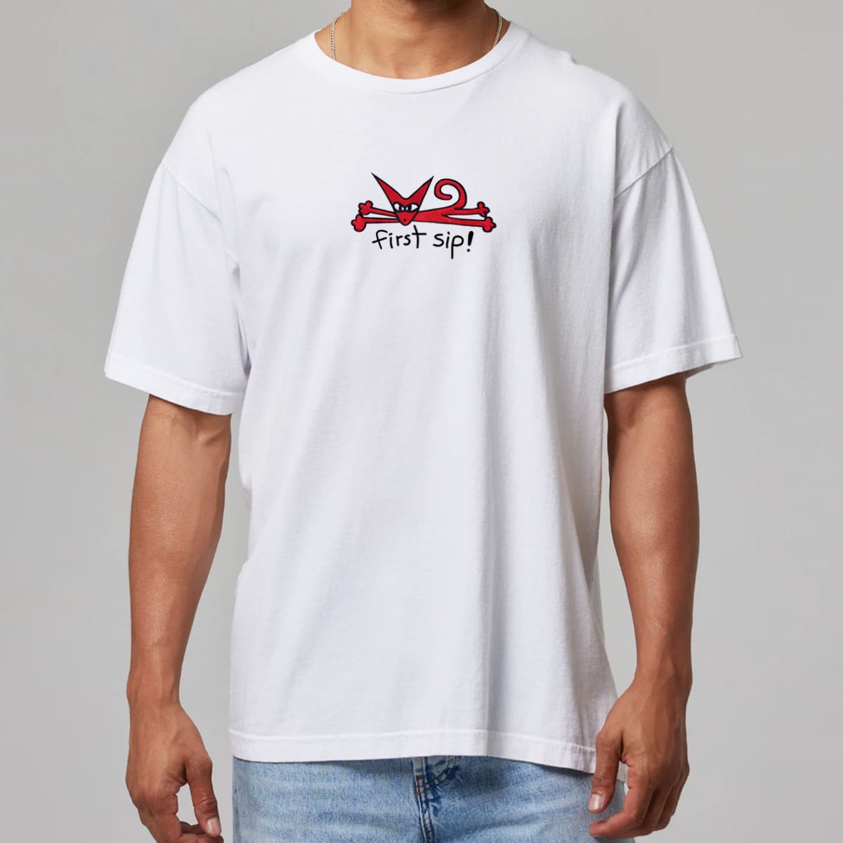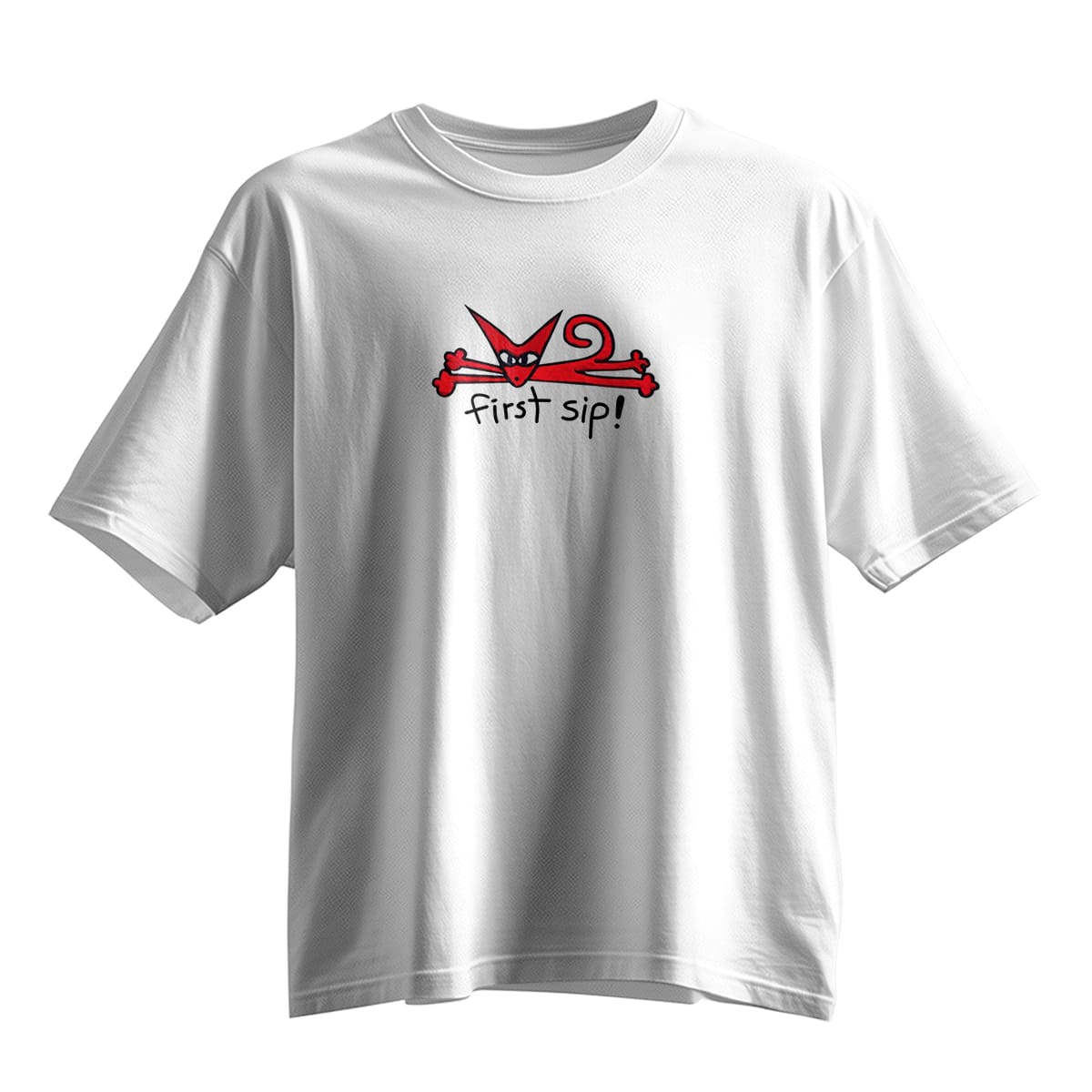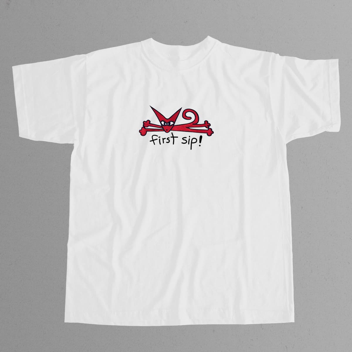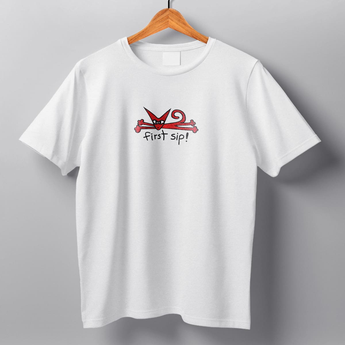 The clean white design features the red cat with a twisted tail, bulging eyes, wide-open mouth, and a small handwritten “First Sip!” underneath, bringing a super cute yet super creepy doodle aesthetic.