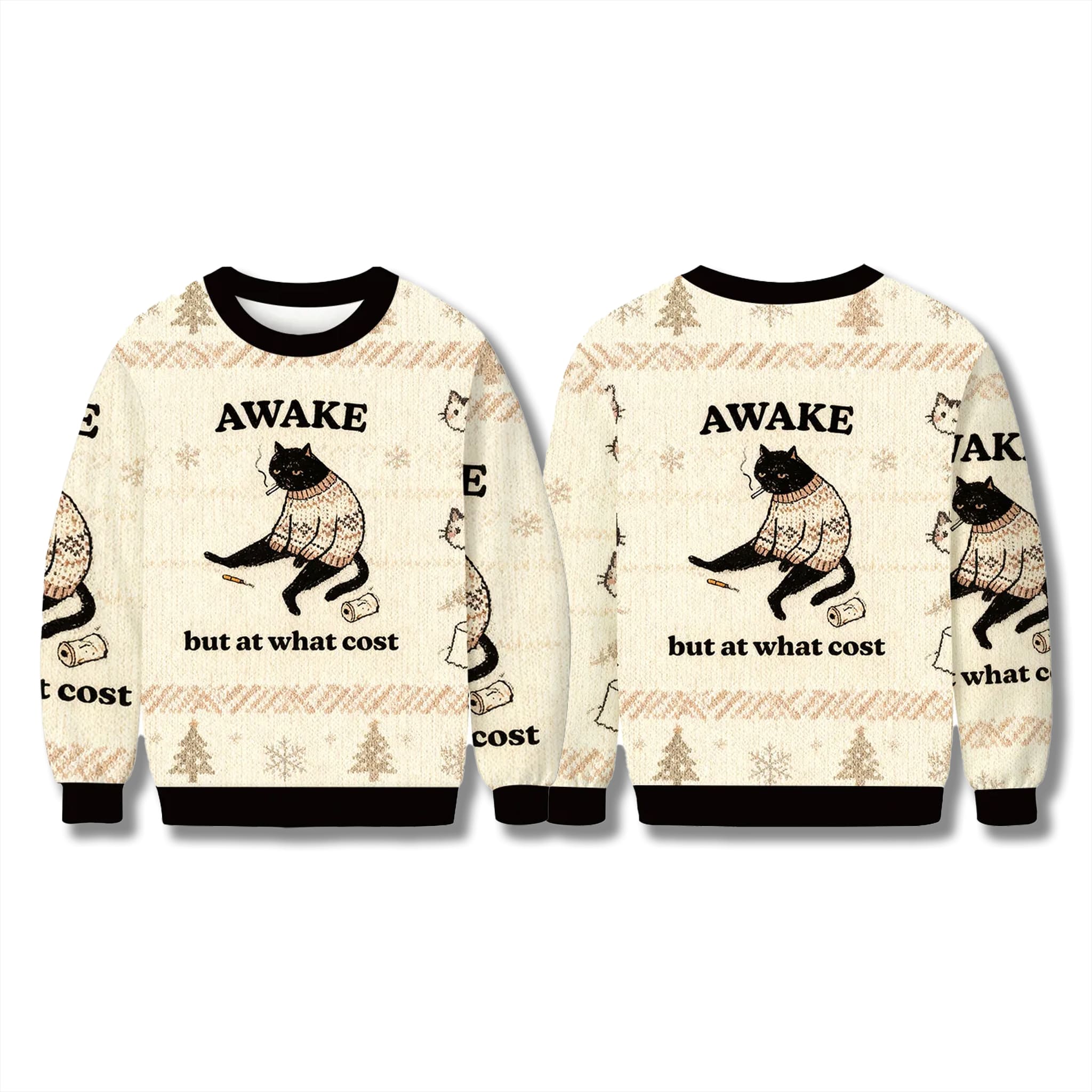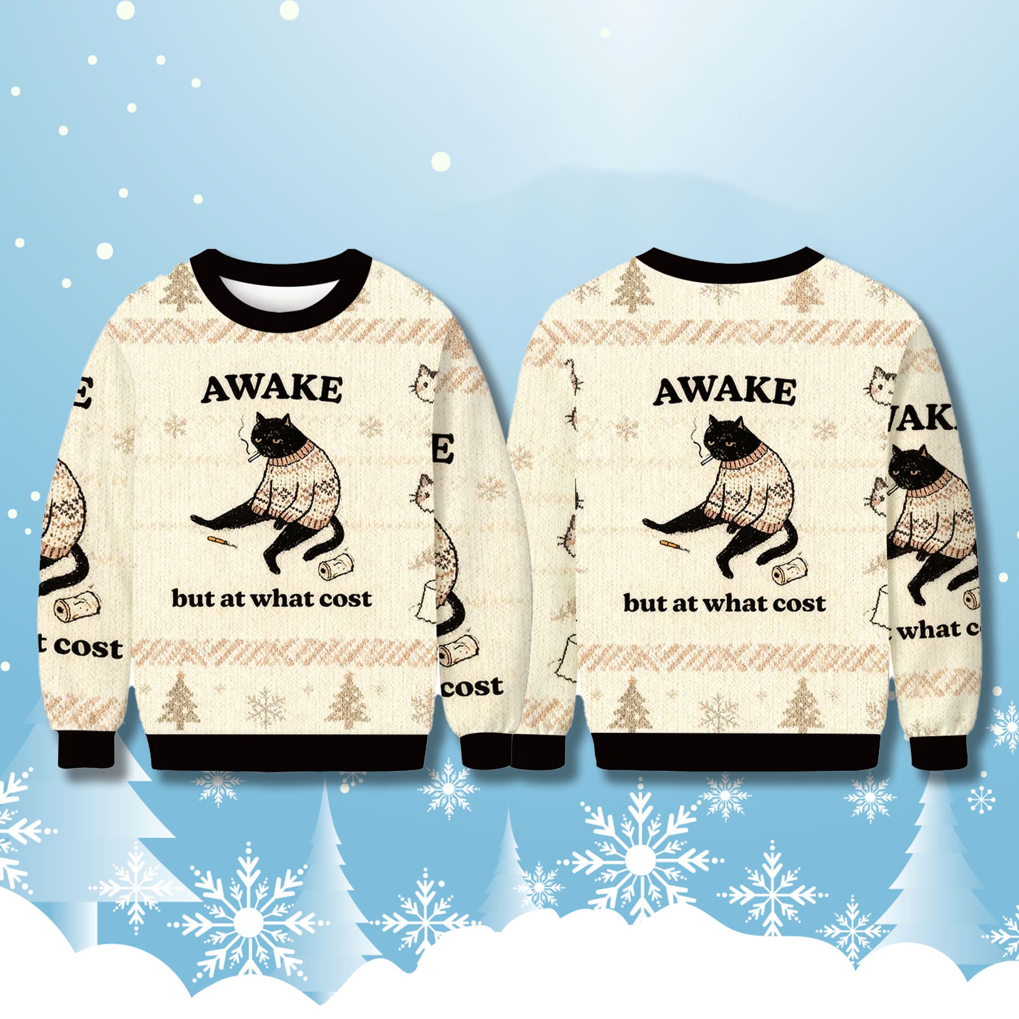 A single brooding feline lords over the chest, smoke curling past bold gothic letters “AWAKE” and the whispered confession “but at what cost.” Sleeves parade tiny repeat cats mid-yawn, clutching coffee mugs like life rafts, while faint Christmas trees fade into caffeine-stained snow.