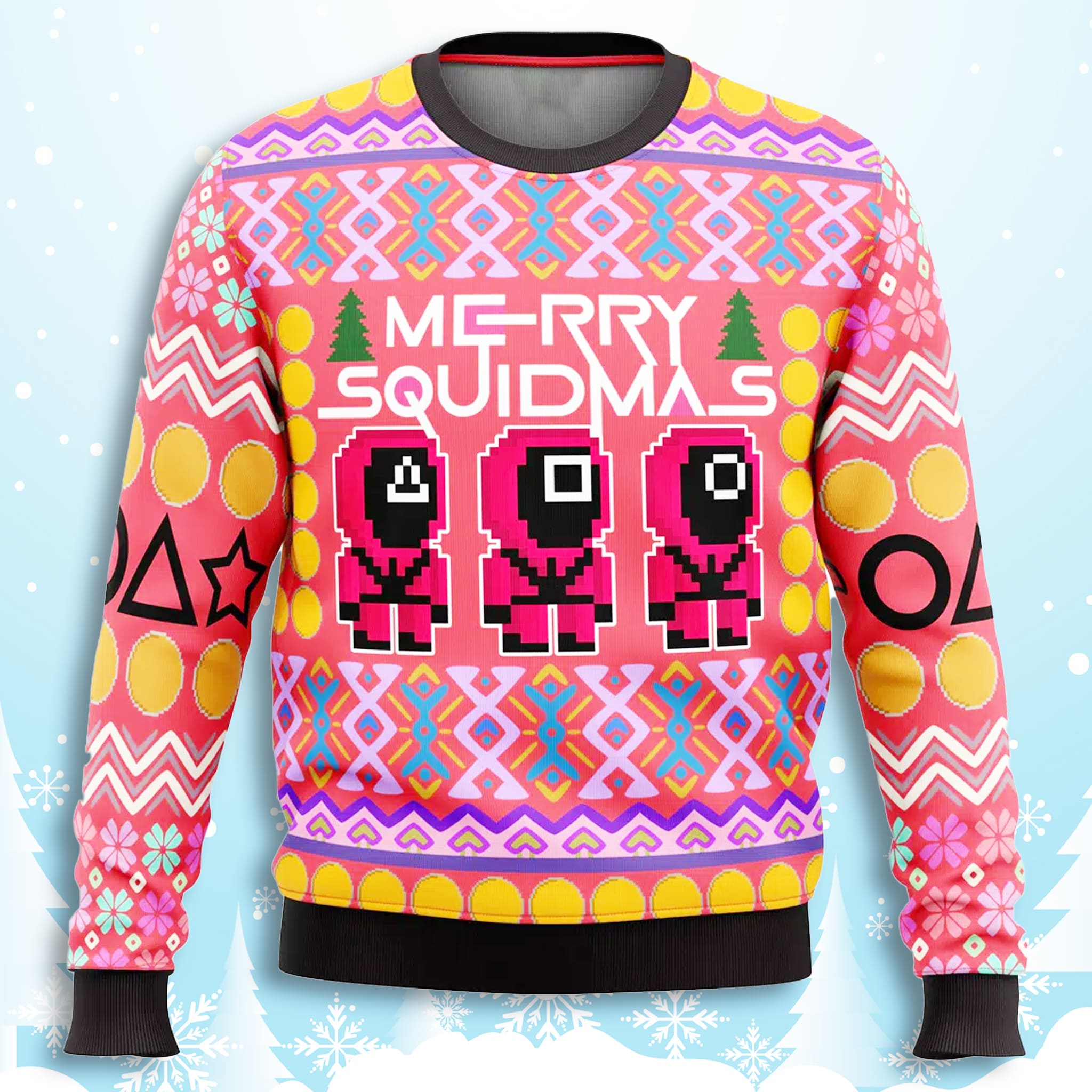 This Merry Squidmas Sweater is designed to be loud and fun. It features a dazzling, eye-catching hot pink/coral base color, layered with bright contrasting colors like yellow, blue, and purple. The overall look is heavily inspired by traditional ugly Christmas sweater geometric patterns, but cleverly integrated with Squid Game icons. The front prominently displays the phrase “MERRY SQUIDMAS” alongside pixelated figures of the masked guards.