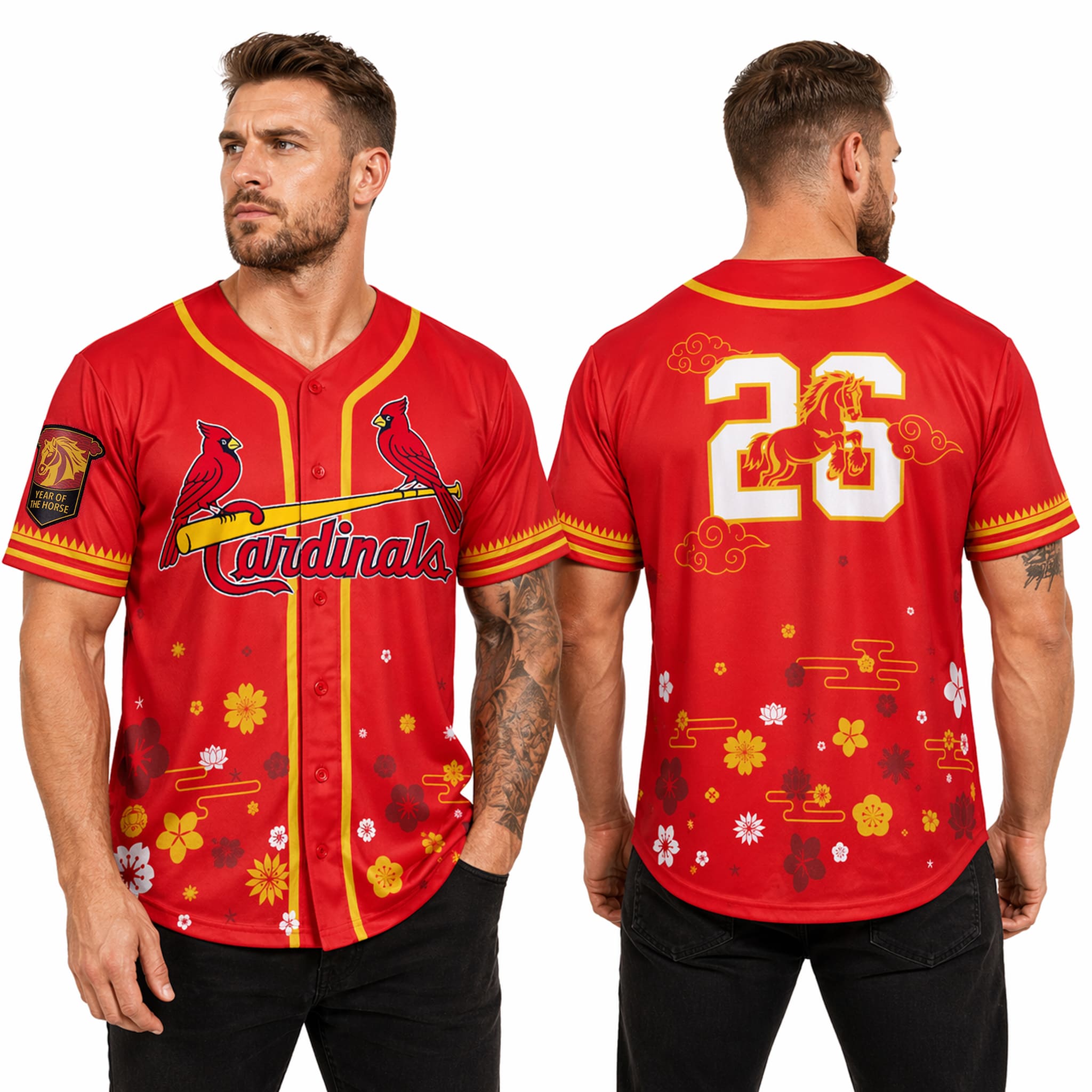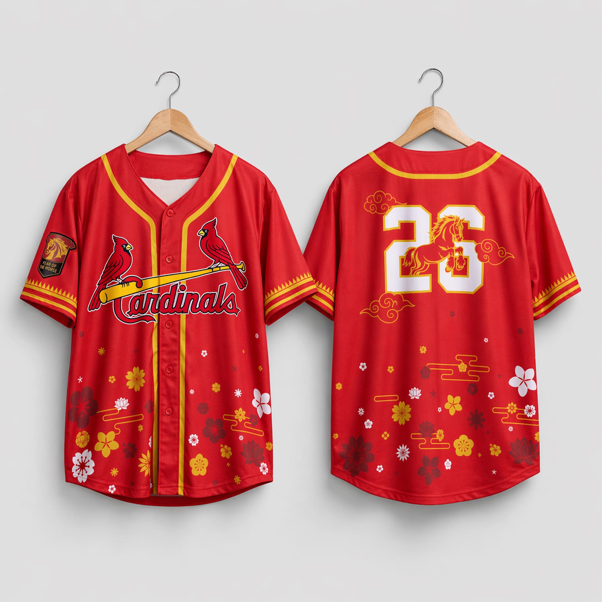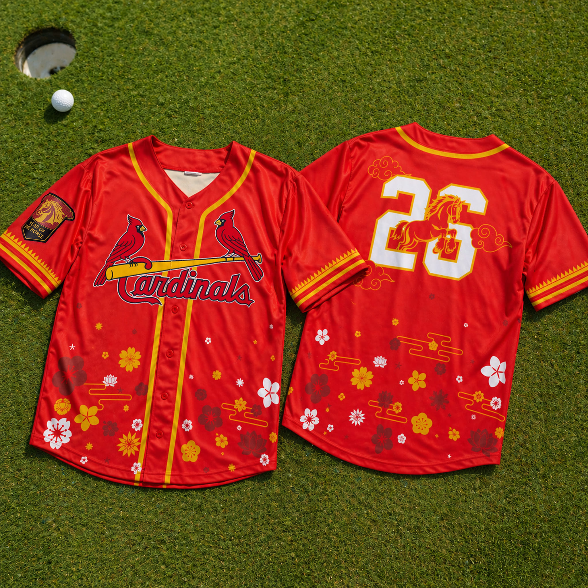 The jersey features the Cardinals’ traditional red base, refreshed with artistic elements inspired by Asian aesthetics. The most striking highlight is the Horse symbol – representing endurance, speed, and victory. Along the lower hem is a vibrant “garden” of cherry blossoms and lotus flowers intertwined with multicolored clouds, symbolizing luck and vitality.