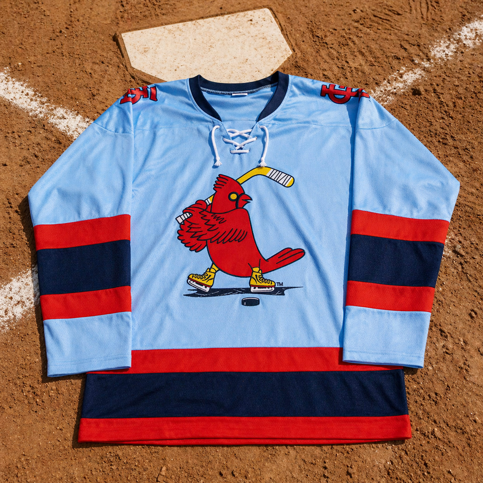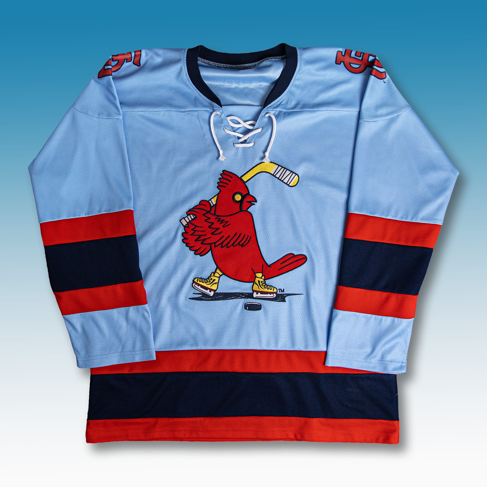 This jersey features a classic hockey style with a traditional lace-up collar. Its primary color is “Victory Blue” – a legendary shade associated with the triumphant history of the city’s teams. At the center is a bold graphic of the iconic Cardinal bird, reimagined as it glides on ice skates while holding a hockey stick – a creative and playful twist. This hockey jersey serves as a cultural bridge, celebrating diversity, unity, and the pure love of sports shared by “The Lou” community.