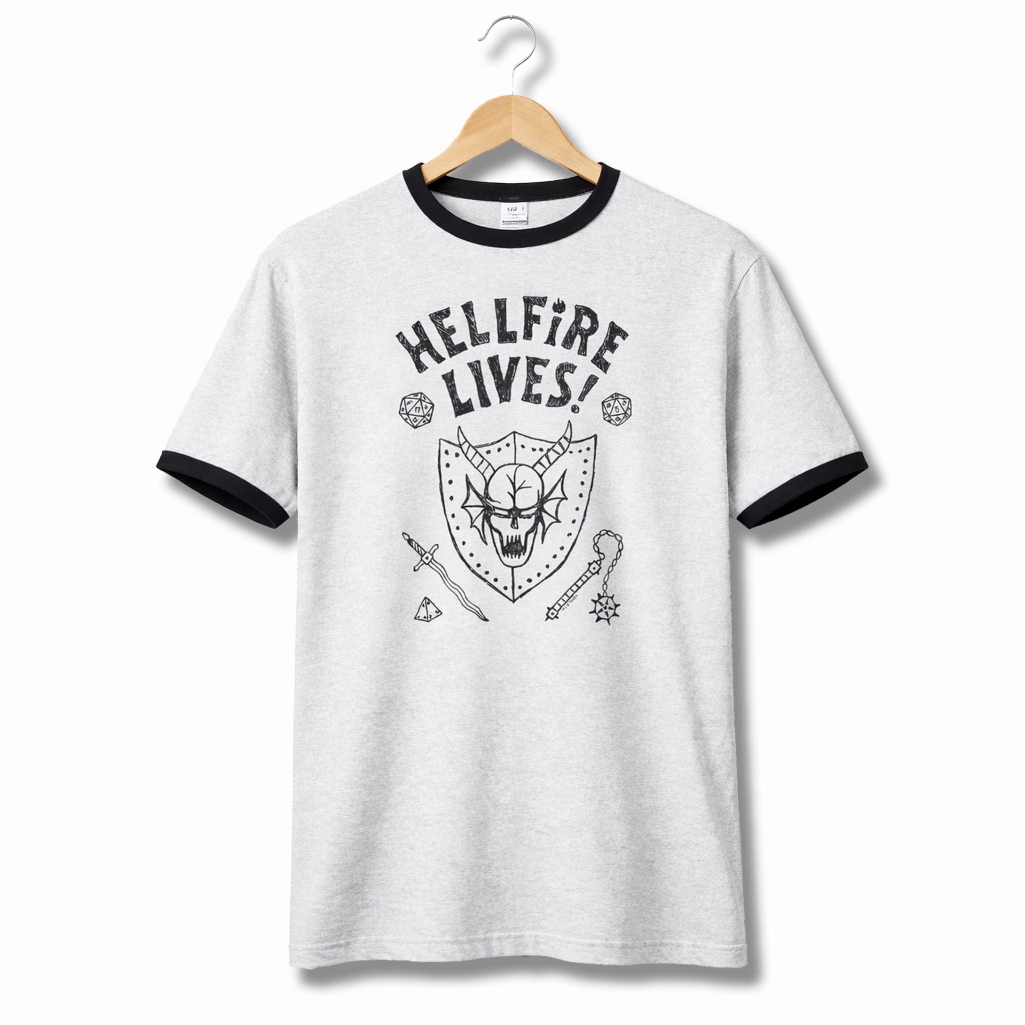 The classic ringer design with a light gray base and black trim at the collar and sleeves is easy to style for everyday wear. The bold black “Hellfire Lives” message in a grunge style, combined with iconic graphic details, creates a powerful and nostalgic 80s retro look. This light gray shirt is currently available at iFrogtees in various styles and sizes for Stranger Things fans, especially members of the Hellfire Club, to choose from and style.