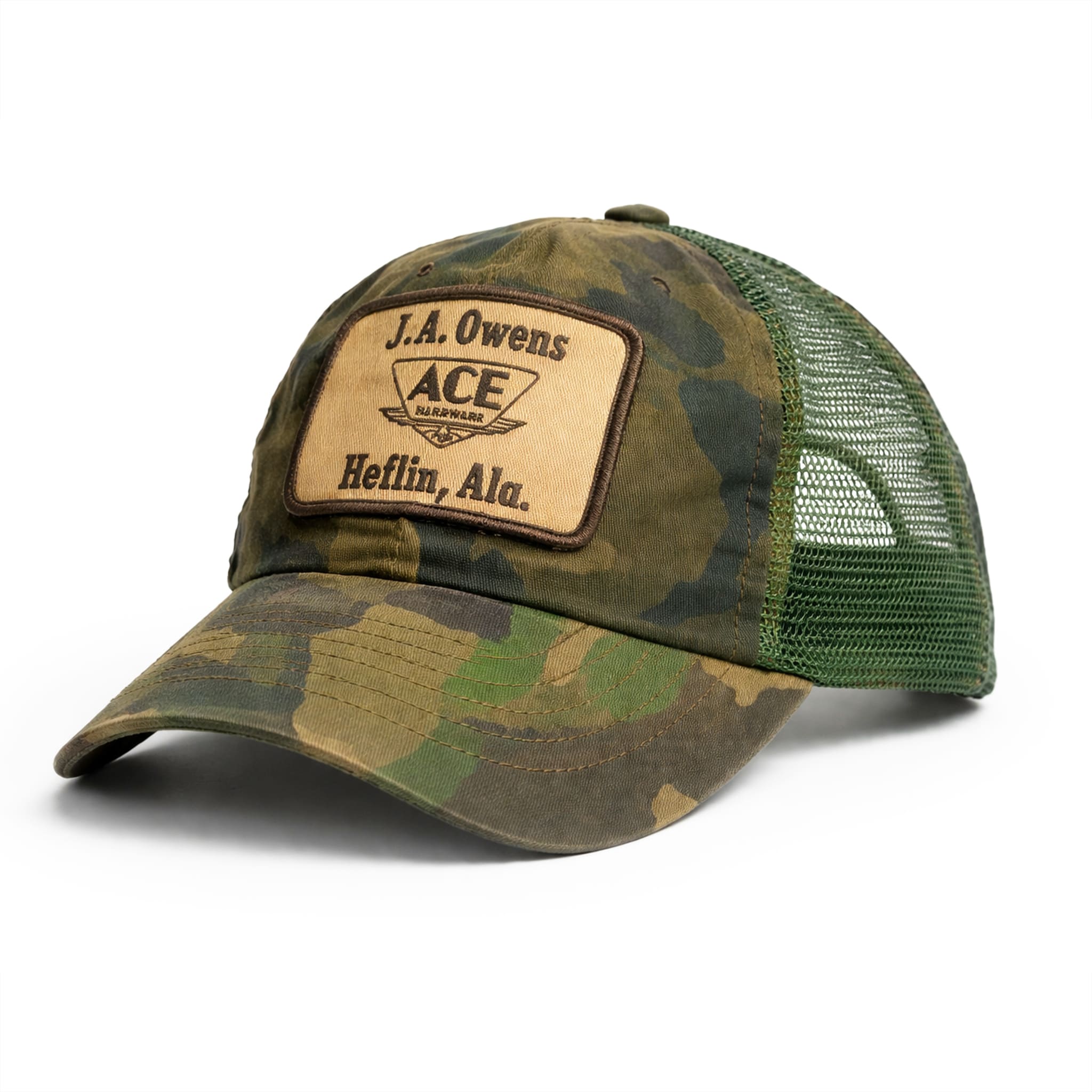 This design features a classic trucker cap style with a military camo front and a breathable mesh back. A large embroidered patch reading “J.A. Owens Ace Hardware Heflin, Ala.” stands out on the front, creating a strong vintage 80s look full of nostalgia. This design is currently available at iFrogtees and is made for true Stranger Things fans.
