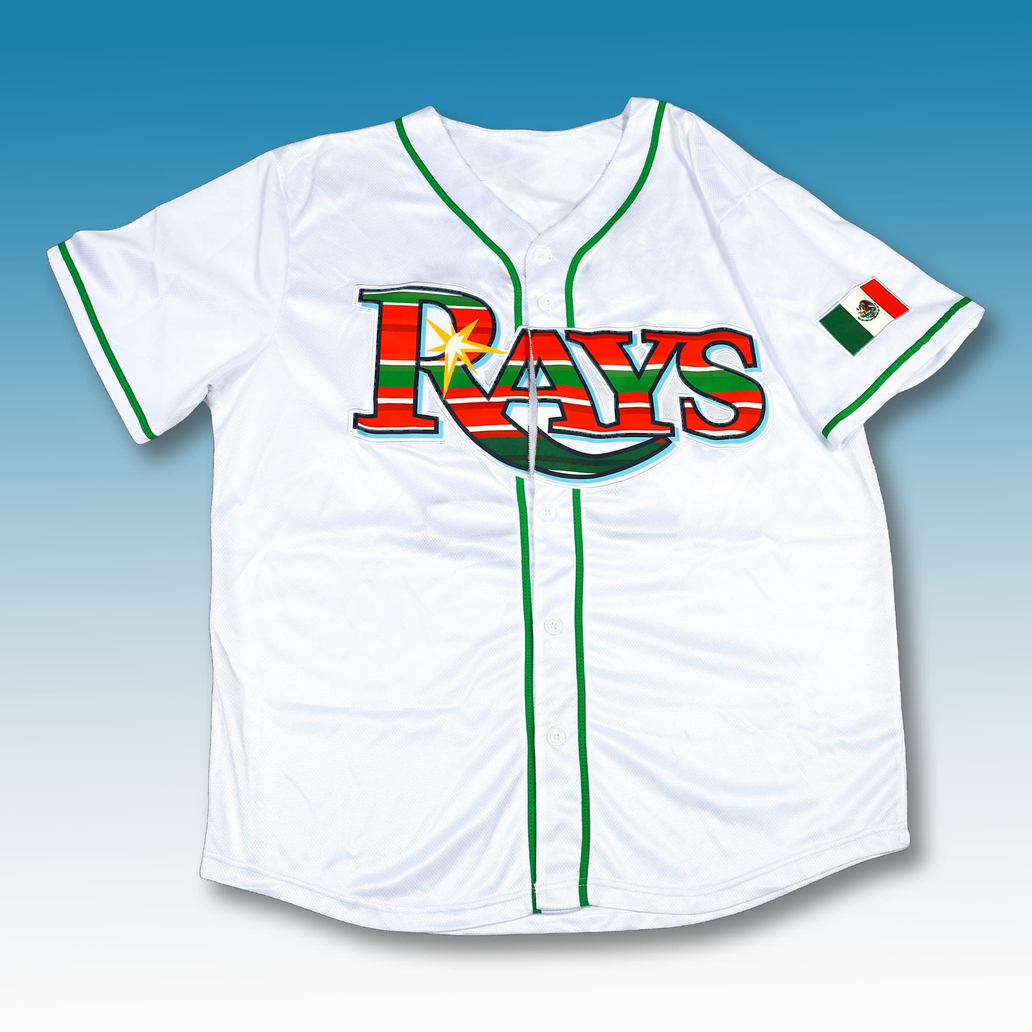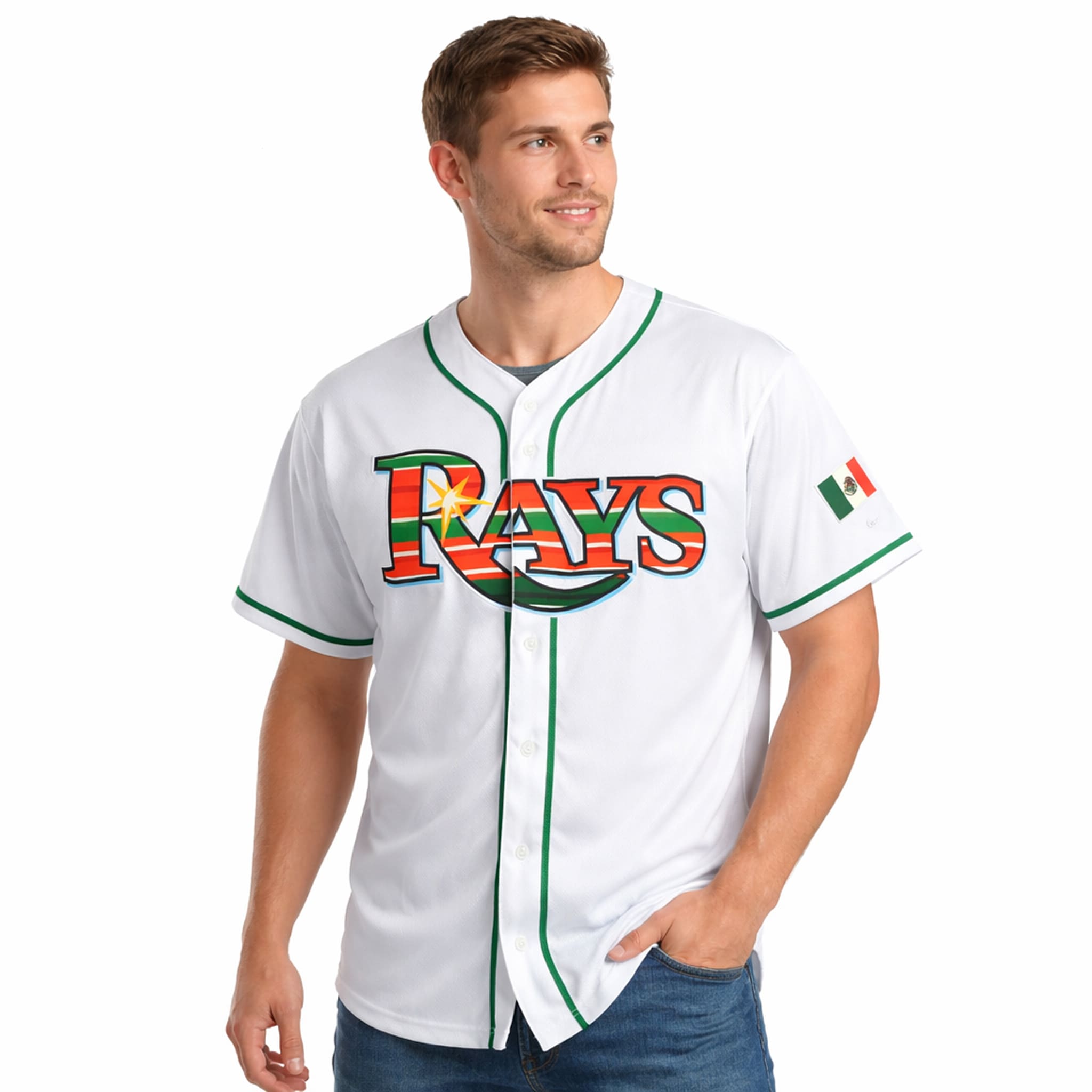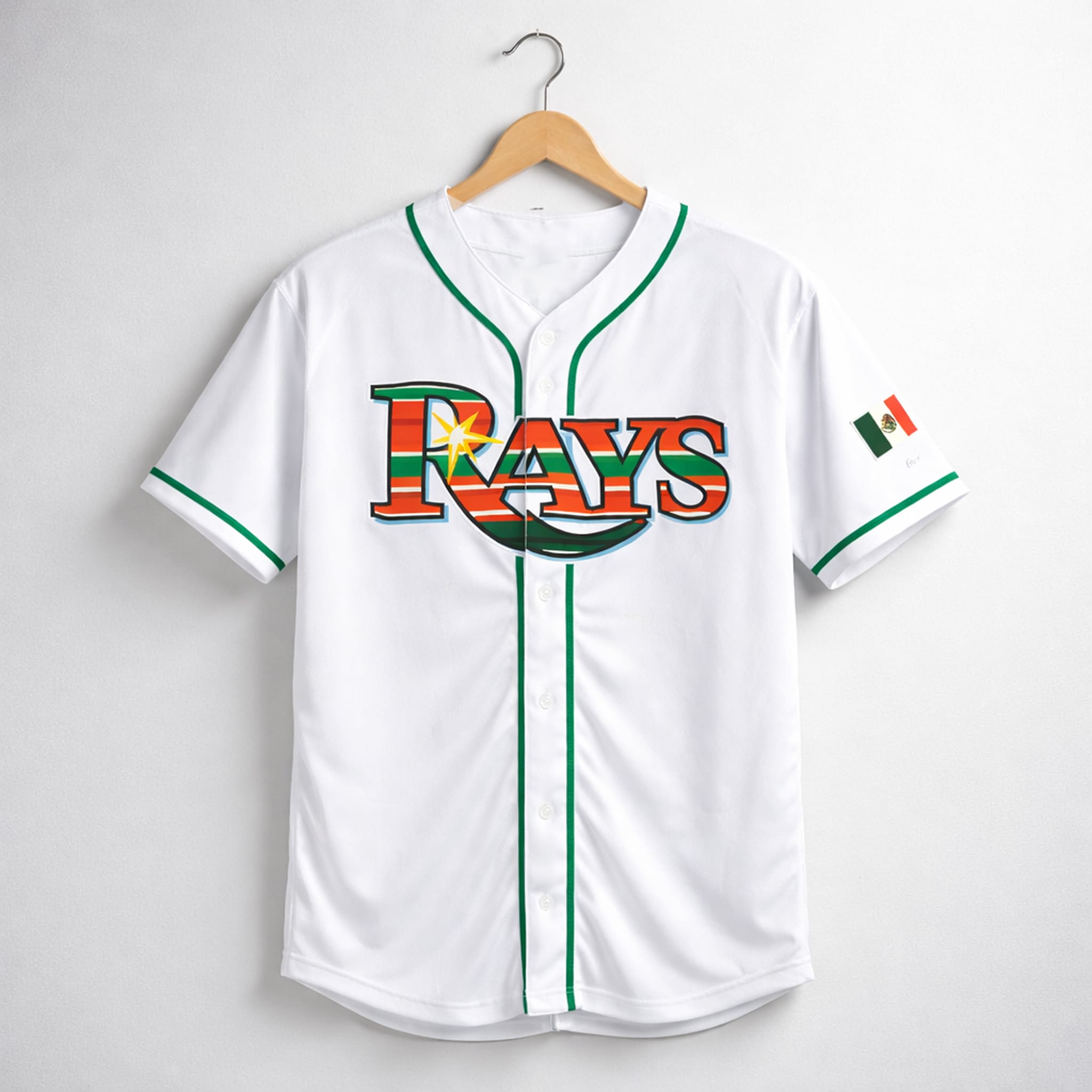 The jersey stands out with a modern City Connect–inspired design, made from premium breathable fabric in a clean white base, with bright green trim on the collar and sleeves that adds a fresh and energetic feel. On the front is a large “RAYS” wordmark in a dynamic style inspired by the colors of the Mexican flag, accompanied by a shining gold star.