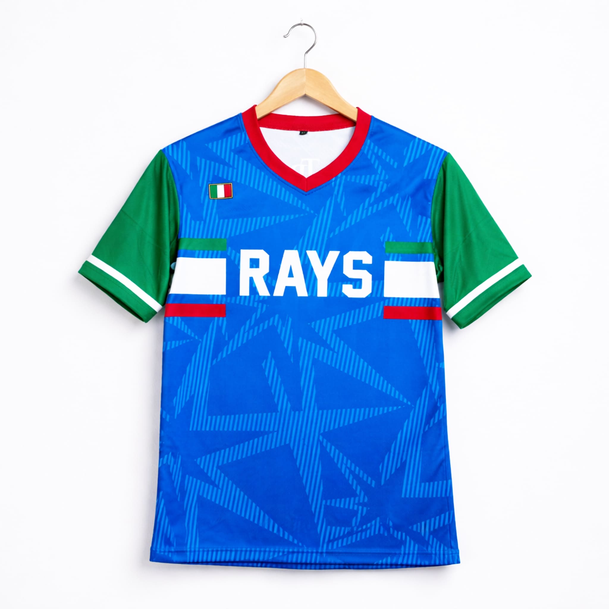 This jersey stands out with a modern soccer-style design, made from premium breathable fabric in a vibrant royal blue color. The red-and-green trim on the collar and sleeves creates a strong contrast inspired by the Italian flag (green–white–red). On the front is a bold white “RAYS” wordmark across the blue background, enhanced by a subtle zigzag pattern – a perfect design to showcase Rays pride and Italian heritage anytime.