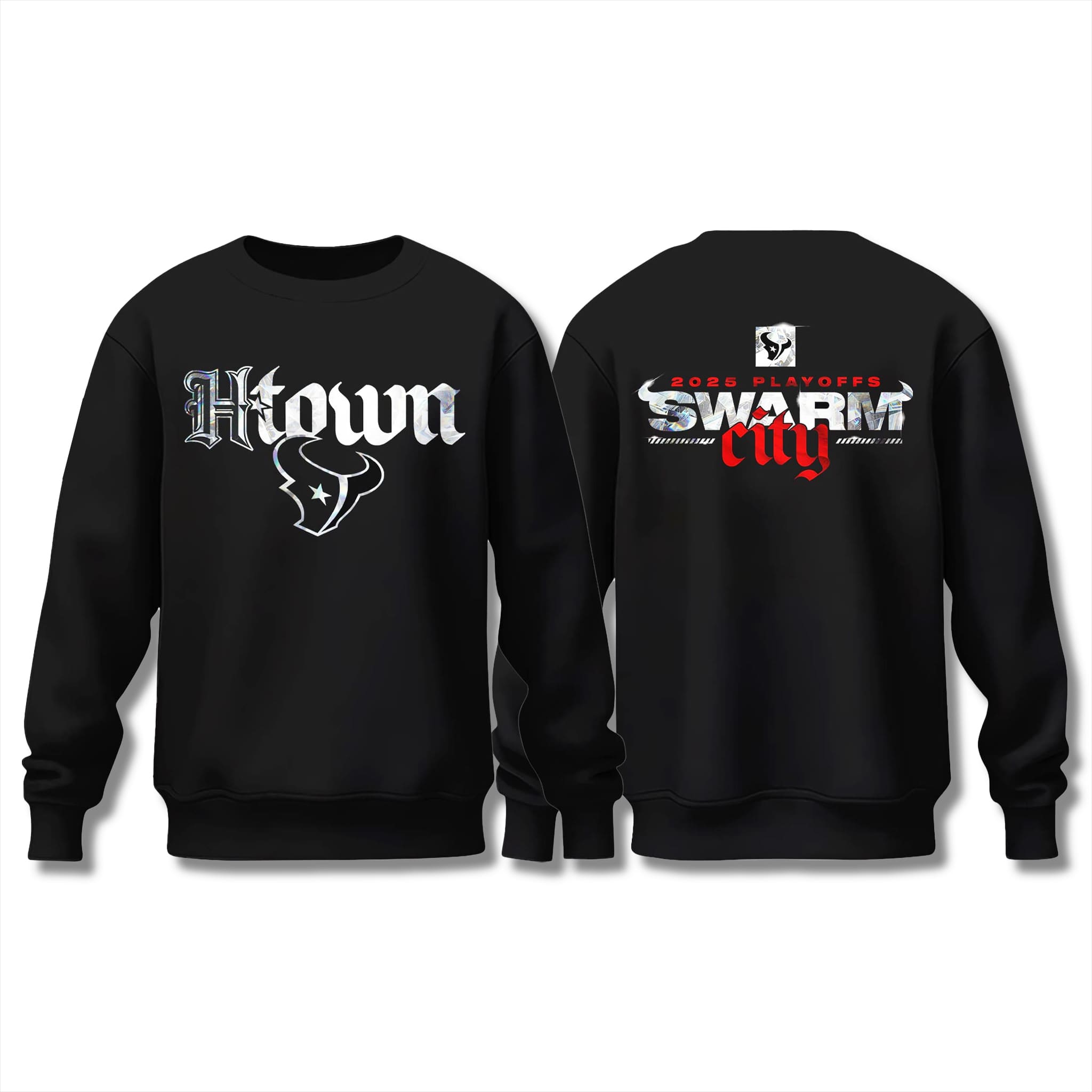 The hoodie features a mysterious black design combined with a shimmering silver “Htown” graphic on the chest, the Texans logo with star and bull horns, and a bold red “2025 PLAYOFFS SWARM city” print on the back with a powerful effect. The oversized streetwear style is warm and confident, letting you cheer for the team throughout a gritty and powerful season.
