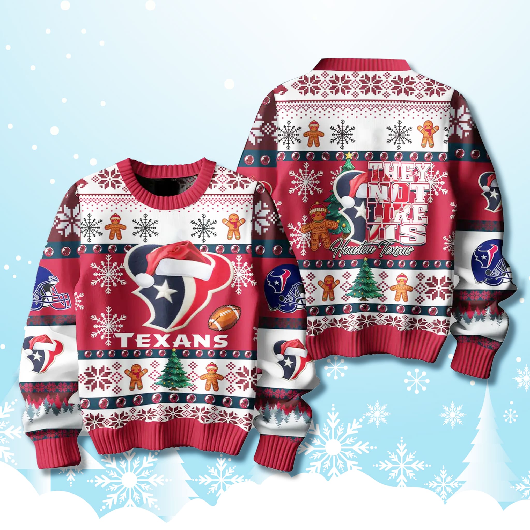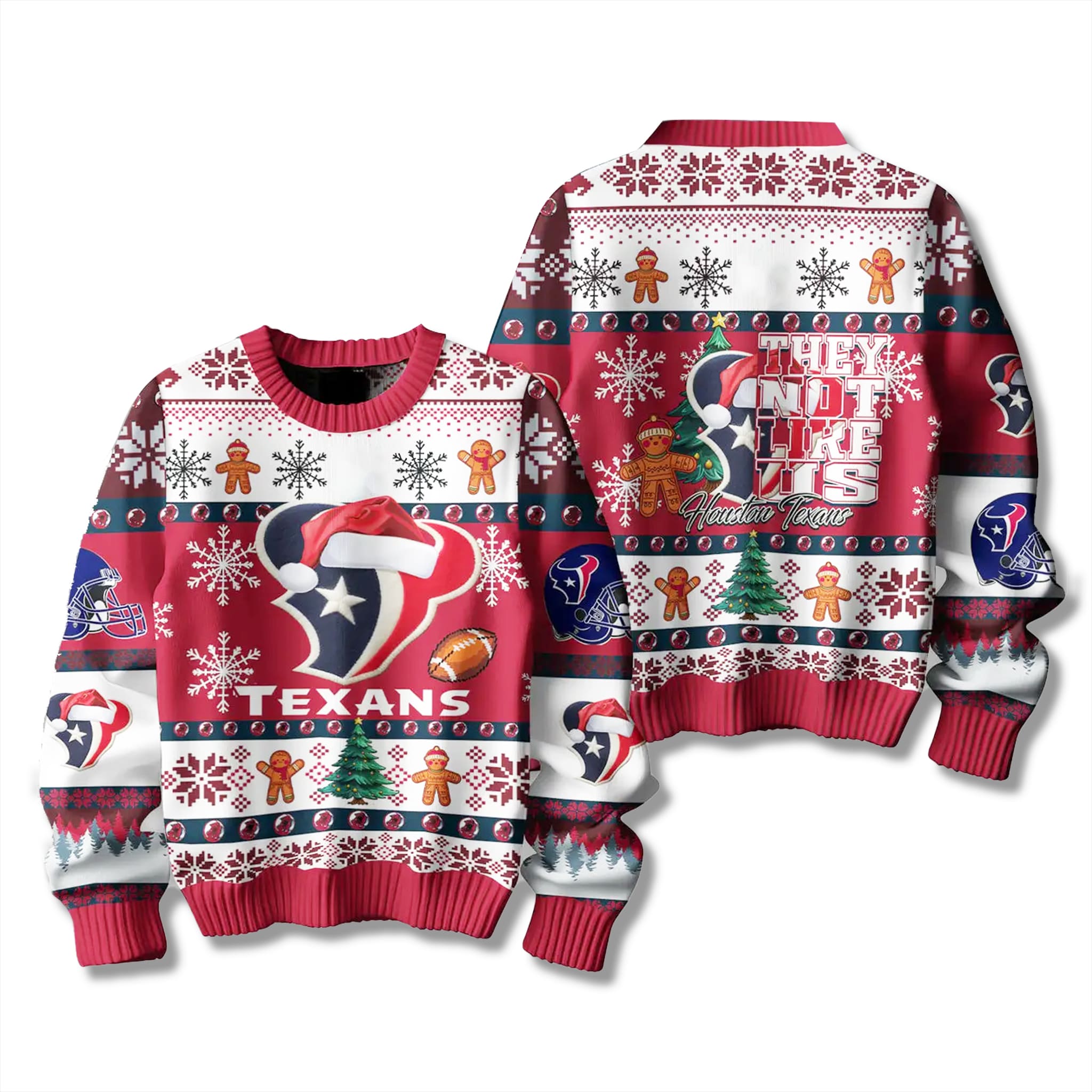 The sweater features the Texans’ dominant deep red, navy, and white colors, laid out in a fun, festive Fair Isle pattern. The design includes the iconic bullhead logo wearing a Santa hat, surrounded by charming gingerbread men, Christmas trees, footballs, and snowflakes. The back prominently features the slogan “THEY NOT LIKE US” in bold lettering, ensuring the message of team superiority is seen from every angle.