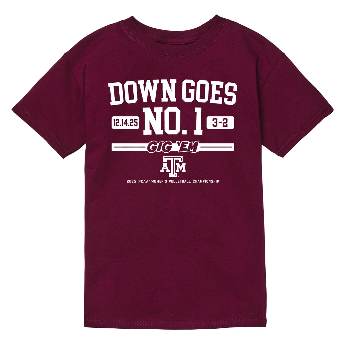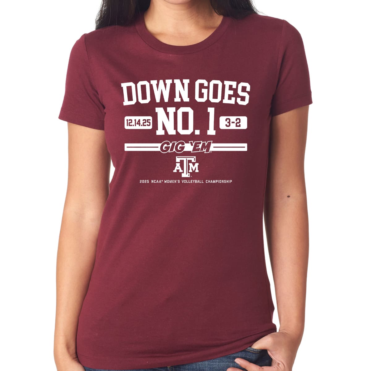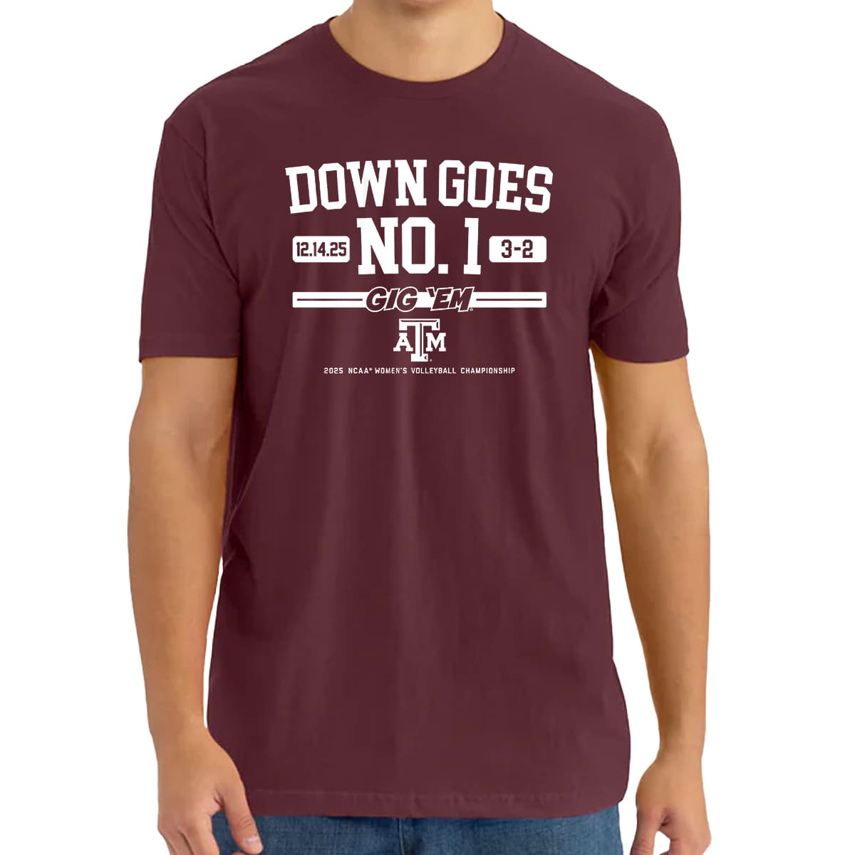 The Texas A&M Volleyball Down Goes No. 1 Gig ’em Shirt is an explosive design for the 12th Man fanbase, commemorating the shocking 3–2 victory over the Nebraska Cornhuskers in the National Semifinal of the Women’s Volleyball Championship on December 14, 2025 – marking the first time Texas A&M advanced to the National Championship game, ending Nebraska’s 11-game winning streak and crushing the Huskers’ hopes of a six-peat. This shirt symbolizes the unbreakable 12th Man spirit – where the underdog topples a giant and brings hope of a first-ever national title to Texas A&M.