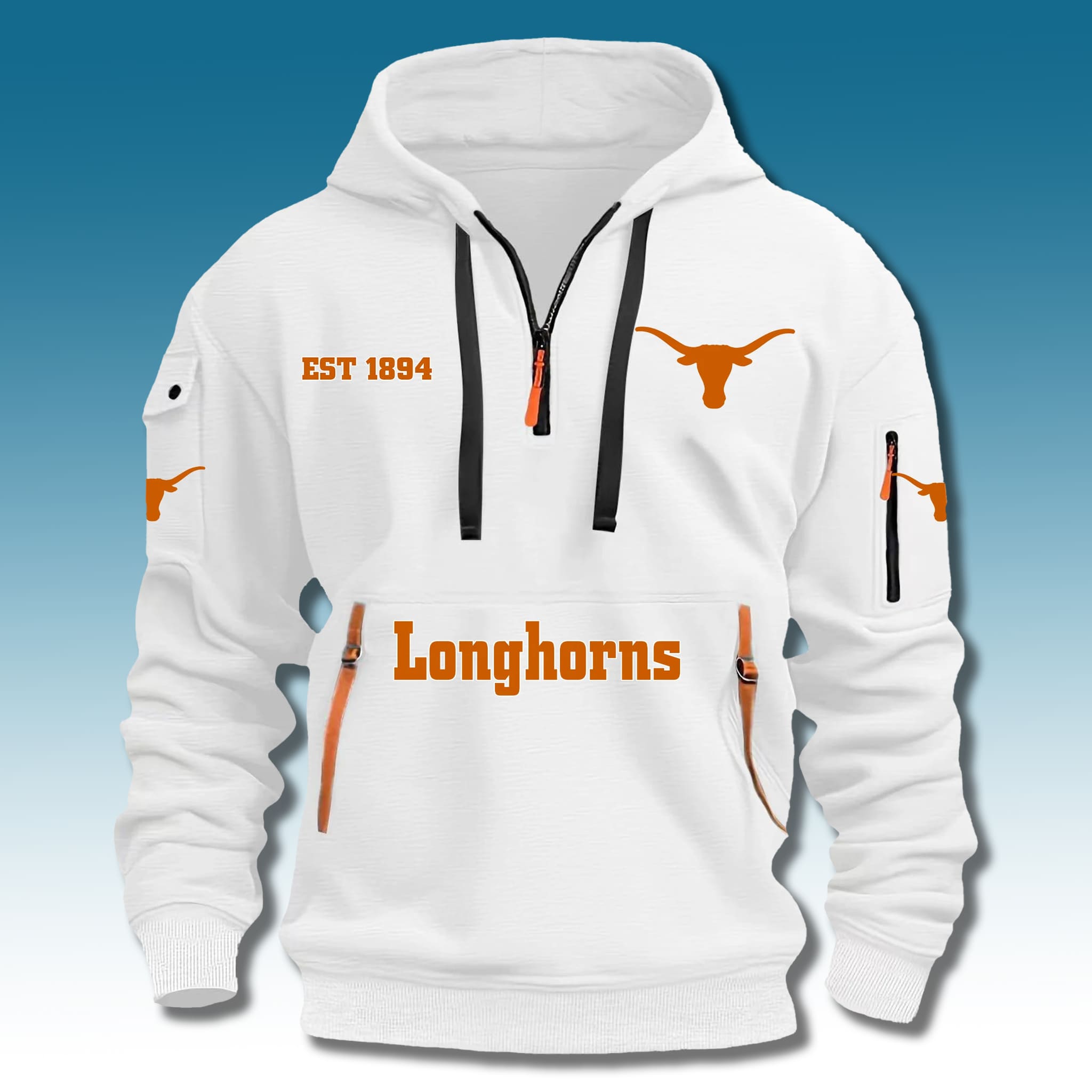This Longhorns Zip Hoodie stands out with its refined white base color, creating a perfect contrast with the team’s characteristic Burnt Orange details. The modern Quarter Zip design (1/4 zipper) combined with the iconic longhorn cattle head graphic and functional cargo pockets gives an edgy look that honors the team’s glorious history.