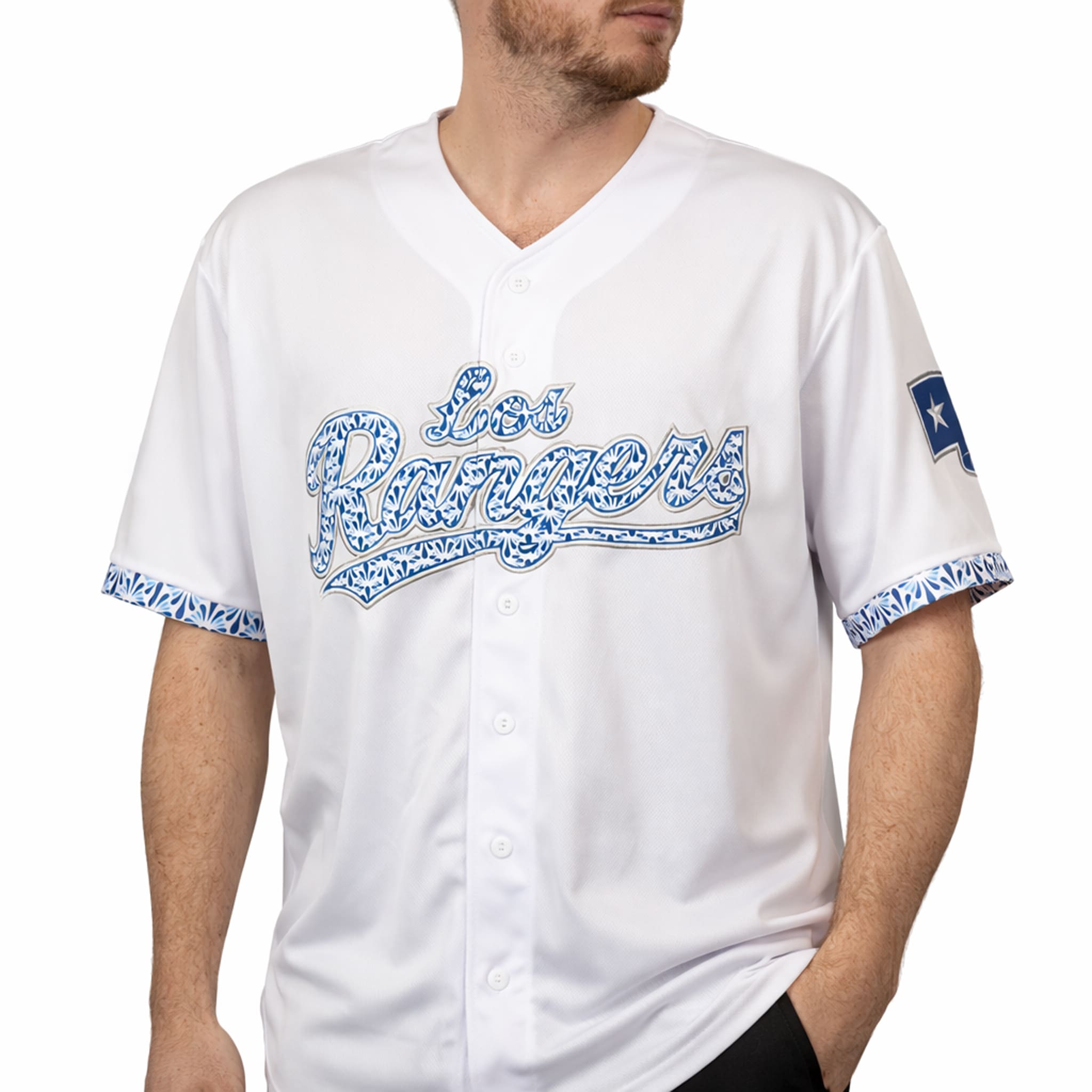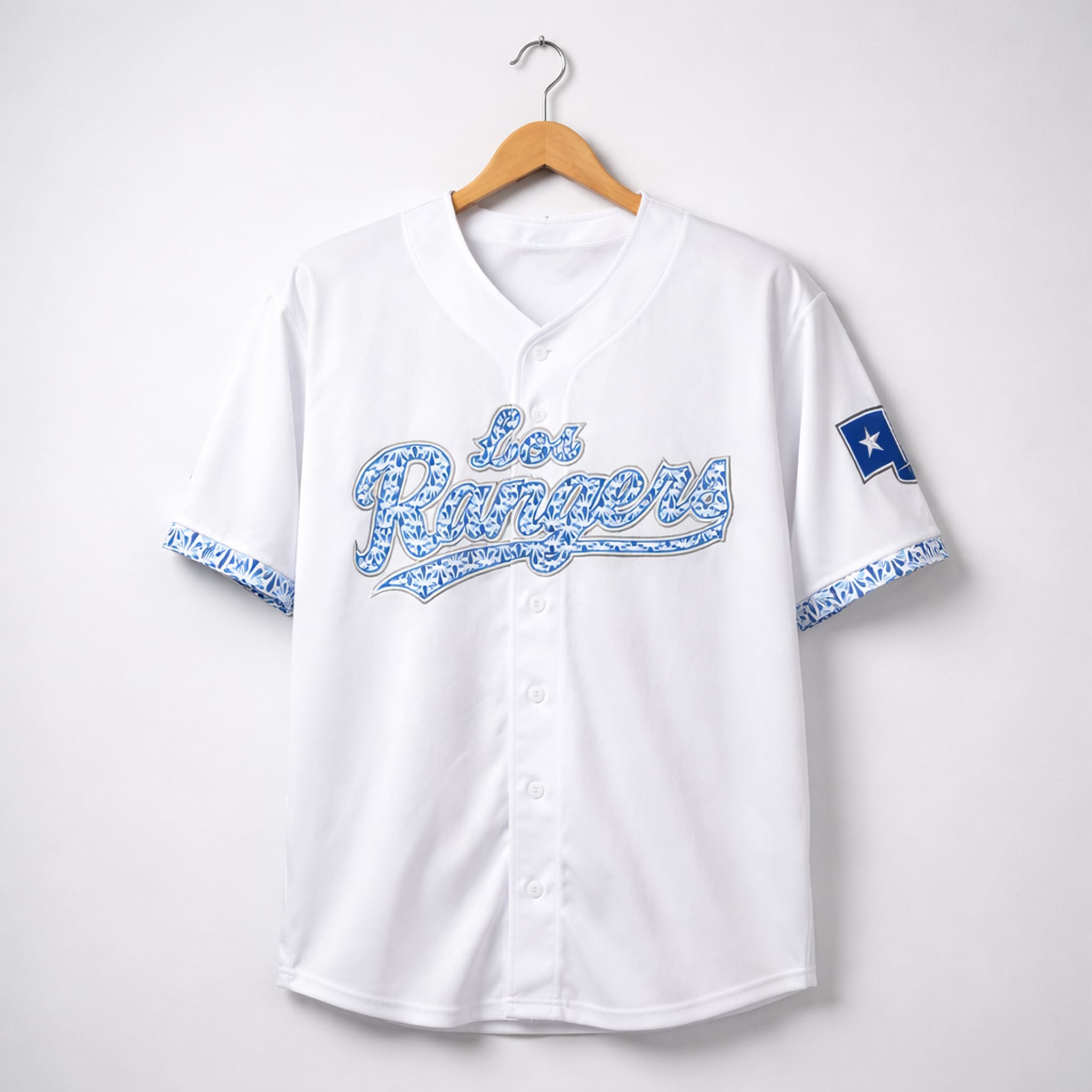 The jersey stands out with a clean white base, creating a classic look. The iconic “Los Rangers” lettering across the chest is filled with intricate blue patterns inspired by traditional Mexican Talavera designs. The large number 26 on the back makes the jersey easily recognizable even from a distance. The sleeves feature a State Farm patch and the Texas star symbol – combining Mexican cultural elements with a modern style. It’s perfect for showcasing Rangers pride and Mexican heritage anytime, from the stadium to family gatherings.