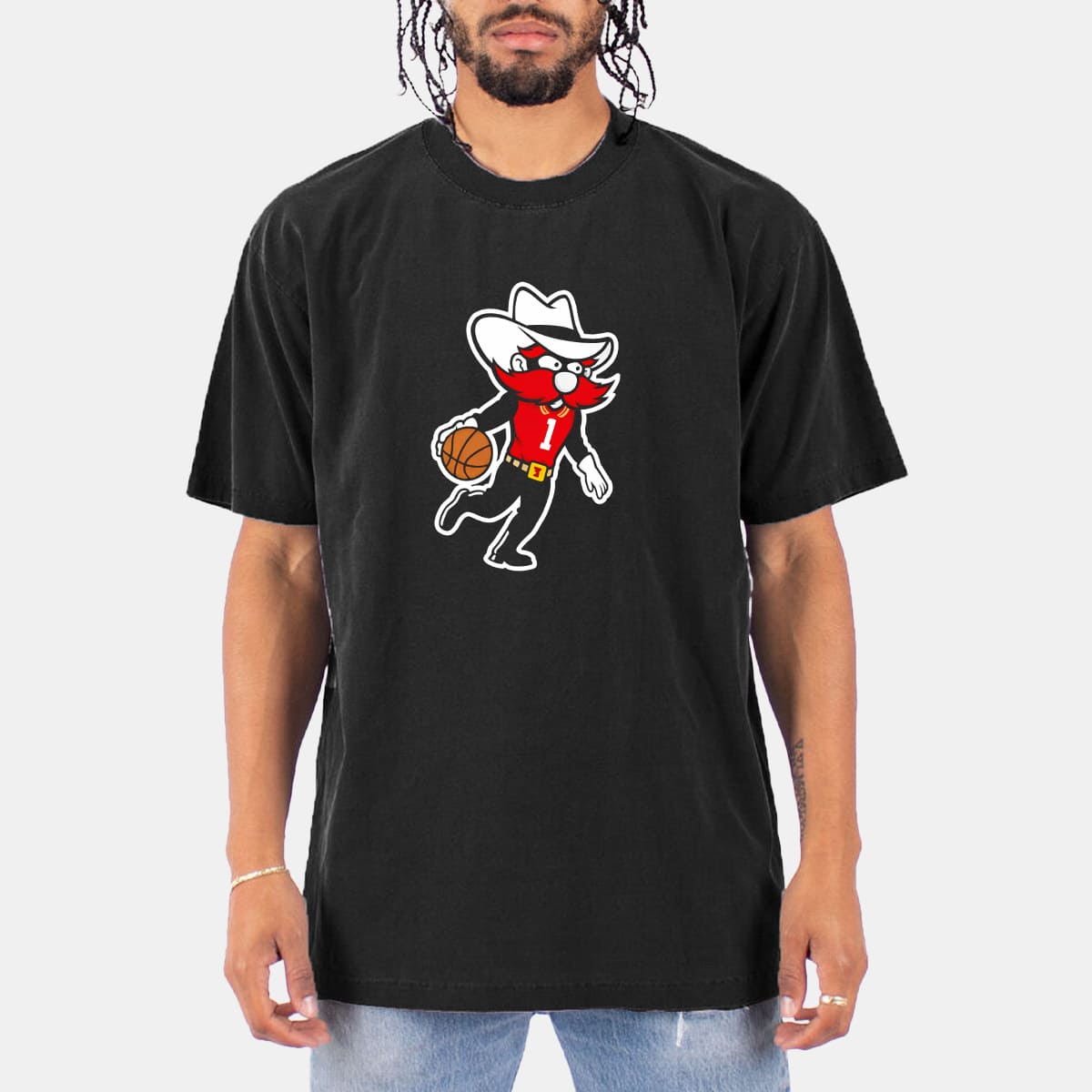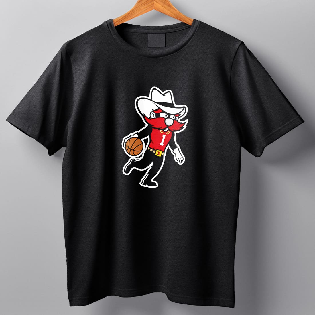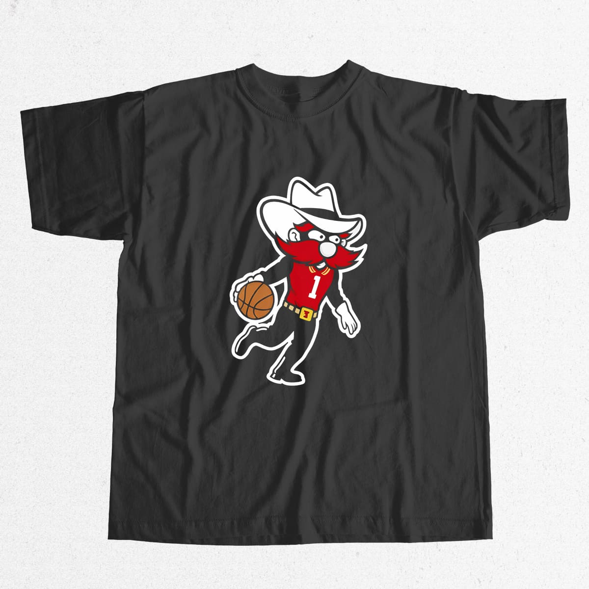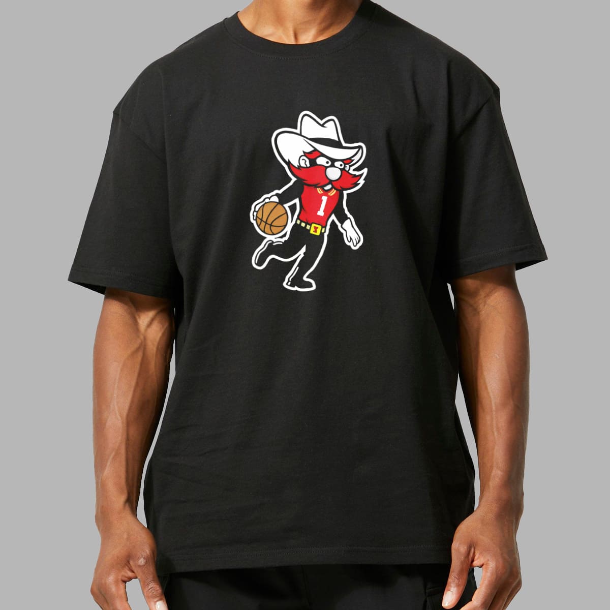 The shirt features Raider Red – the famous costumed mascot of Texas Tech – inspired by the West Texas cowboy spirit. The character appears as a bearded cowboy with a wide-brim hat, representing the iconic “Guns Up” spirit, the signature slogan of the Red Raiders.