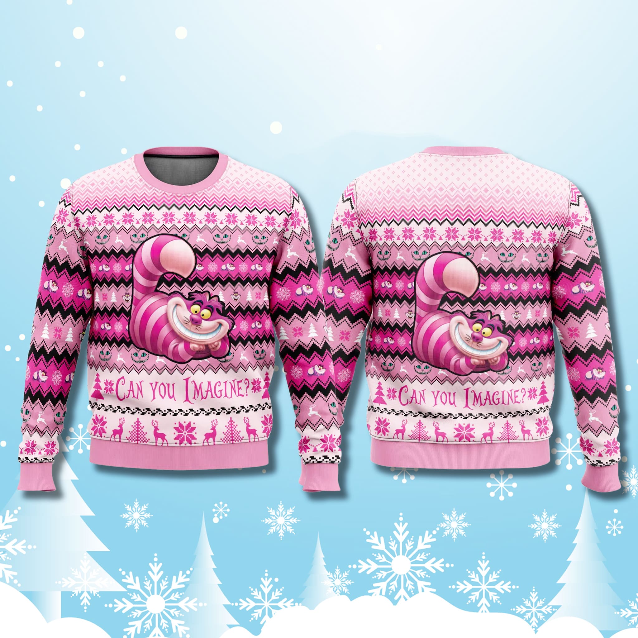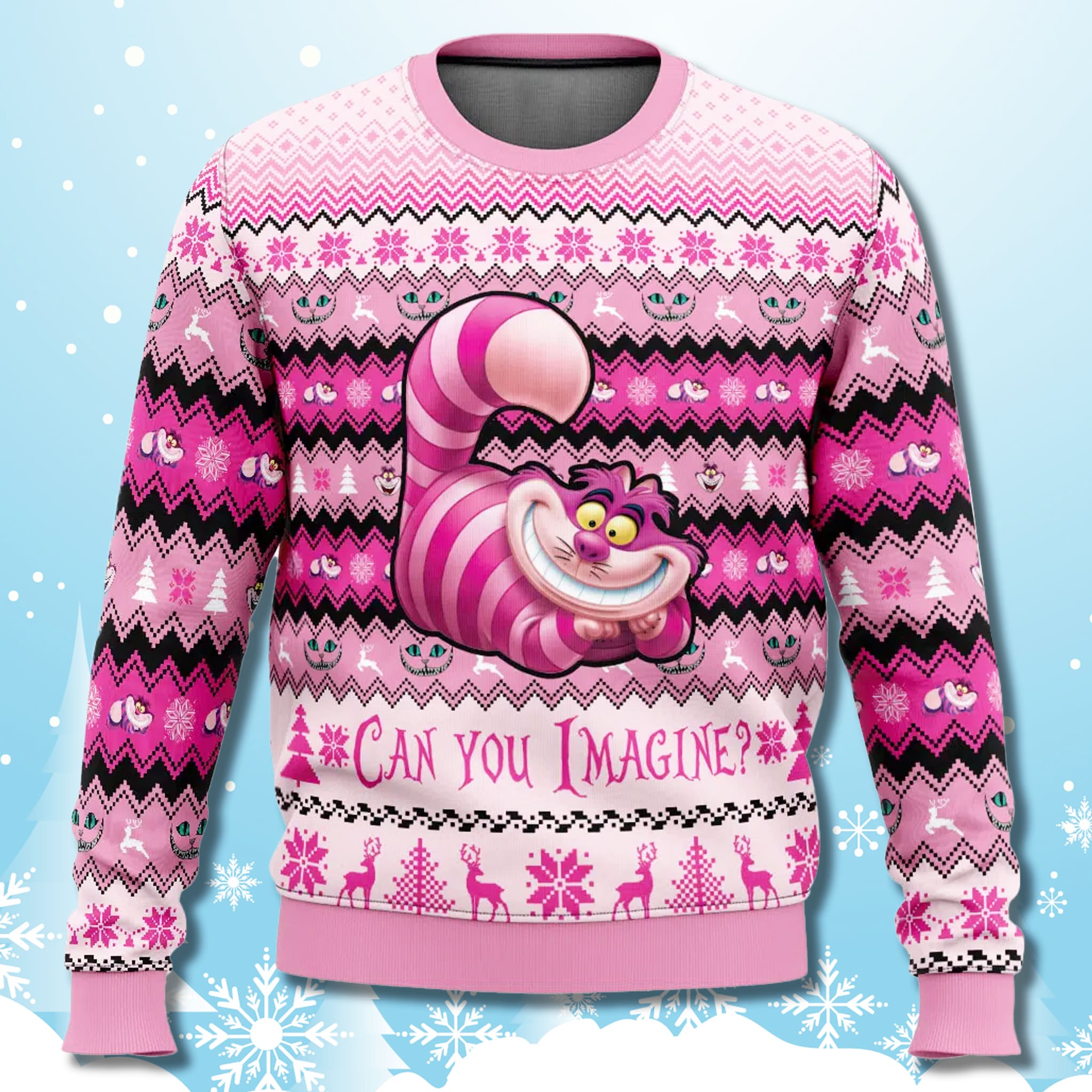 Vanish and reappear this holiday season with a mischievous grin! The Cheshire Cat Pink Ugly Christmas Sweater is a wonderfully whimsical piece of Disney holiday apparel for fans of Alice in Wonderland. Standing out in a sea of red and green, this sweater perfectly captures the enigmatic spirit of the Cheshire Cat, complete with his iconic grin and the philosophical question: “CAN YOU IMAGINE?” It is the ultimate statement piece for ugly sweater parties, offering a unique blend of festive fun and unpredictable pop culture charm.