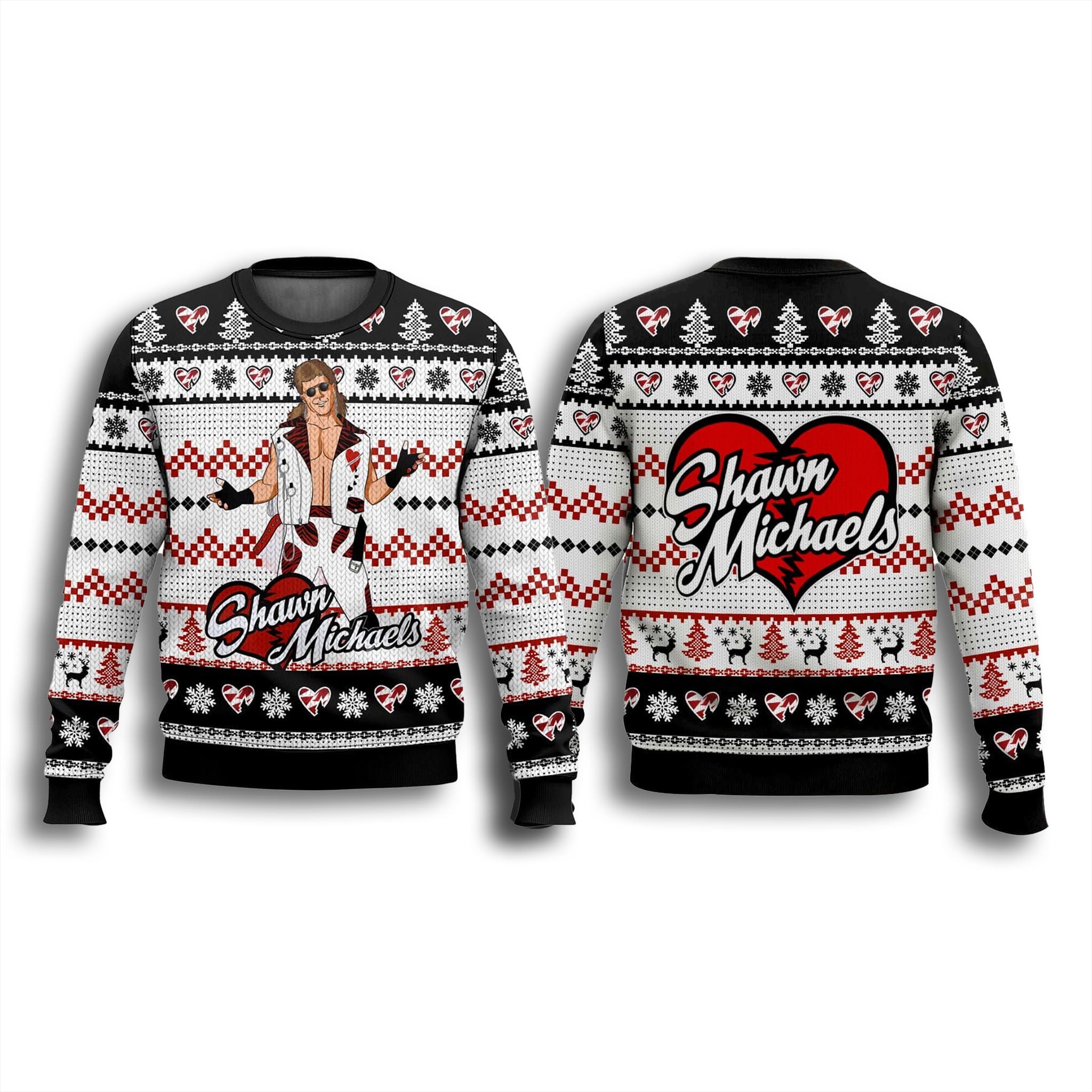 This spectacular garment is a celebration of the WWE Hall of Famer, capturing his legendary persona with bold style. The Shawn Michaels Ugly Christmas Sweater features a striking black, white, and red color palette, giving a classic yet edgy holiday feel. The iconic image of “The Heartbreak Kid” is front and center, complete with his signature pose, alongside his classic heart logo.