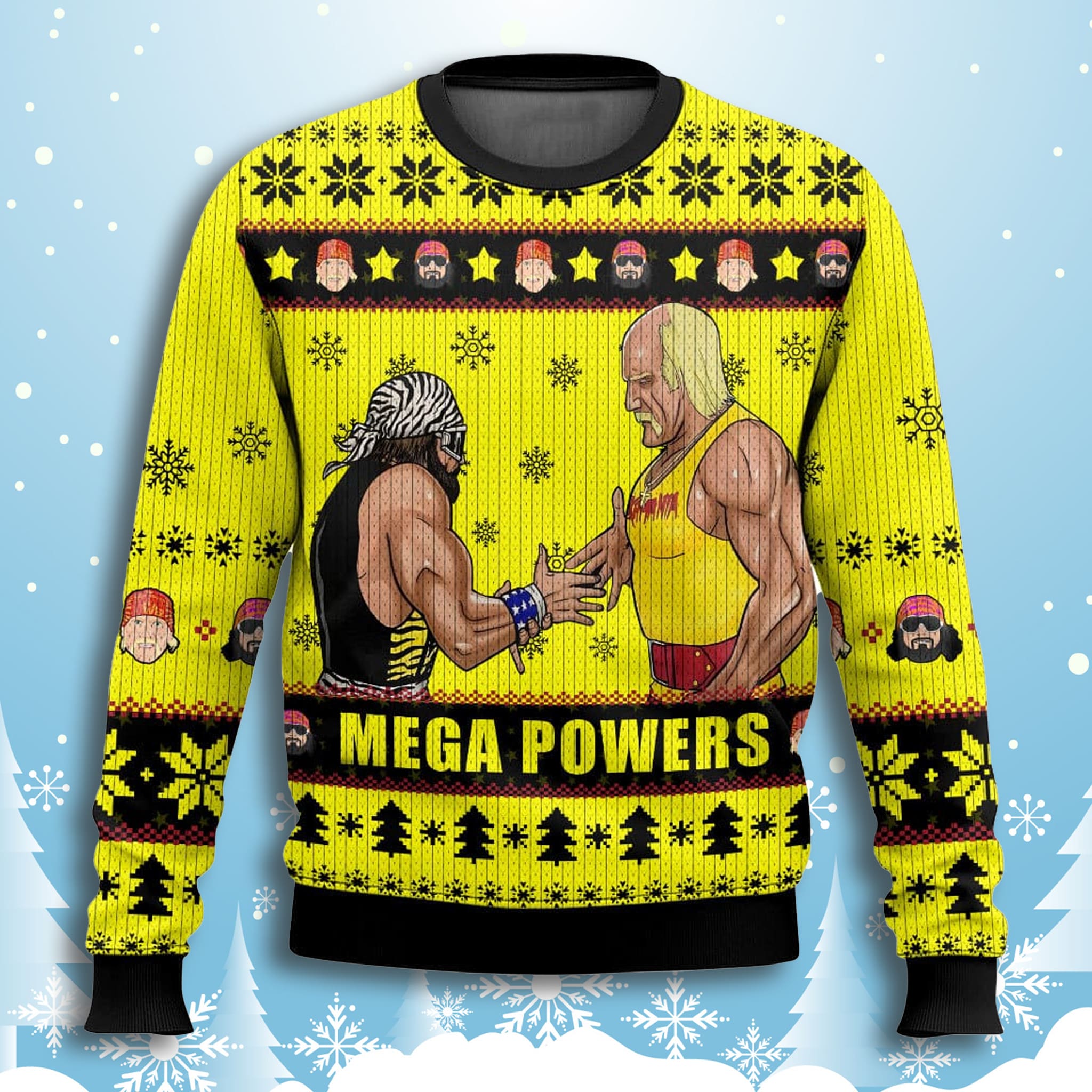 Feel the power! This striking yellow Mega Powers Ugly Christmas Sweater is running wild on the holiday season. A must-have Hulkamania Christmas item featuring Randy Savage and Hulk Hogan. Vibrant yellow and super comfortable. Snap into a Slim Jim and buy one!