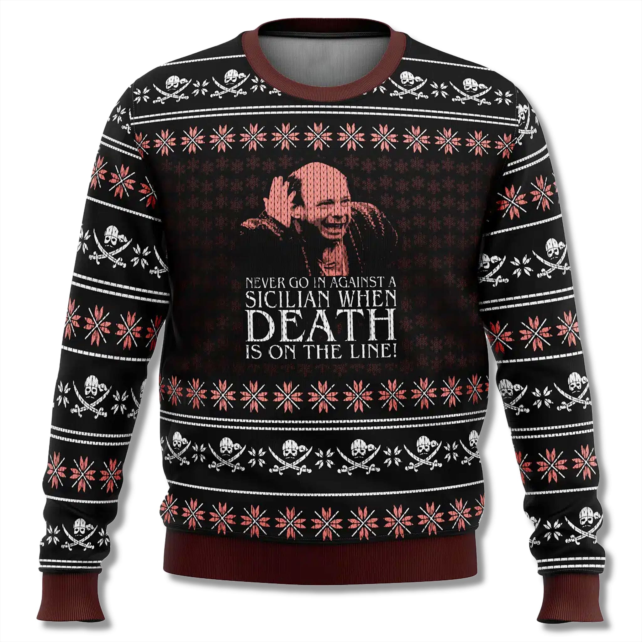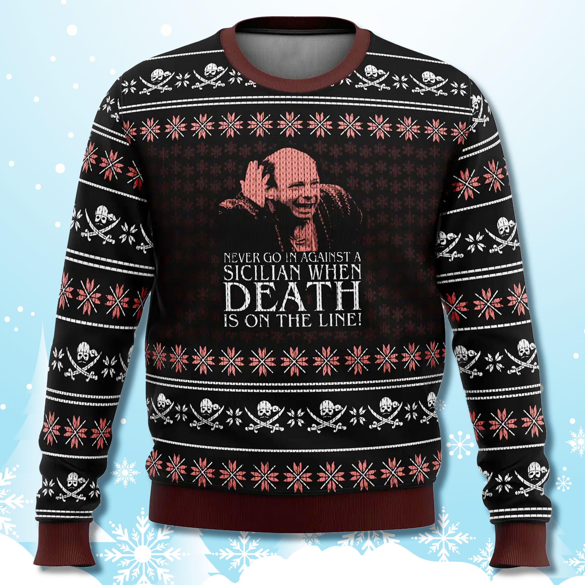 Don’t fall victim to the classic blunders; make the smart choice this winter! This garment is the perfect mix of wit, warmth, and movie magic for yourself or as a gift. Order your The Princess Bride Vizzini Ugly Sweater today and prove that your holiday style is superior to everyone else’s!