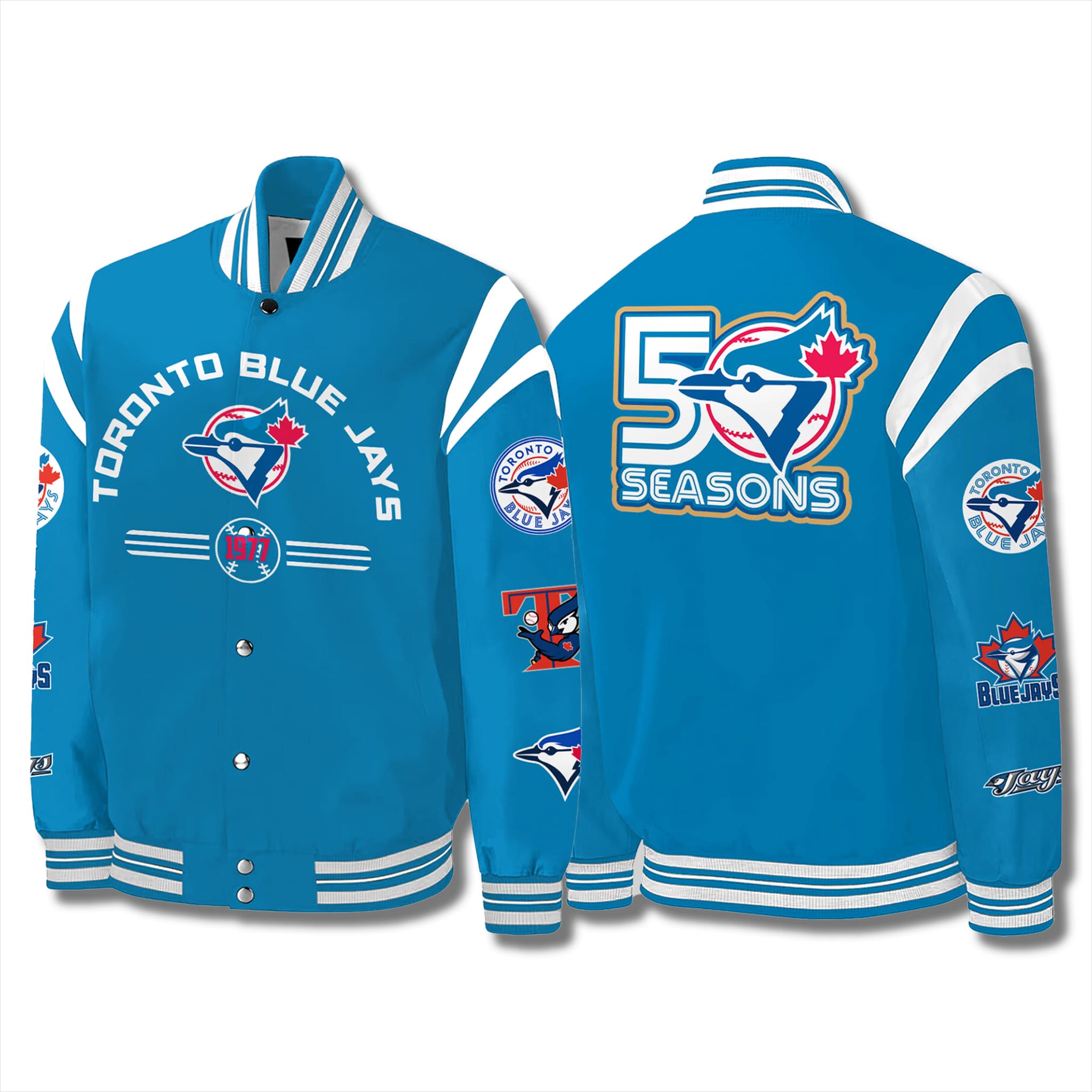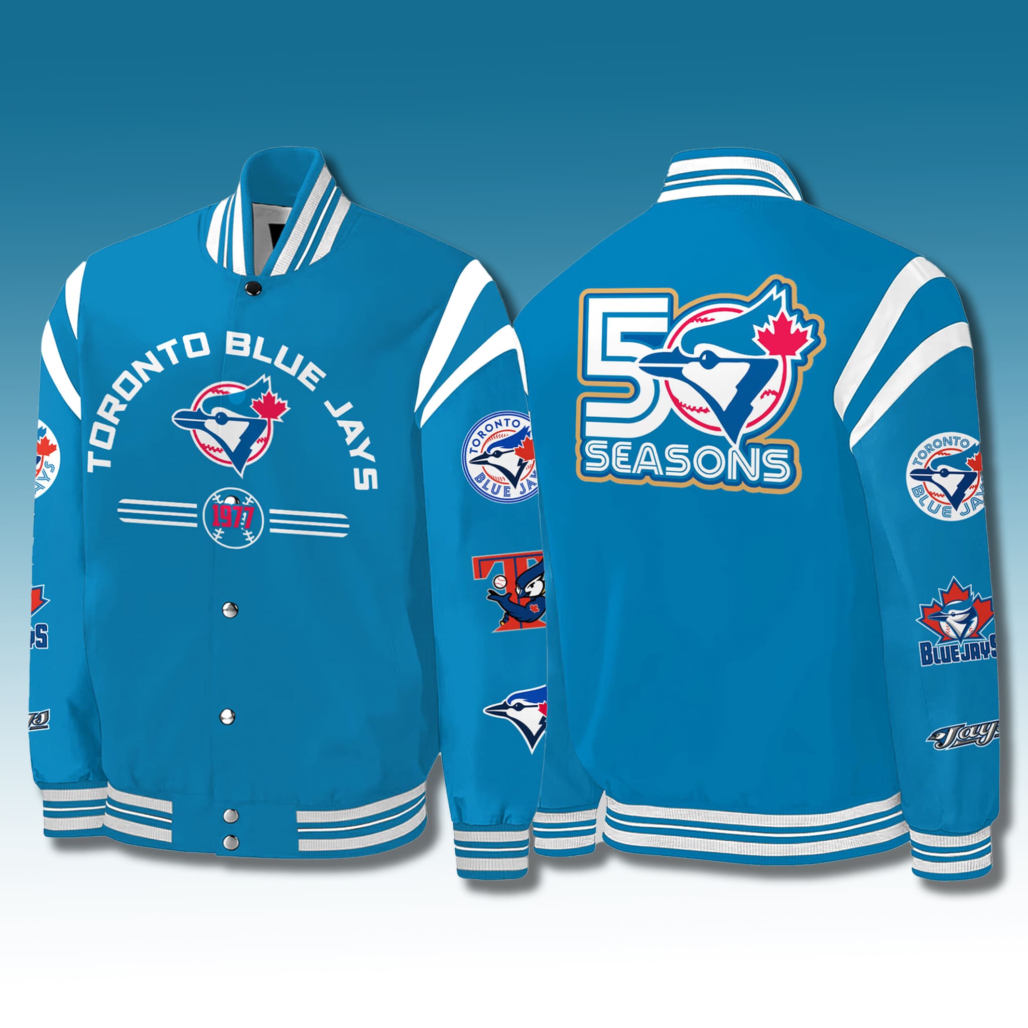 Every detail on this jacket tells a story of faith and loyalty. Own the Blue Jays 50th Anniversary Legacy Jacket to celebrate 50 emotional seasons with the fan community and to fuel the team’s strength for the journeys ahead. Don’t miss this historic keepsake – order now to affirm your love for Canada’s champions!