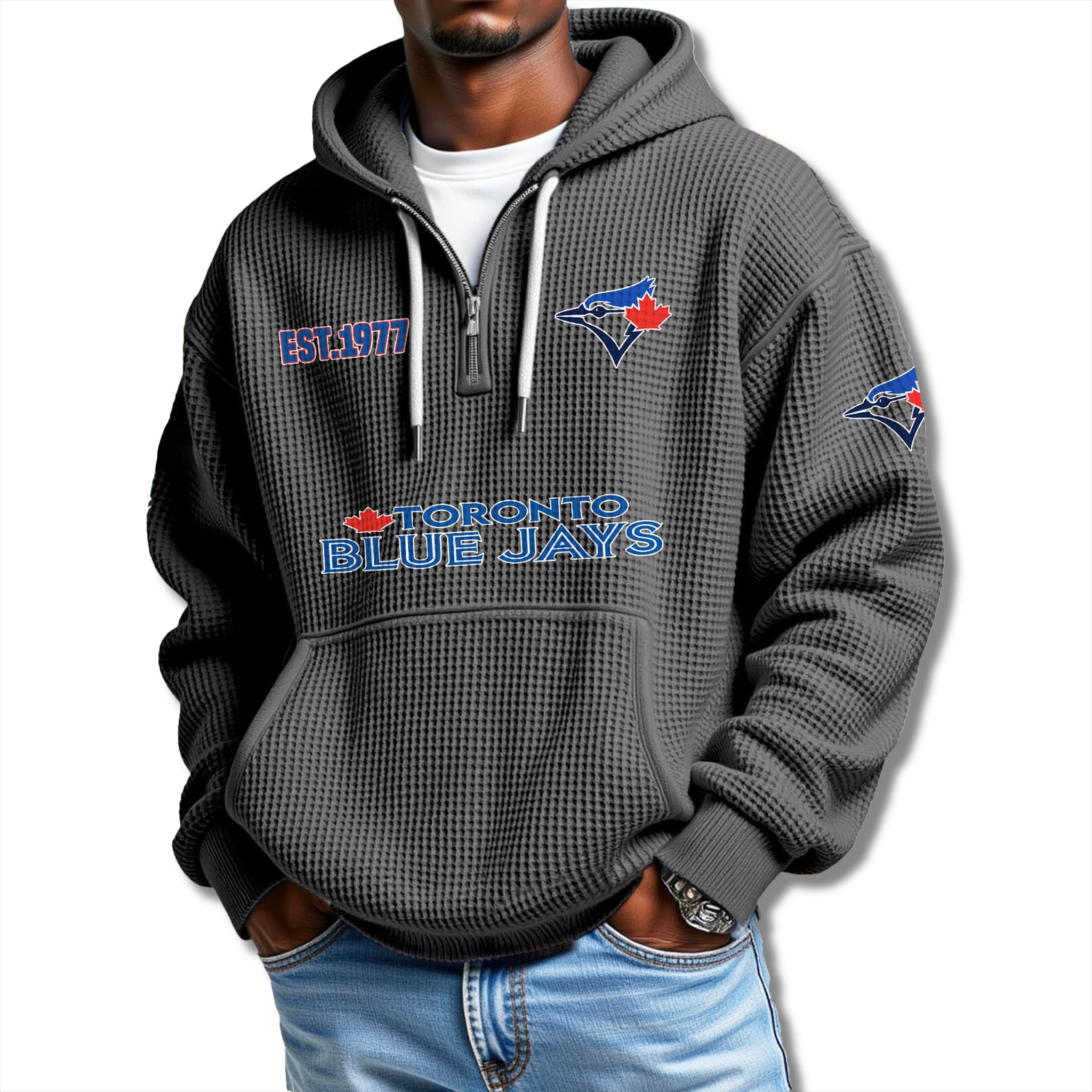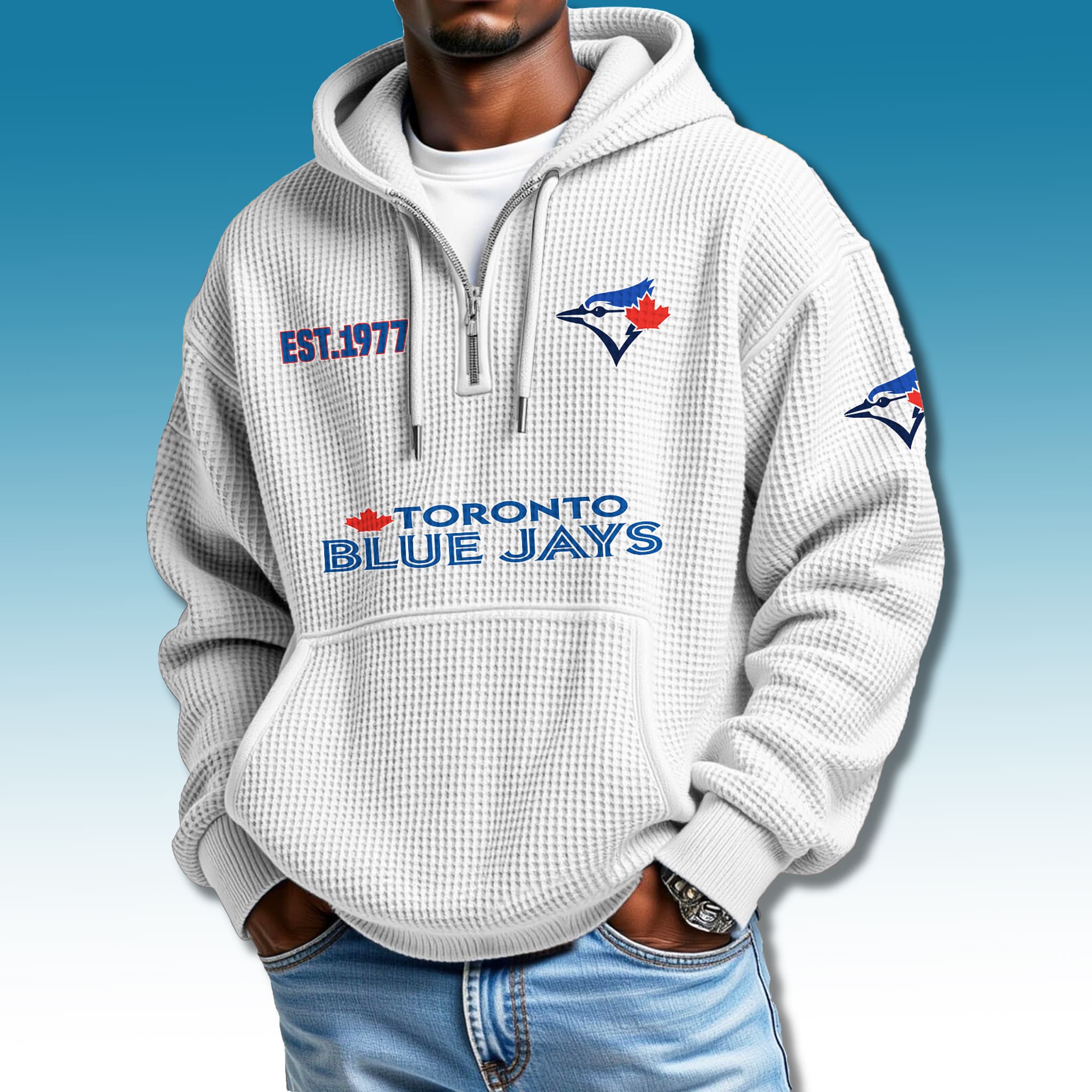 This hoodie features a comfortable quarter-zip style with breathable, warm grey-white waffle knit fabric. Details include the blue jay logo with a red maple leaf, bold Toronto Blue Jays lettering, and EST. 1977, all printed in striking blue tones. Its modern streetwear design makes it easy to pair with jeans or athletic wear.