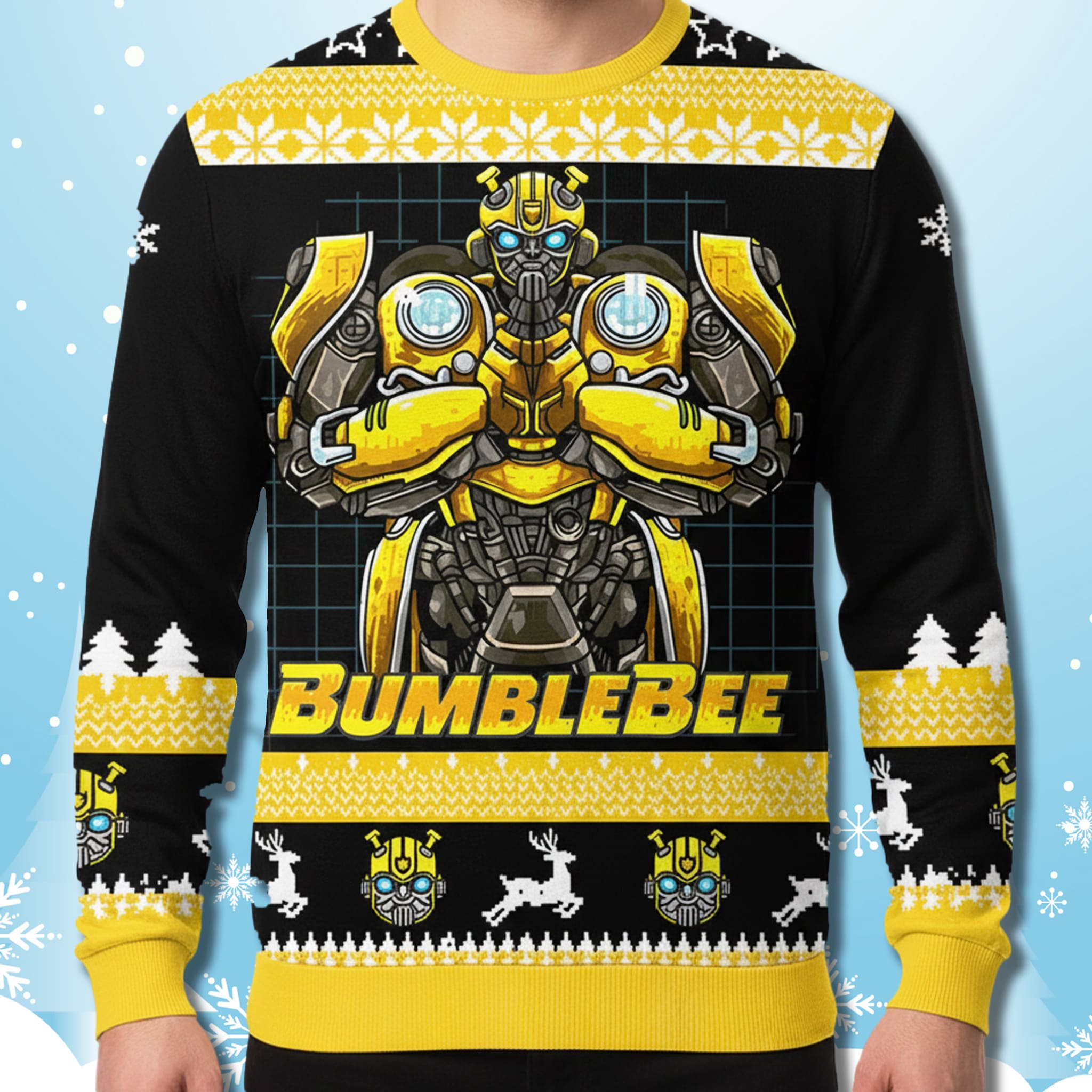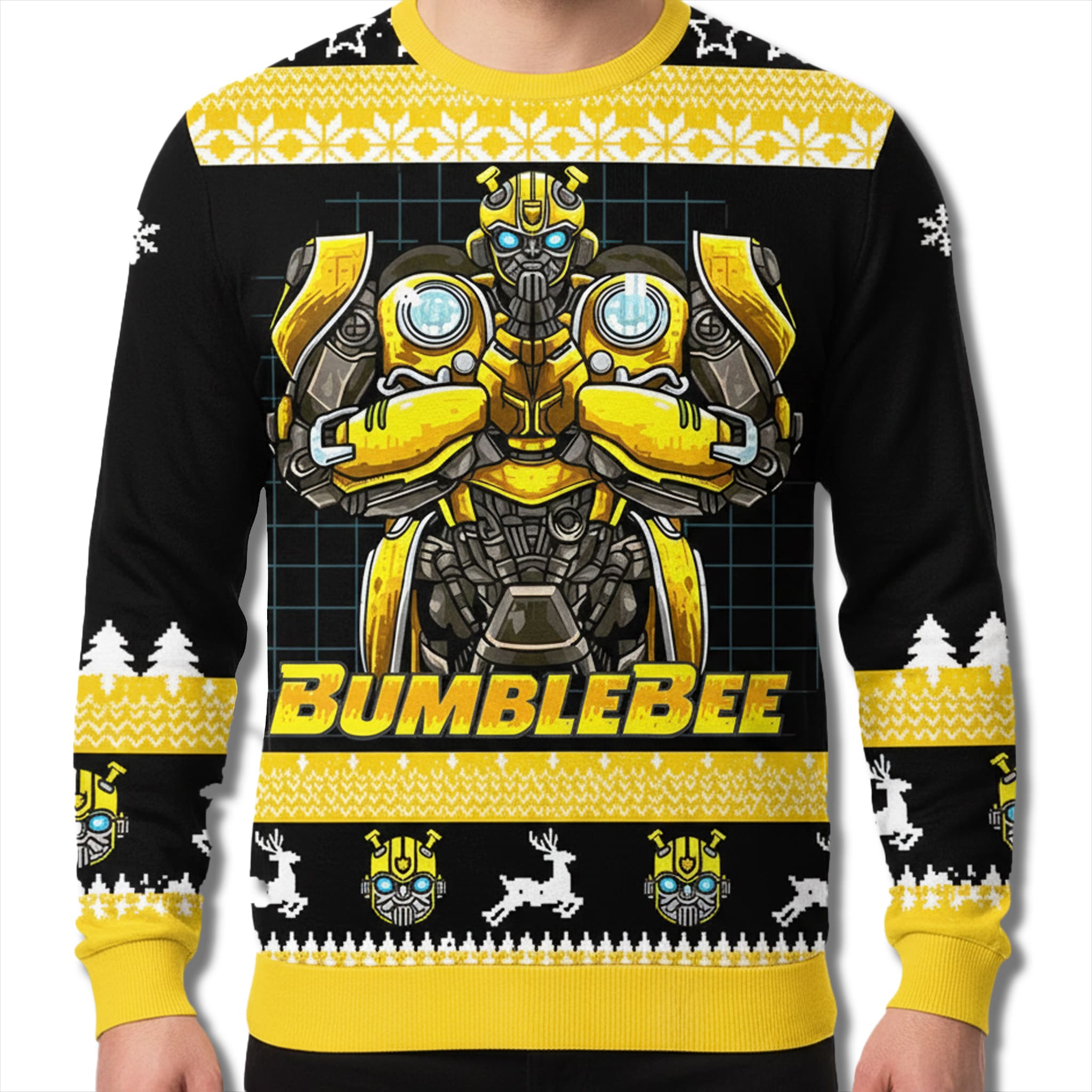The Bumblebee Ugly Sweater features a bold, central illustration of Bumblebee standing confident with arms crossed, set against a sleek black background with vibrant yellow bands. The design cleverly integrates pop culture with tradition by mixing classic snowflakes and reindeer patterns with miniature Transformer head icons and the “BUMBLEBEE” text in a retro font style.