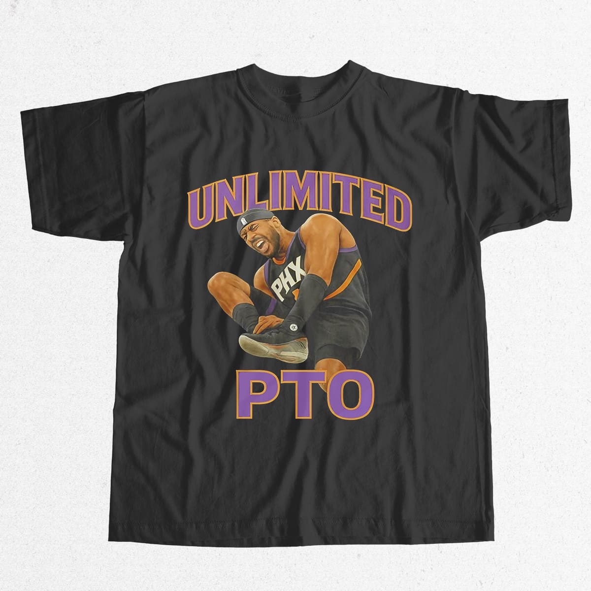 The Unlimited PTO Devin Booker Shirt is designed for fans of Devin Booker, inspired by the viral “Unlimited Paid Time Off” meme that humorously references his frequent injuries in recent seasons — especially in 2025, when he missed several games due to health issues. The design turns a tough situation into lighthearted humor, allowing fans to show their support for Booker while highlighting the star player’s resilience as his team continues to compete strongly in the Western Conference.