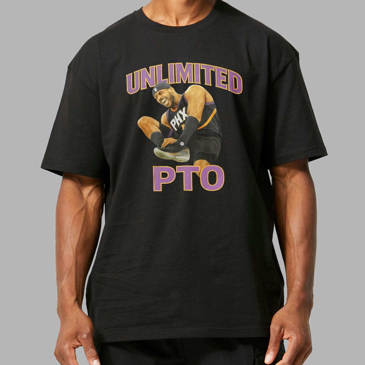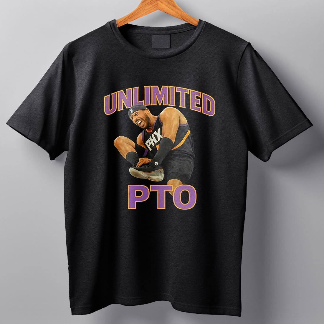 Featuring a humorous take on Devin Booker’s injury history and the viral 2025 “Unlimited PTO” meme, the Devin Booker Unlimited PTO Shirt is the perfect item for Suns fans to show their support. A unique, lighthearted addition to any fan’s wardrobe – order now to join the fun!