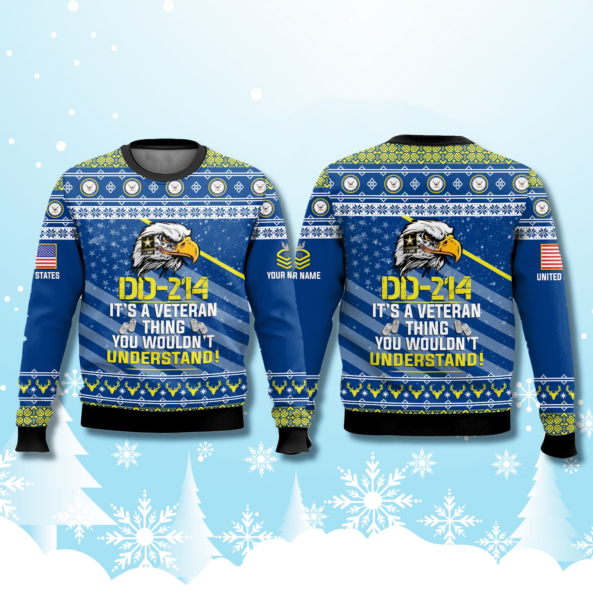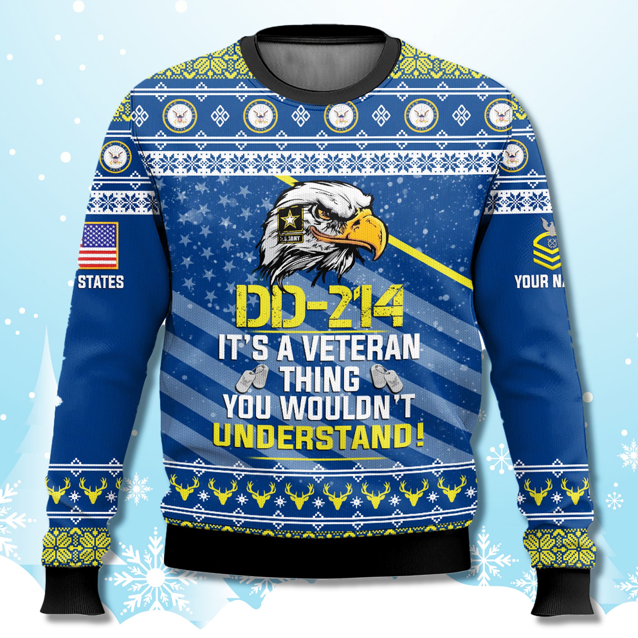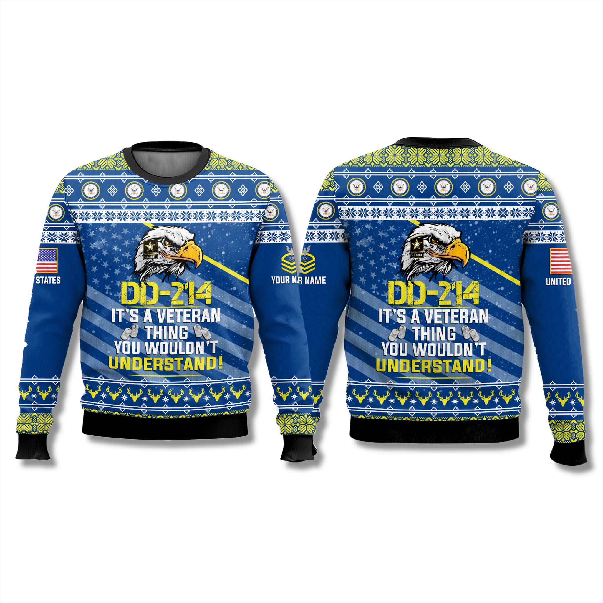 The front boldly displays a fierce eagle emblem with integrated stars and stripes, flanked by the DD-214 certificate motif and the cheeky veteran slogan. Repeating accents include dog tags, anchor seals, and prancing reindeer motifs woven into Nordic-inspired borders for that signature ugly sweater edge.