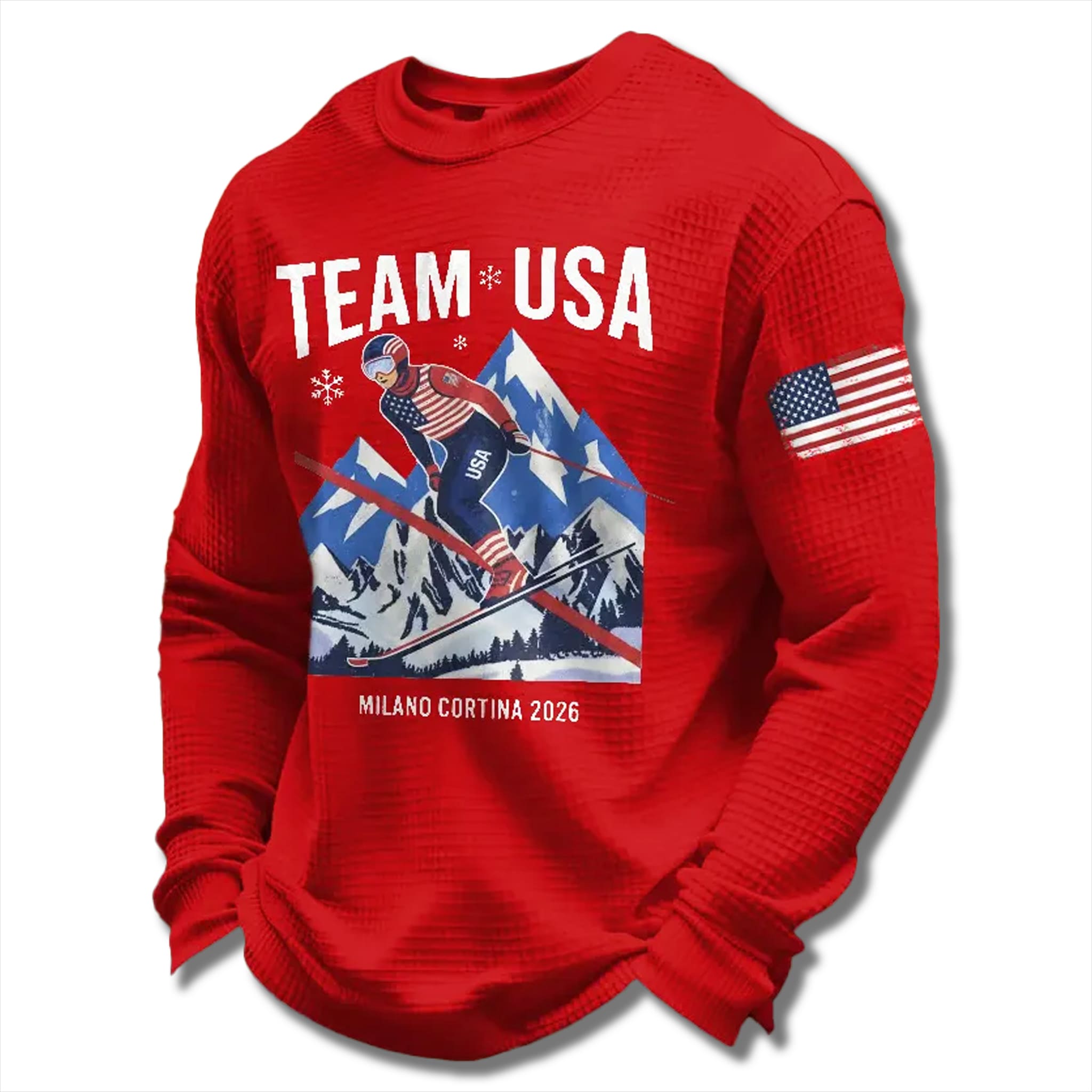 The USA Ski Team Italian Winter 2026 Waffle Sweater. More than just a warm winter garment, this sweater carries the ambition of victory and the pride of an unbreakable sporting spirit. Inspired by the upcoming elite competitions in Italy, it connects you directly to the pulse of the Winter Games – turning everyday moments into part of sports history.