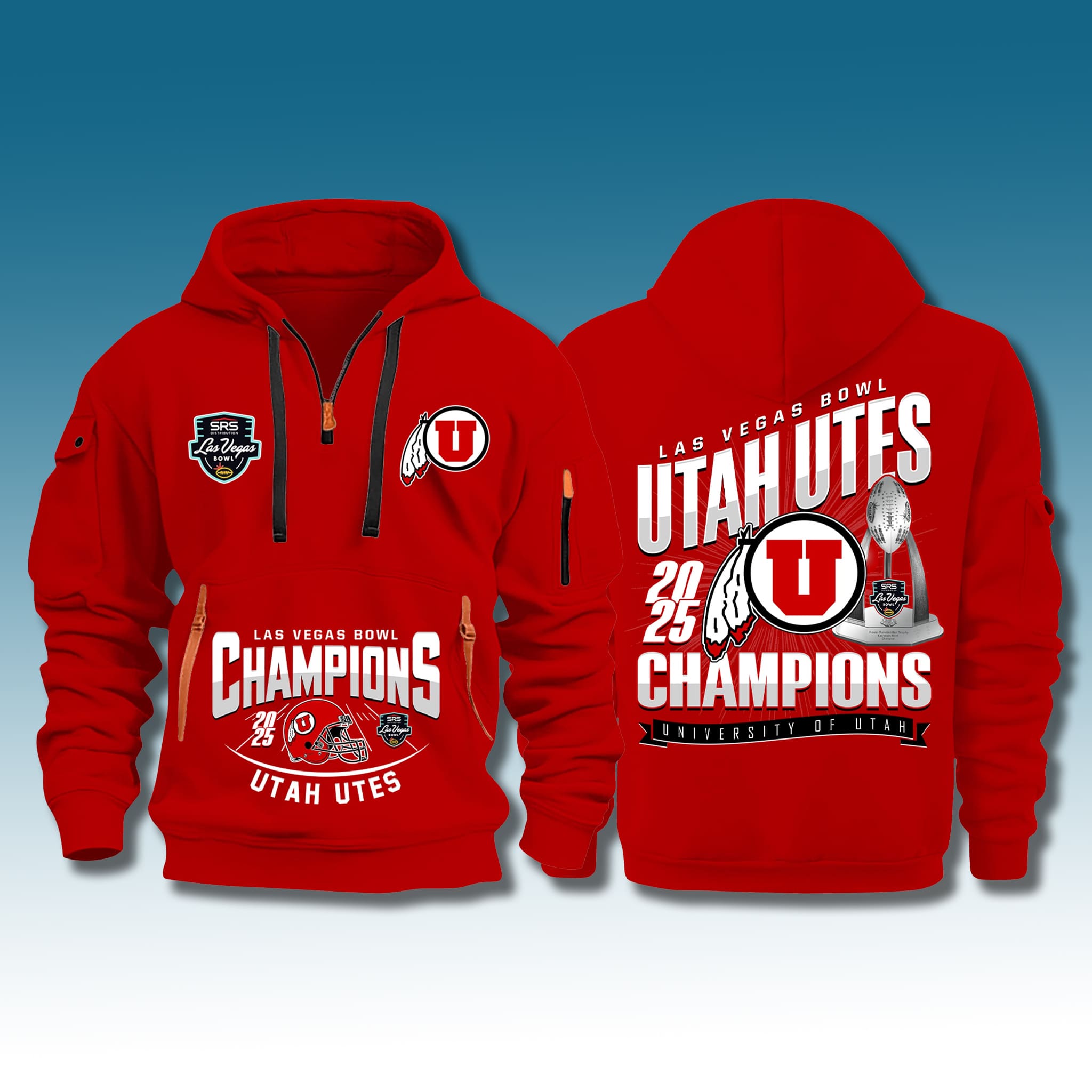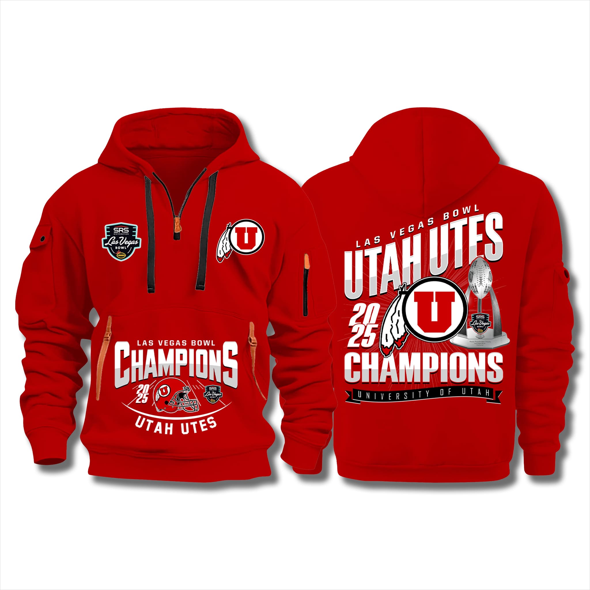 This hoodie features a quarter-zip design in Utah’s signature red, making it easy to style for winter wear. The front displays large white “Las Vegas Bowl Champions” lettering paired with the Utes logo and the SRS Distribution Las Vegas Bowl patch. The back showcases “Utah Utes 2025 Champions” alongside a shimmering bowl trophy, delivering a fashionable varsity look full of energy and pride.