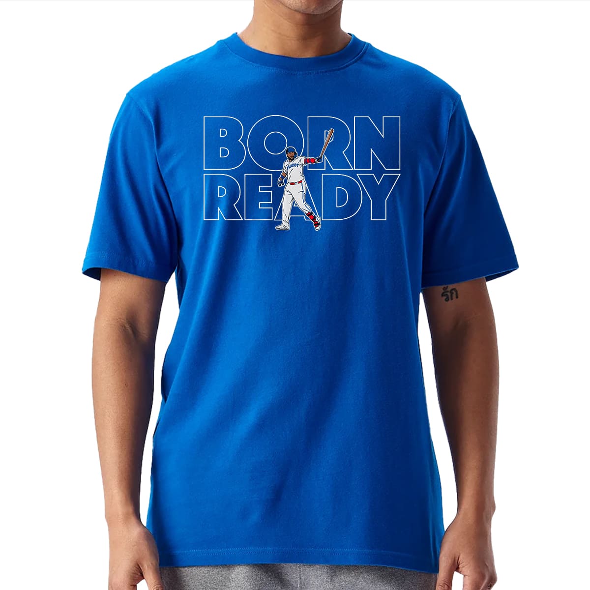 The design surrounds a dynamic white silhouette of Guerrero swinging a bat in a blue jersey on a deep royal blue cotton canvas, framed by the words “BORN READY” in a curved font, neatly outlined in white, creating a timeless, inspirational image that easily inspires game days or everyday work.