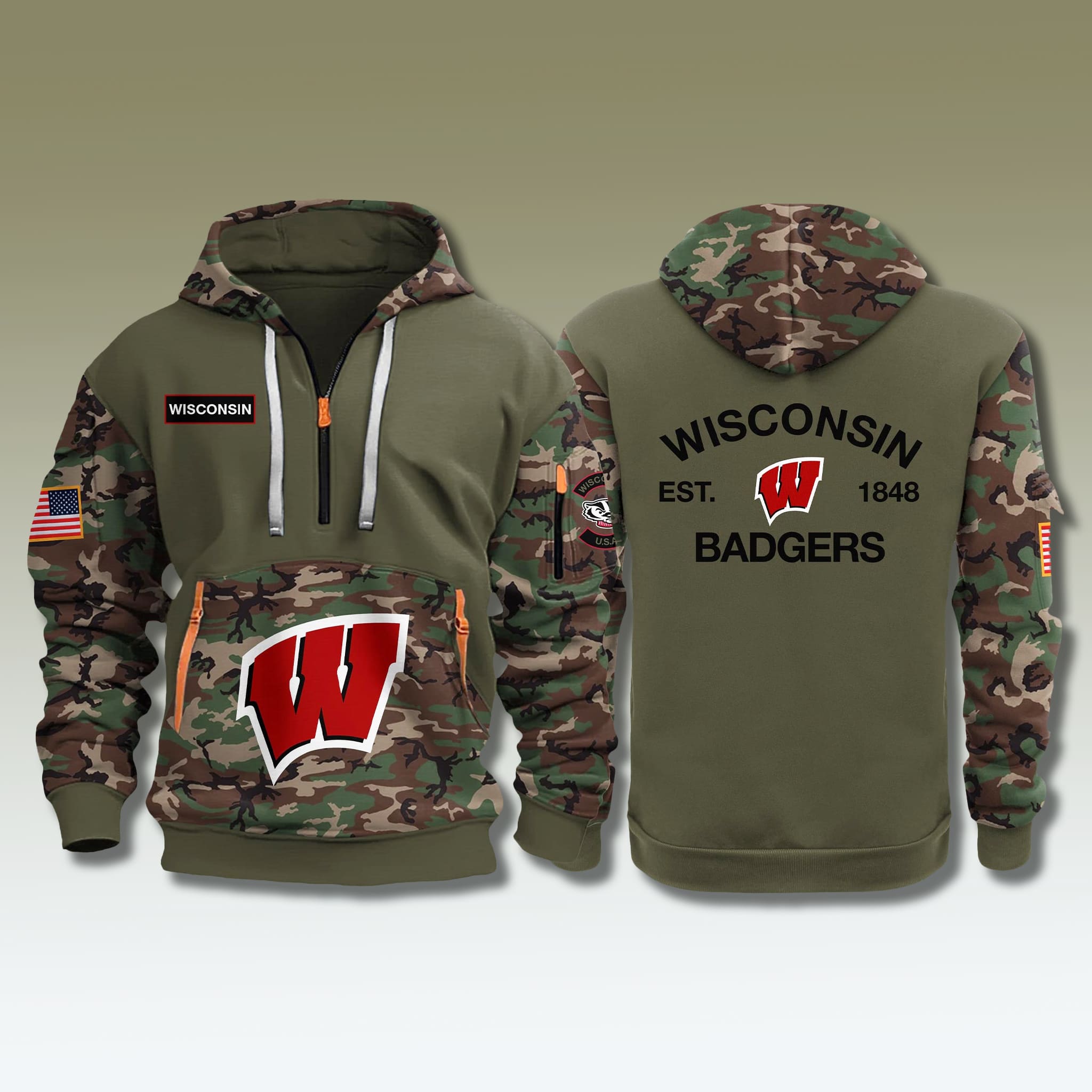 The Wisconsin Badgers Military Camo 2025 Quarter Zip Hoodie is a must-have item for fans of Wisconsin athletics and the university’s proud sports legacy. Created to honor the long-standing tradition of the Badgers since 1848, this hoodie perfectly blends school pride with a patriotic military-inspired design – allowing you to show unwavering support for your team in every game.
