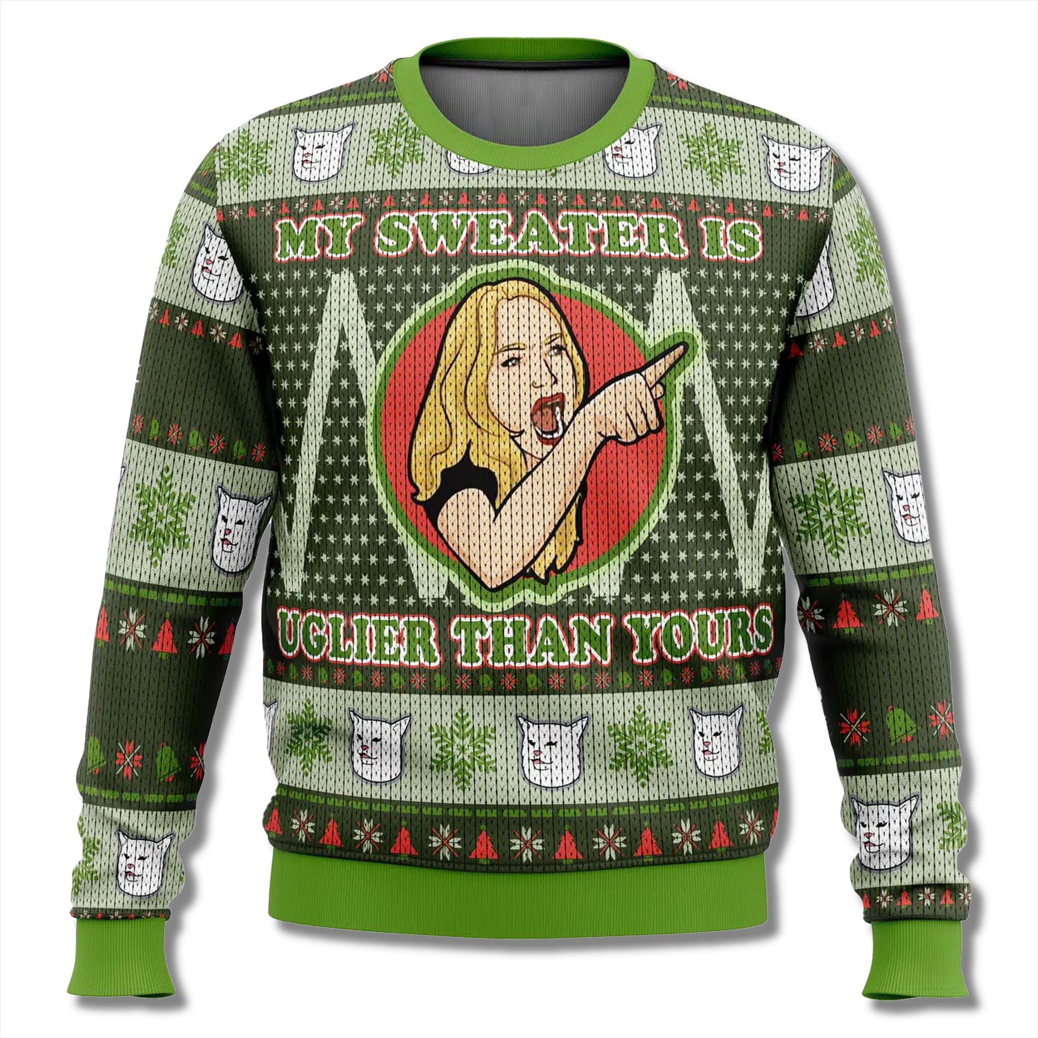 Embrace the chaos of the holidays and internet fame with the Woman Yelling At Cat Meme Ugly Christmas Sweater. This hilarious garment is the ultimate weapon for any ugly sweater competition, allowing you to loudly and proudly declare the phrase emblazoned across the front: “MY SWEATER IS UGLIER THAN YOURS.” This viral design perfectly captures the infamous meme (featuring the screaming woman and Smudge the Cat), ensuring you are instantly recognizable.