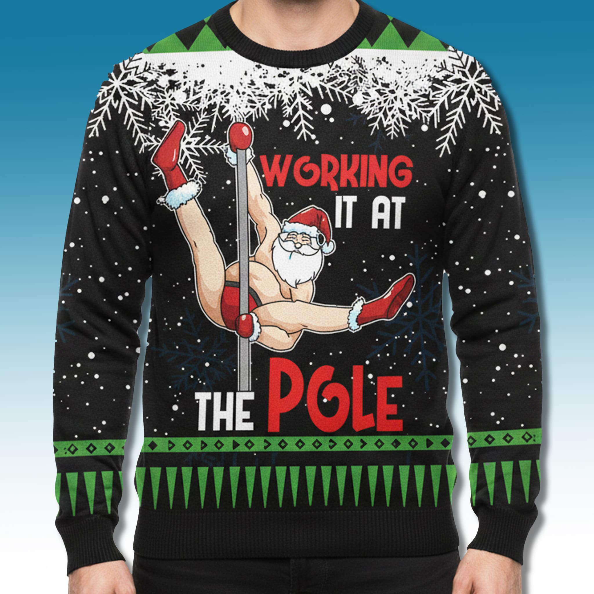 Add the Santa Working It At The Pole Ugly Sweater to your holiday wardrobe and turn any gathering into a festive celebration full of laughs! Order now for fast shipping and be ready to steal the show this Christmas season.